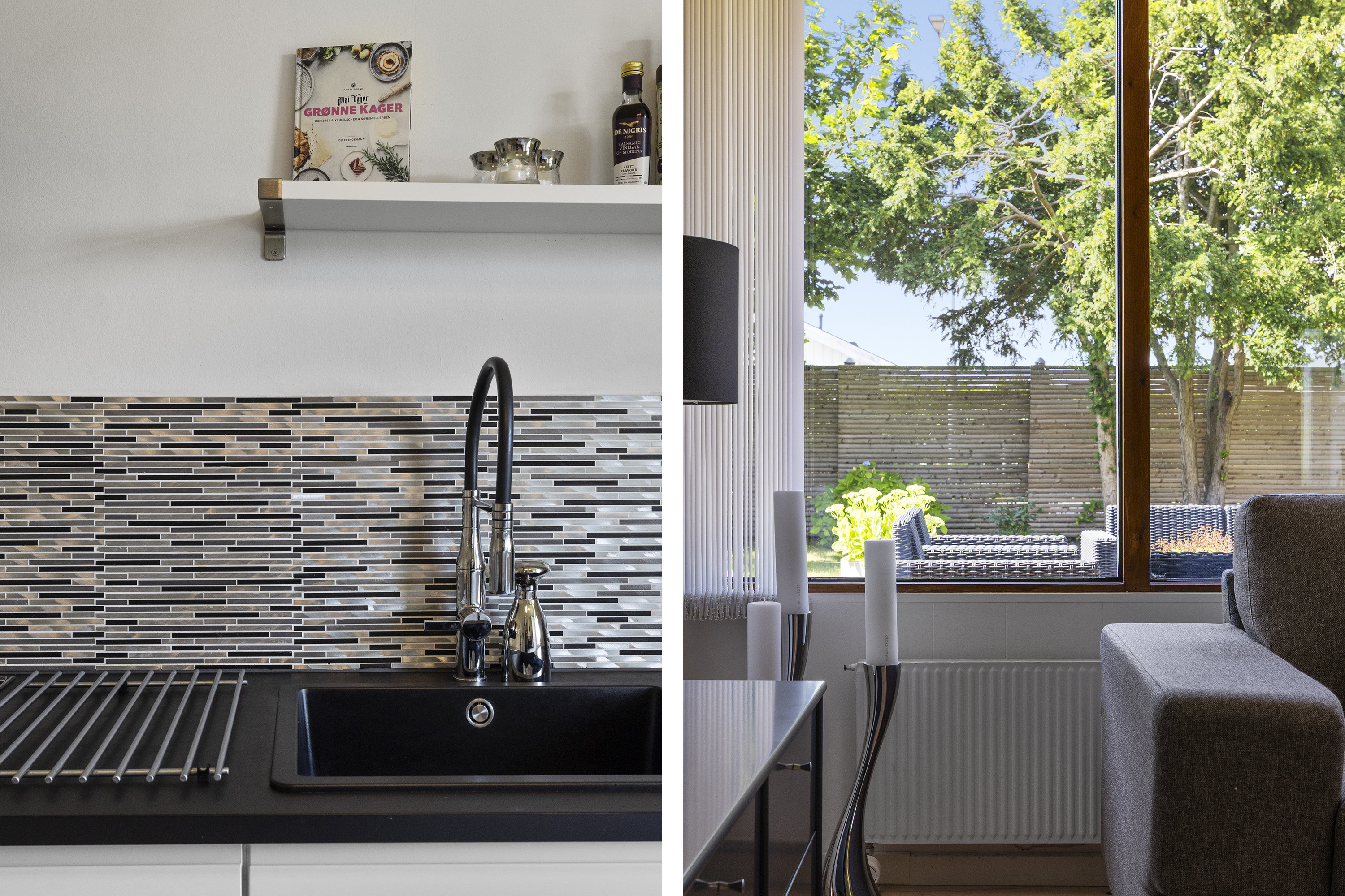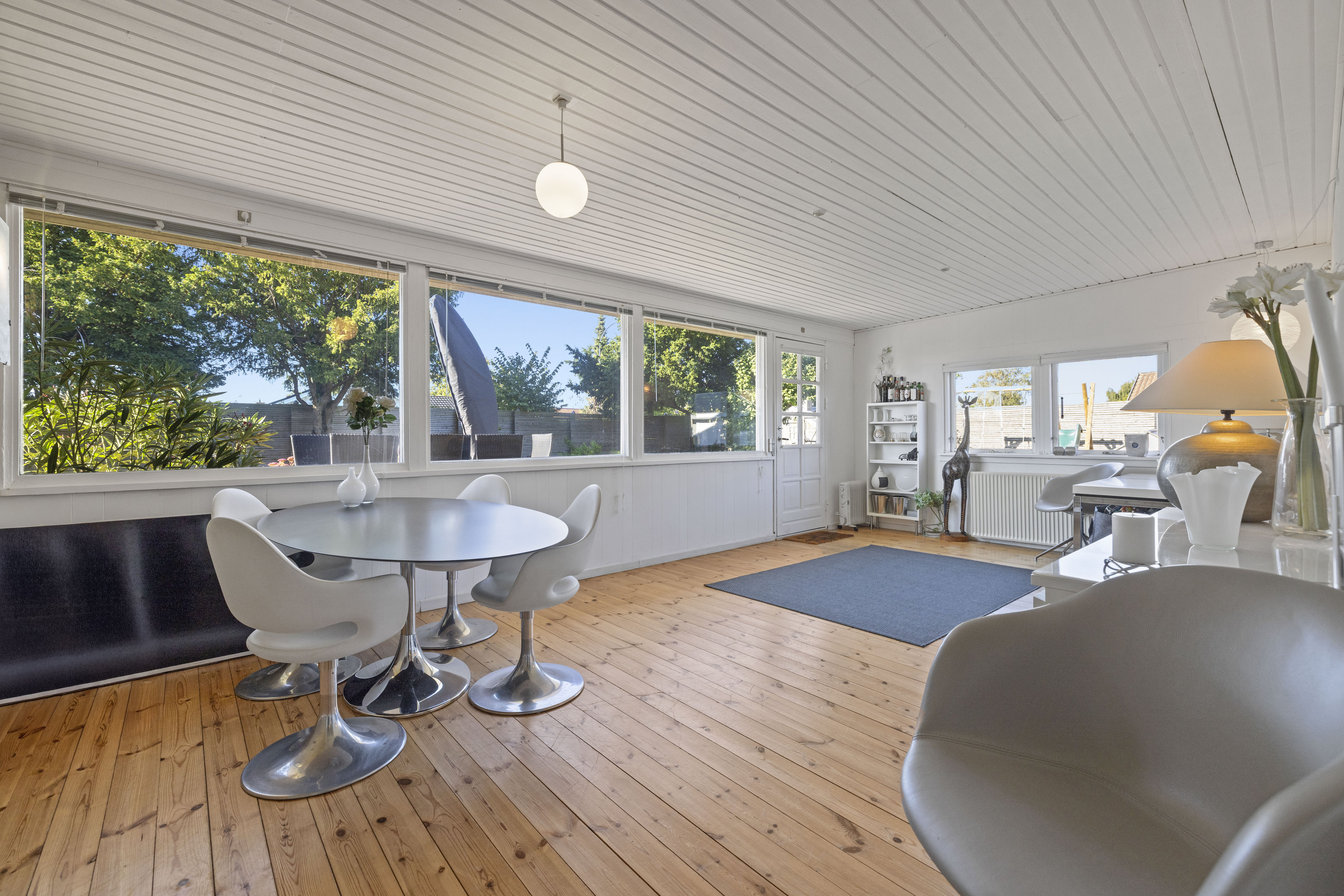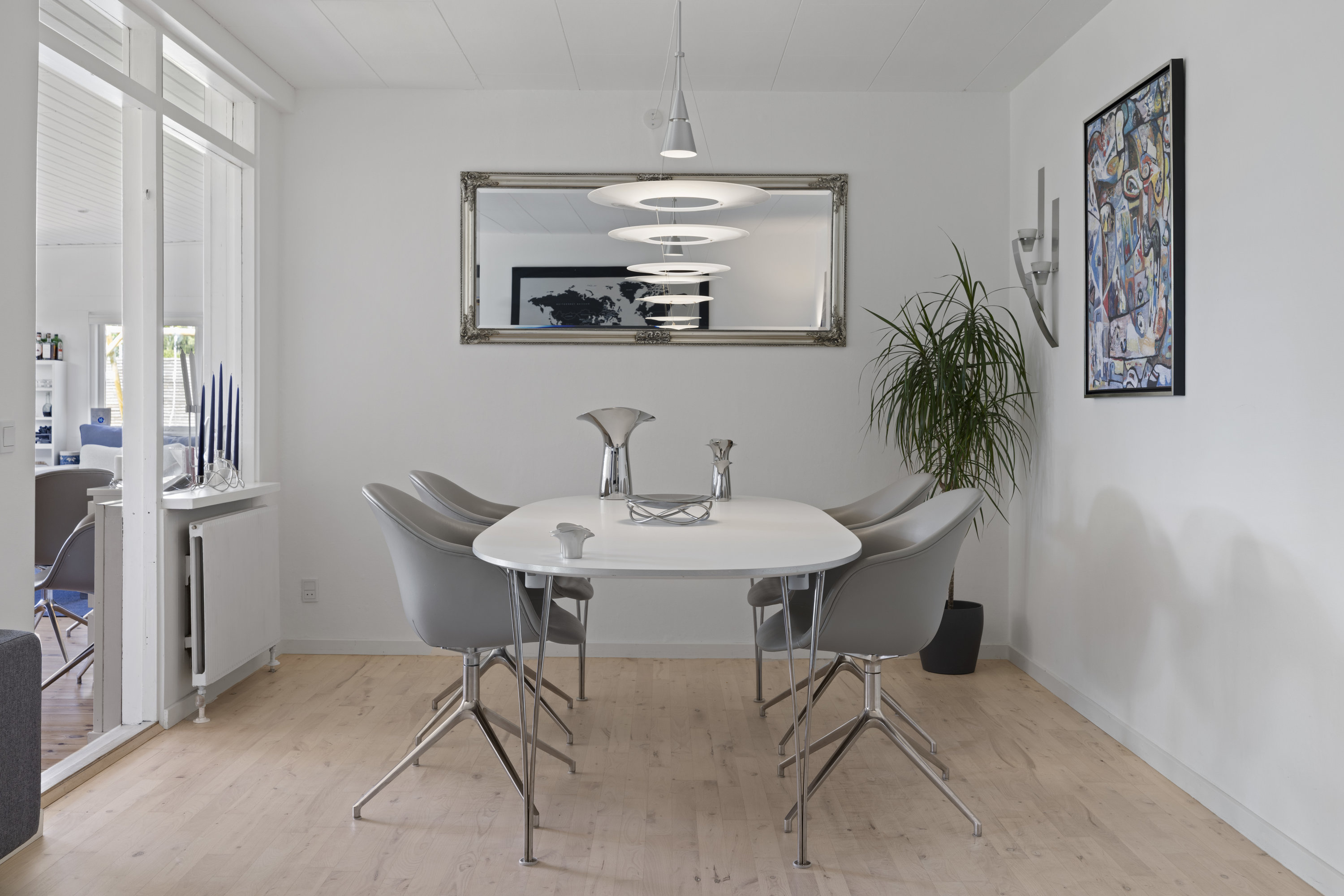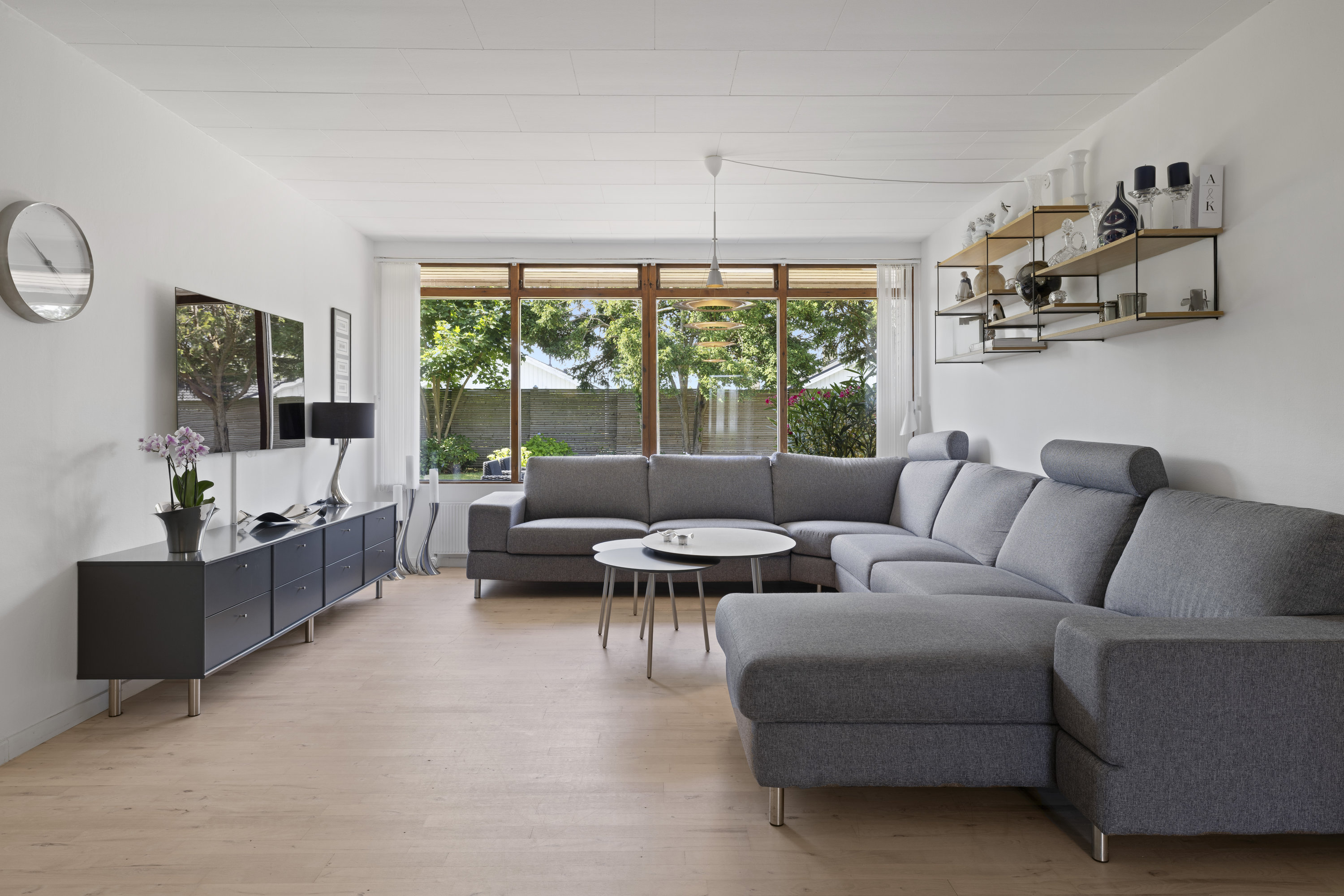 Planløsningen er både enkel og gennemtænkt – præcis som et hjem skal være. To gode værelser ligger samlet i en separat afdeling, mens badeværelset fremstår lækkert og moderne med rainshower bag glas og en rolig farvepalet. Et ekstra gæstetoilet fuldender komforten. Spisekøkkenet er nyere, stilrent og grebsfrit med flotte vægfliser – og plads til hverdagsfortællinger ved bordet. Den indbyggede kaffemaskine står klar med dagens første duft, og ovnen med airfryer-funktion gør det let at forkæle både hverdag og weekend med sprøde favoritter. Vinkelstuen rummer let både spisebord og sofahjørne – et indbydende fællesrum, hvor lyset flyder frit gennem vinduerne. Udestuen ligger i forlængelse heraf, under husets tag – og danner en hyggelig krog, der lige så let kan forvandles til ekstra stue, kontor eller noget helt tredje. Overalt er gulvene flotte og gennemgående – og det hele hænger sammen med en naturlig lethed.