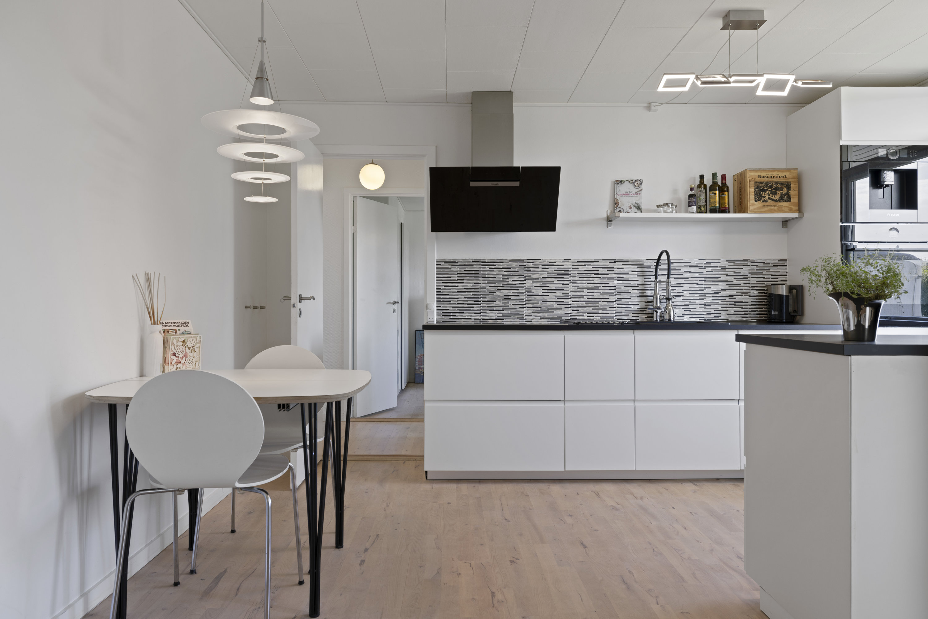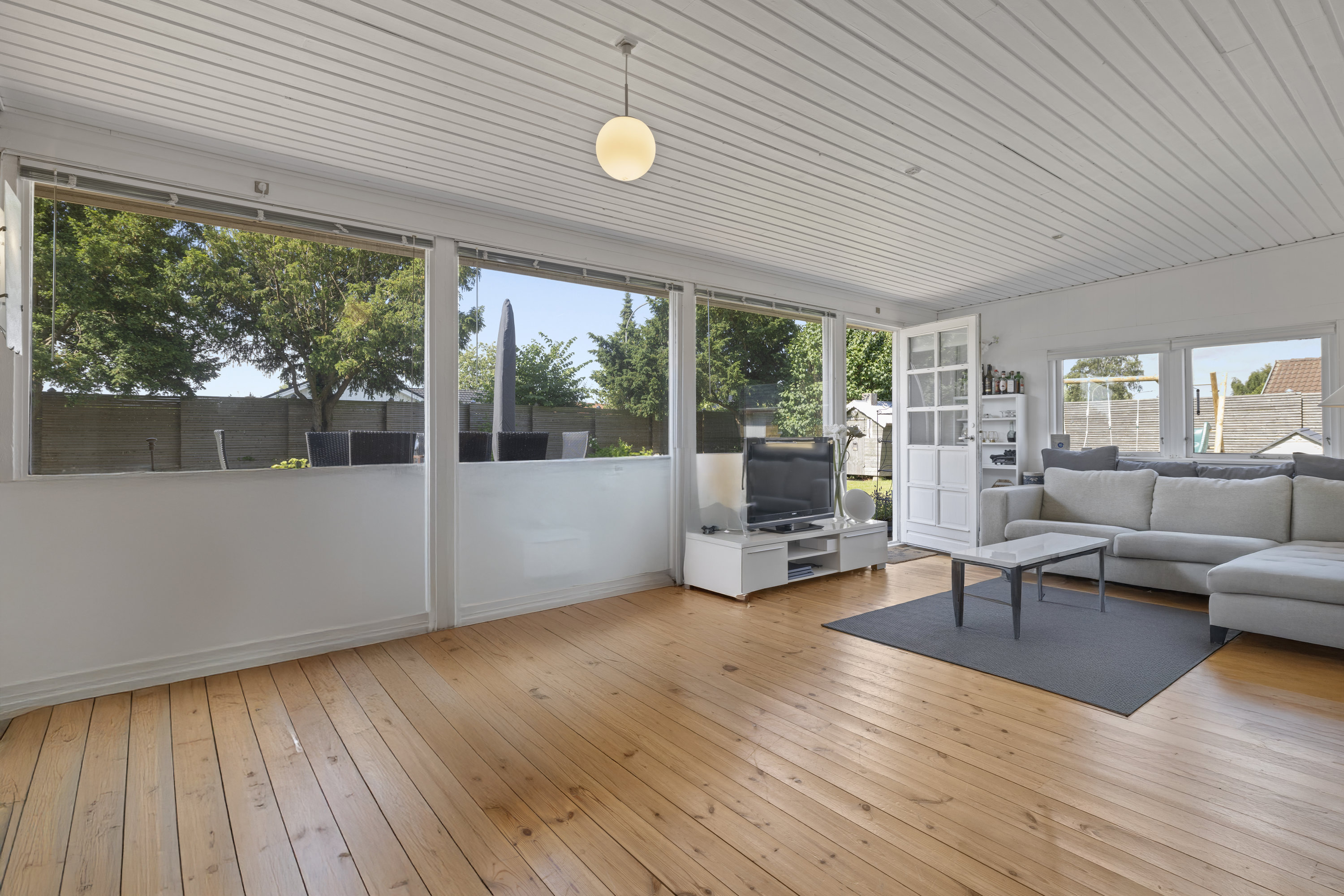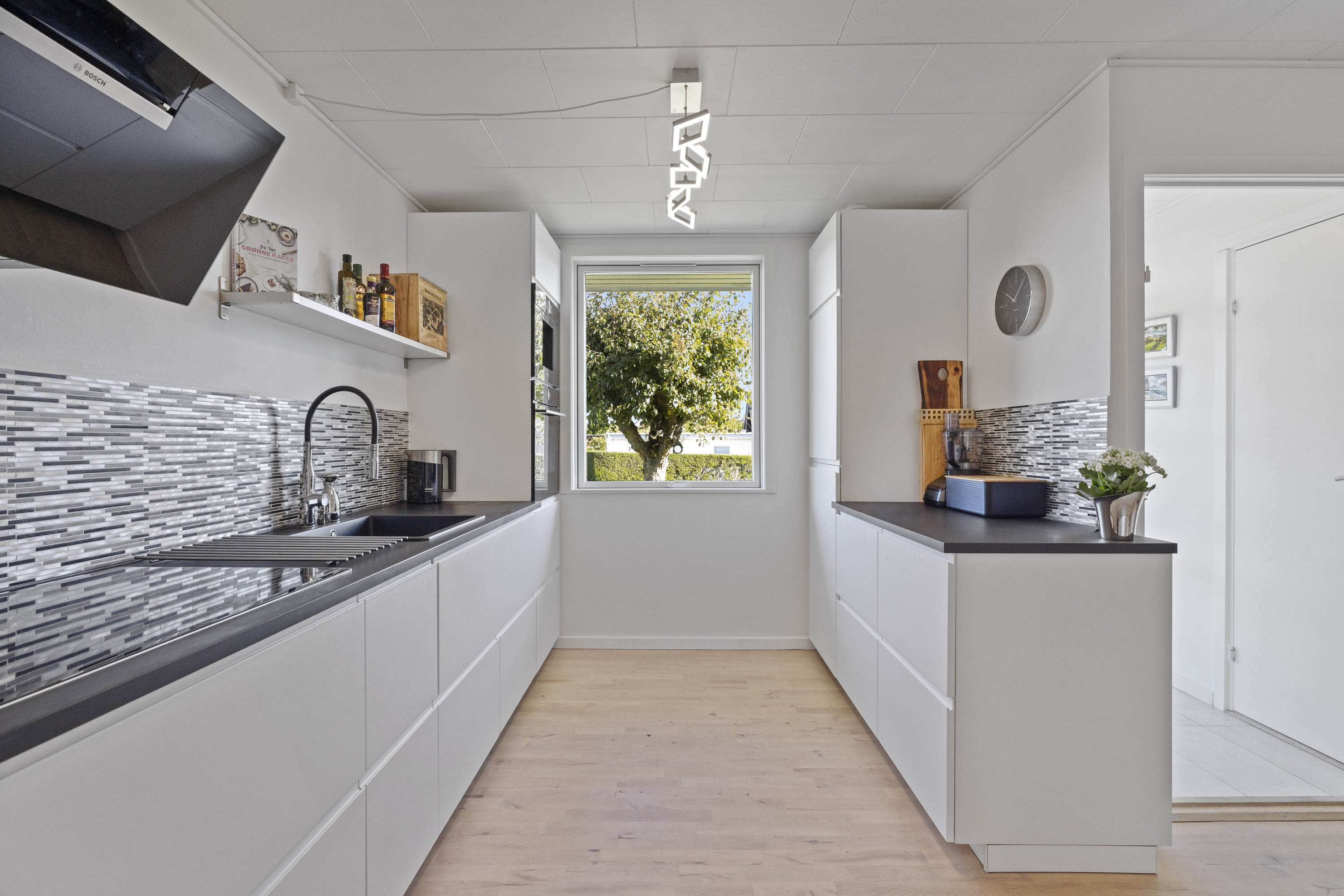 Planløsningen er både enkel og gennemtænkt – præcis som et hjem skal være. To gode værelser ligger samlet i en separat afdeling, mens badeværelset fremstår lækkert og moderne med rainshower bag glas og en rolig farvepalet. Et ekstra gæstetoilet fuldender komforten. Spisekøkkenet er nyere, stilrent og grebsfrit med flotte vægfliser – og plads til hverdagsfortællinger ved bordet. Den indbyggede kaffemaskine står klar med dagens første duft, og ovnen med airfryer-funktion gør det let at forkæle både hverdag og weekend med sprøde favoritter. Vinkelstuen rummer let både spisebord og sofahjørne – et indbydende fællesrum, hvor lyset flyder frit gennem vinduerne. Udestuen ligger i forlængelse heraf, under husets tag – og danner en hyggelig krog, der lige så let kan forvandles til ekstra stue, kontor eller noget helt tredje. Overalt er gulvene flotte og gennemgående – og det hele hænger sammen med en naturlig lethed.
