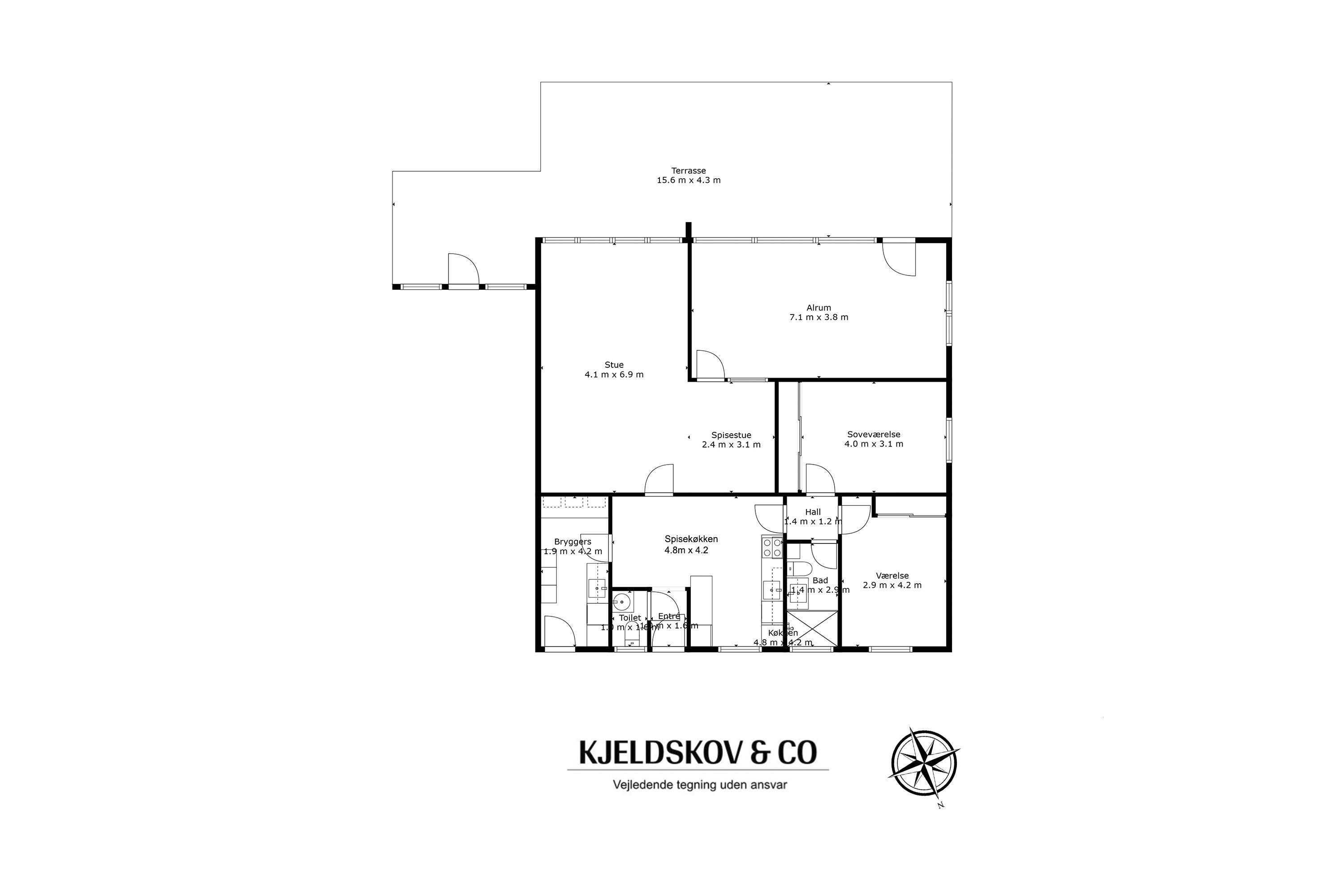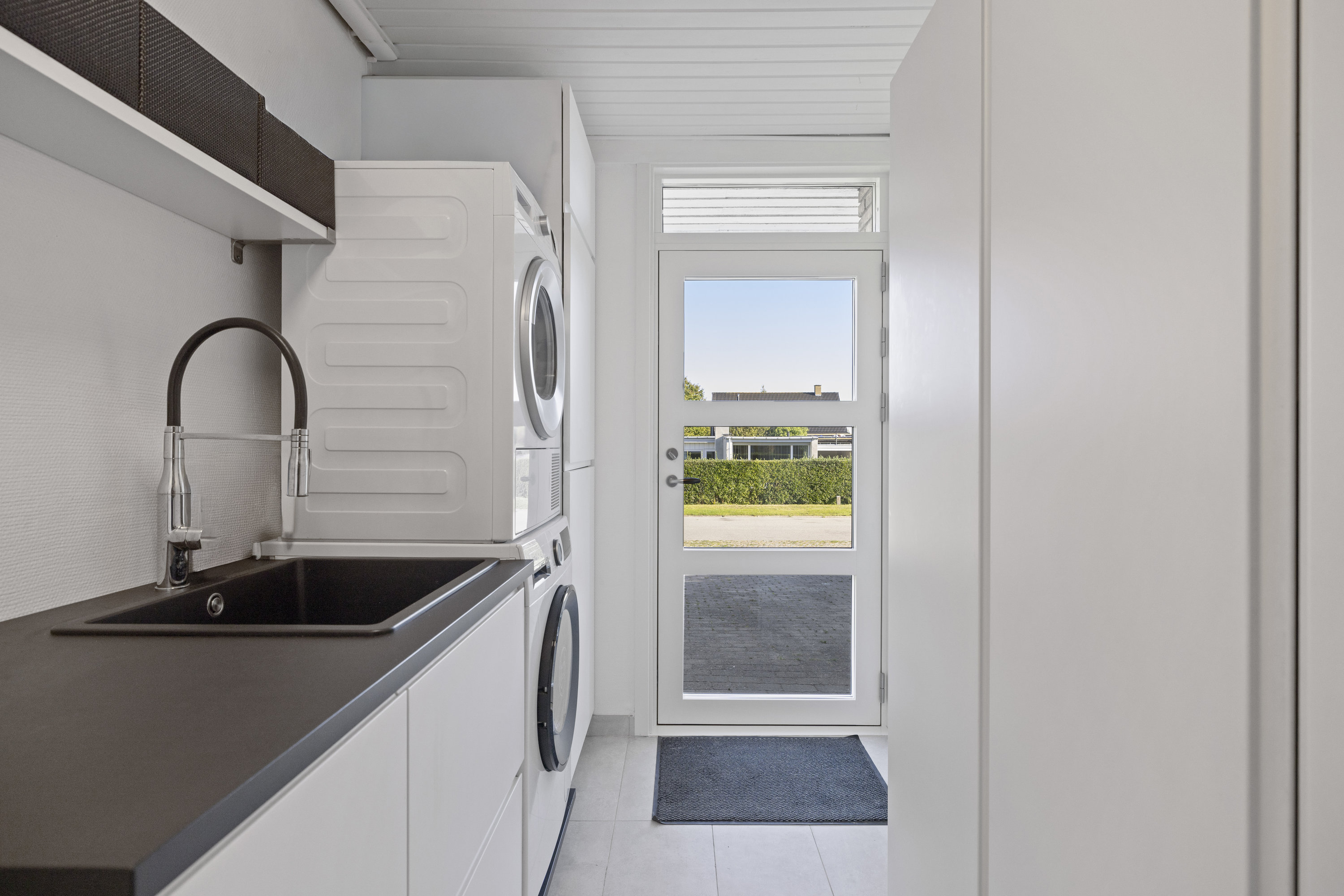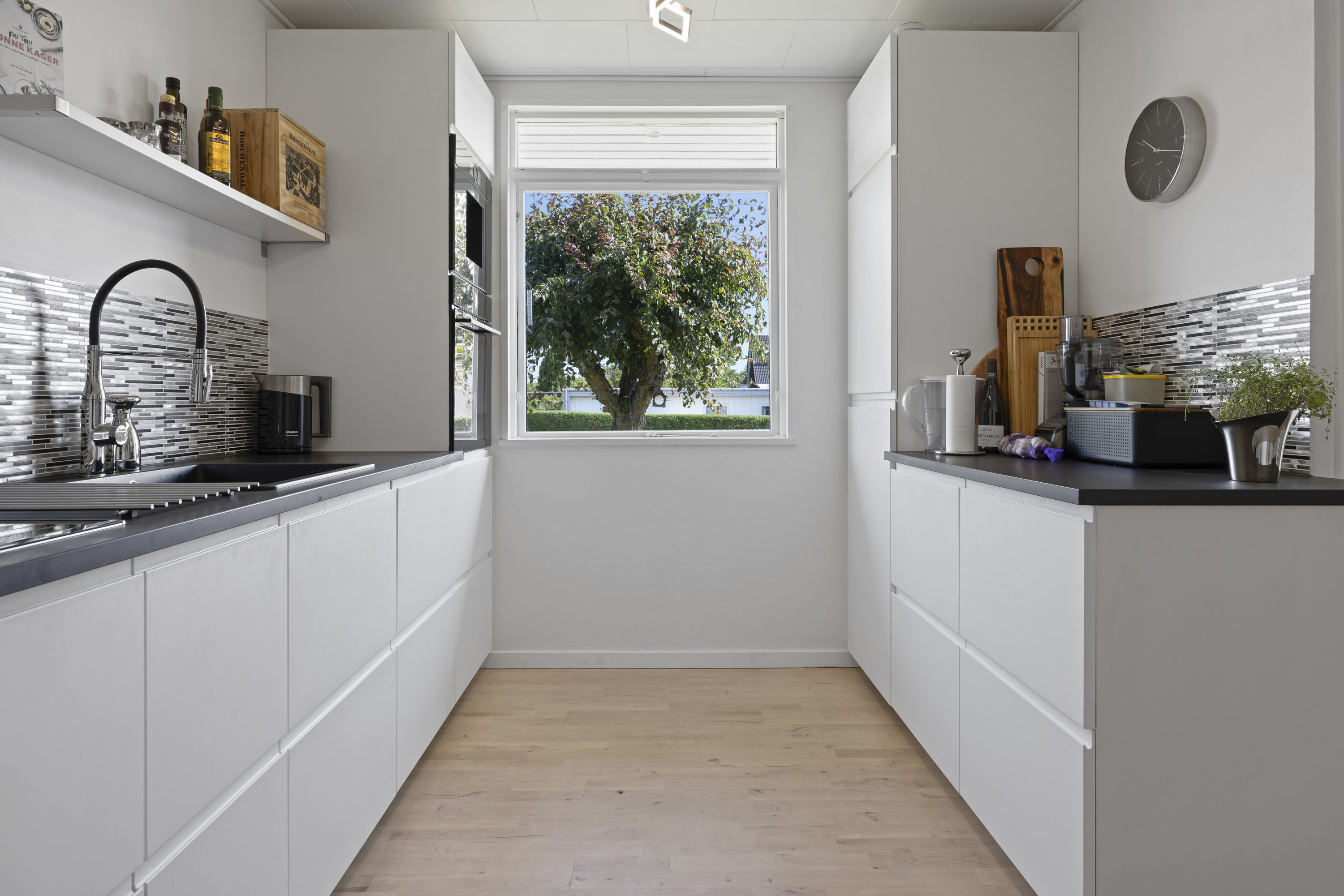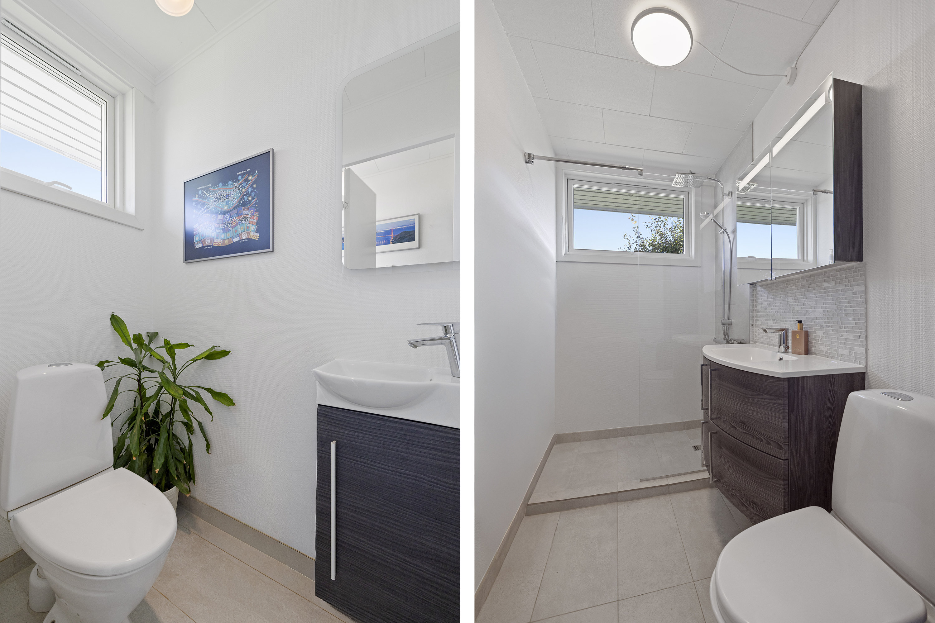 Planløsningen er både enkel og gennemtænkt – præcis som et hjem skal være. To gode værelser ligger samlet i en separat afdeling, mens badeværelset fremstår lækkert og moderne med rainshower bag glas og en rolig farvepalet. Et ekstra gæstetoilet fuldender komforten. Spisekøkkenet er nyere, stilrent og grebsfrit med flotte vægfliser – og plads til hverdagsfortællinger ved bordet. Den indbyggede kaffemaskine står klar med dagens første duft, og ovnen med airfryer-funktion gør det let at forkæle både hverdag og weekend med sprøde favoritter. Vinkelstuen rummer let både spisebord og sofahjørne – et indbydende fællesrum, hvor lyset flyder frit gennem vinduerne. Udestuen ligger i forlængelse heraf, under husets tag – og danner en hyggelig krog, der lige så let kan forvandles til ekstra stue, kontor eller noget helt tredje. Overalt er gulvene flotte og gennemgående – og det hele hænger sammen med en naturlig lethed.