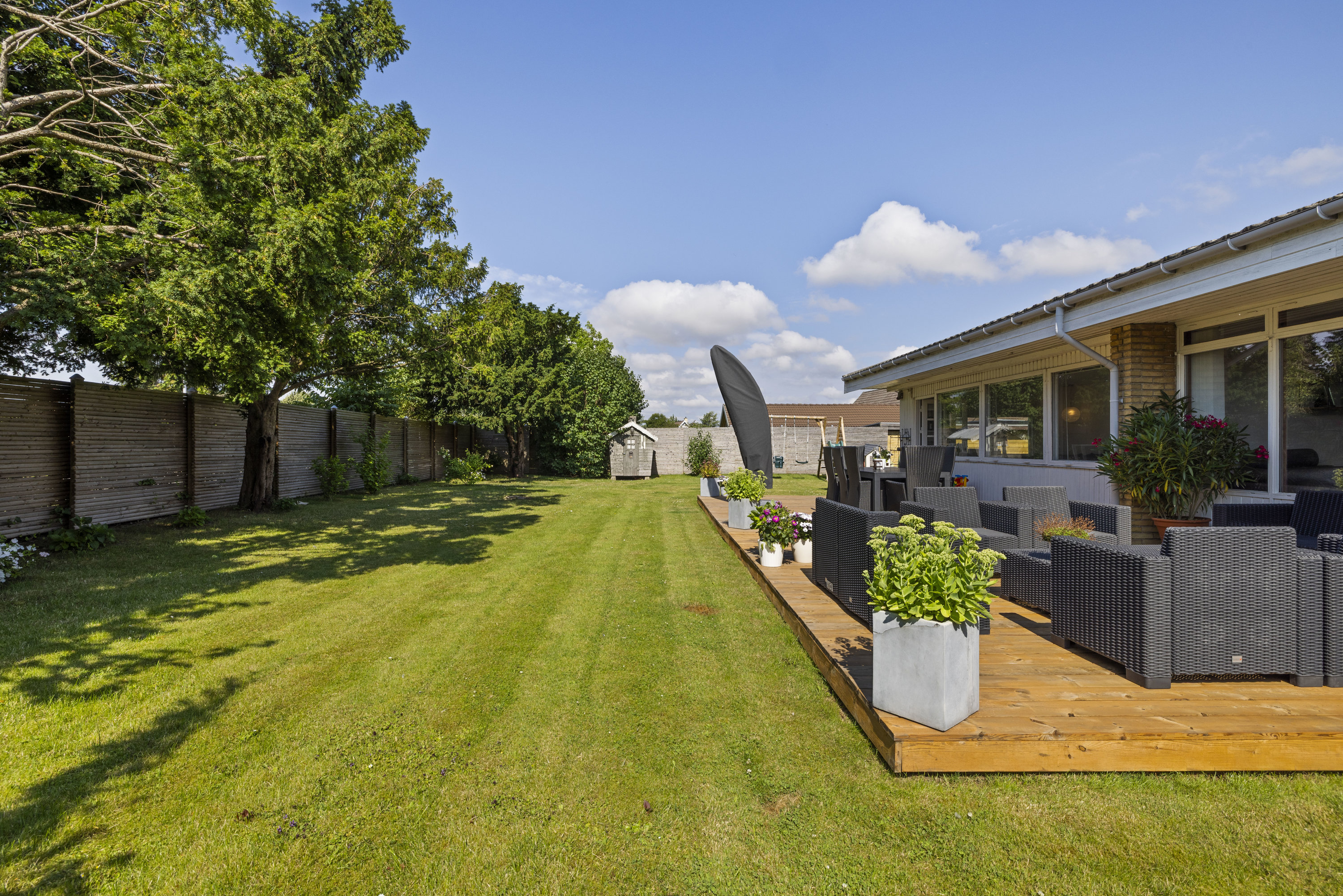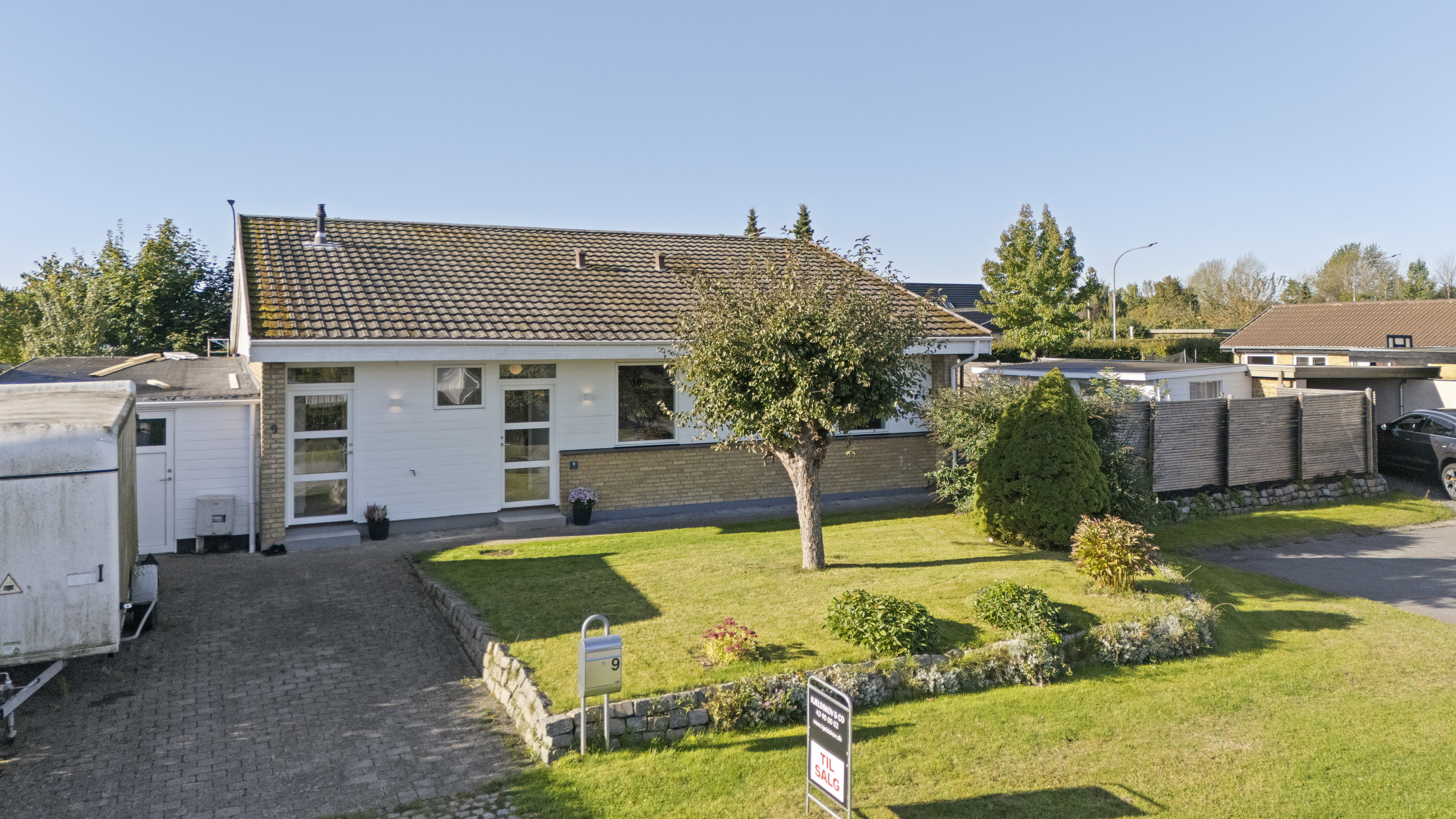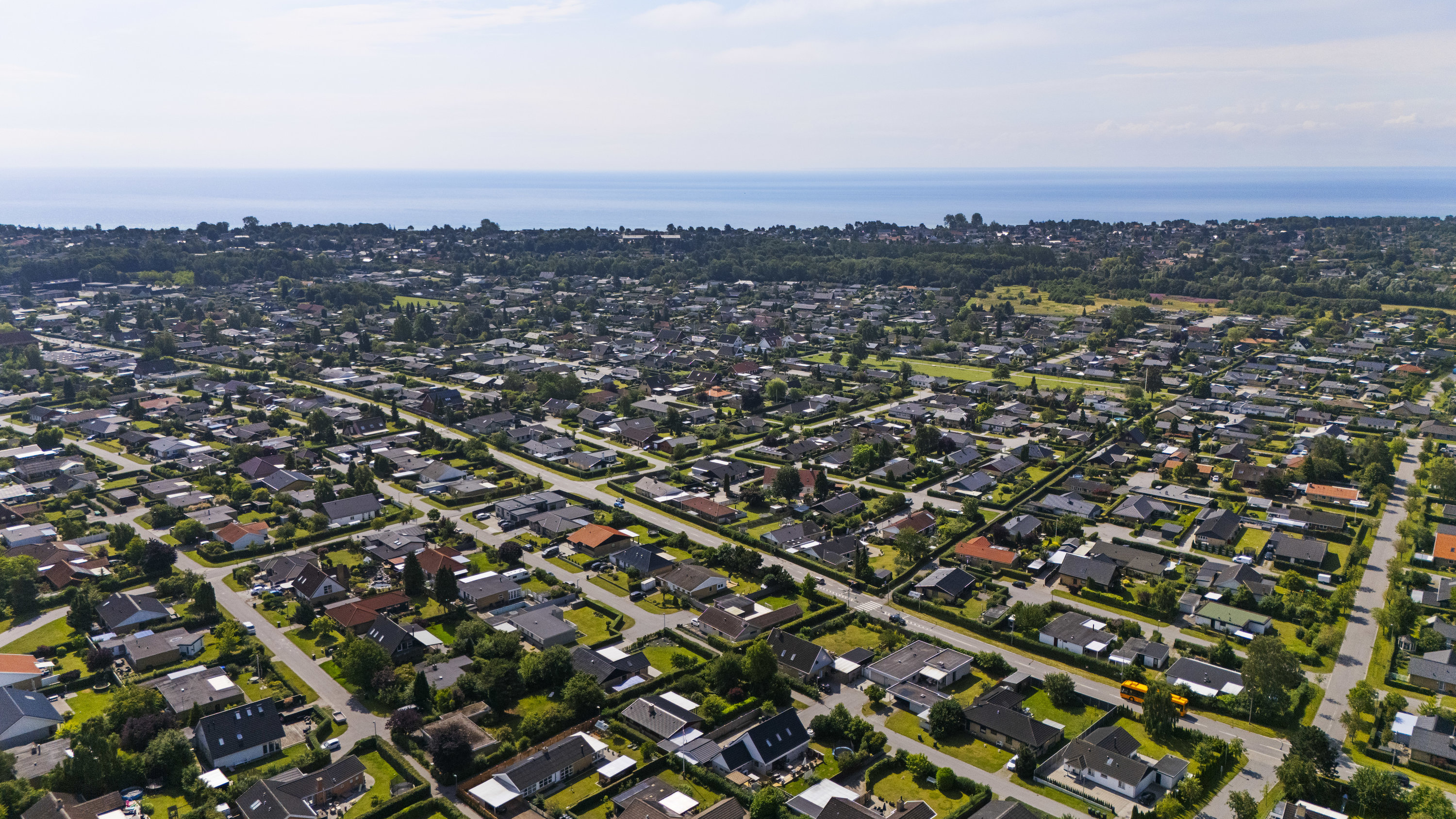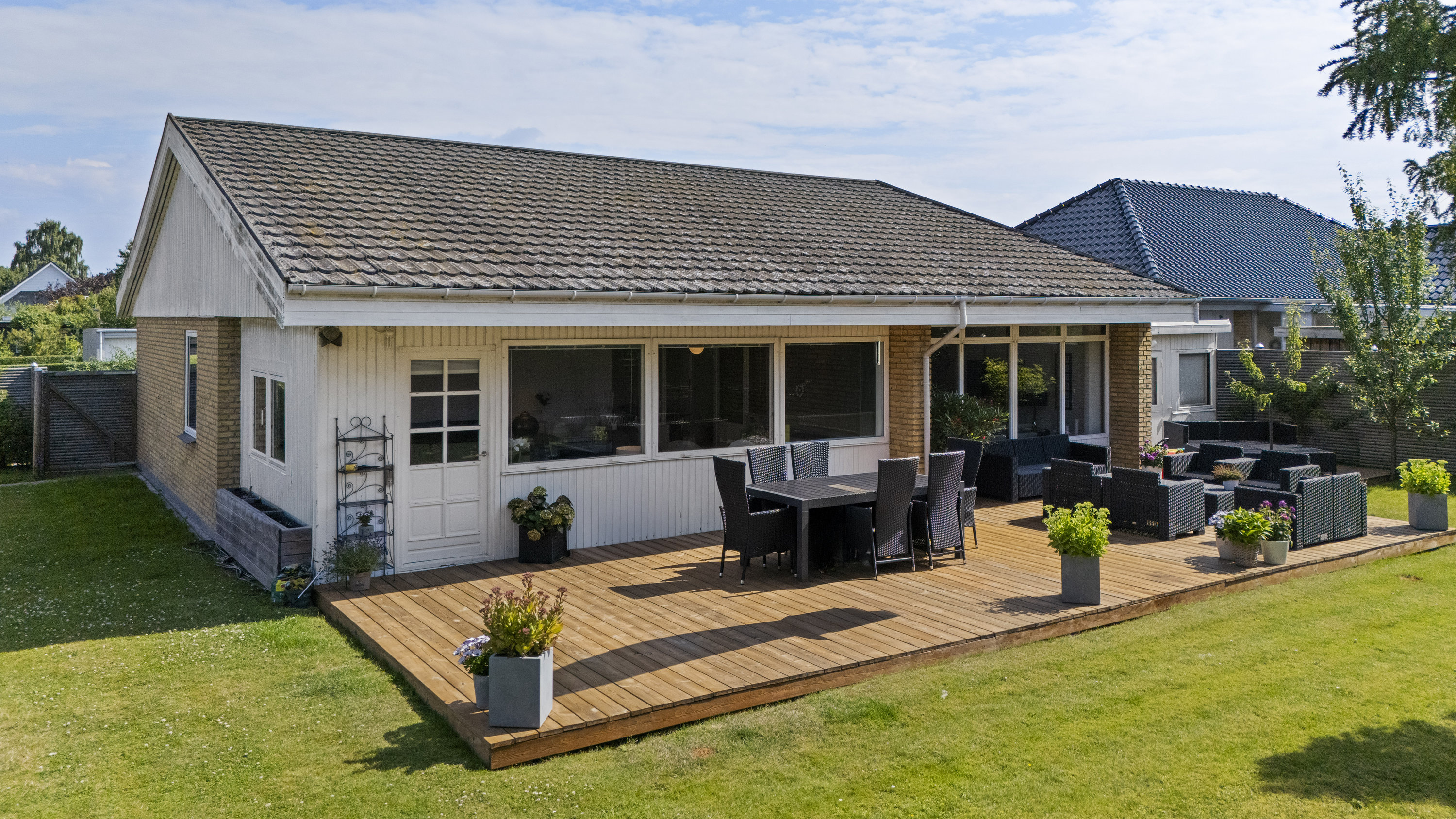 Træterrassen er hjertet i haven – et skønt, solrigt miljø, hvor loungemøbler, parasol og sommerblomster danner ramme om det gode udeliv. Her er plads til både grillhygge og stille stunder, mens børnene leger på græsset, træerne og buskene danner bløde grænser mod verden udenfor. Forhaven er fin og åben med lav stensætning og smuk beplantning, og bilen kan du parkere lige ved siden af. Udhus, hvor alt fra græsslåmaskinen til cyklerne har der plads. Grunden er større end normalt for kvarteret – og det mærkes. Der er luft og albuerum, uden at du mister fornemmelsen af nærhed. Området omkring Eriksminde er noget særligt – og har været det i generationer. Her blev jorden engang udstykket fra den gamle gård Eriksminde, og siden da har kvarteret vokset sig til en af Danmarks største grundejerforeninger. Seks grønne fællesområder fordeler sig som små oaser mellem husene, med legepladser, boldbaner, petanquebane og stisystemer, der gør det trygt og nemt at færdes – både for små og store fødder. Her bor man tæt på alt det vigtige i hverdagen: skole, institutioner, indkøb og byens bedste bager i EriksmindeCentret. Og når weekenden kalder, er det blot ti minutter på cykel til stranden – til sand under tæerne, blå himmel og friskt havvand.