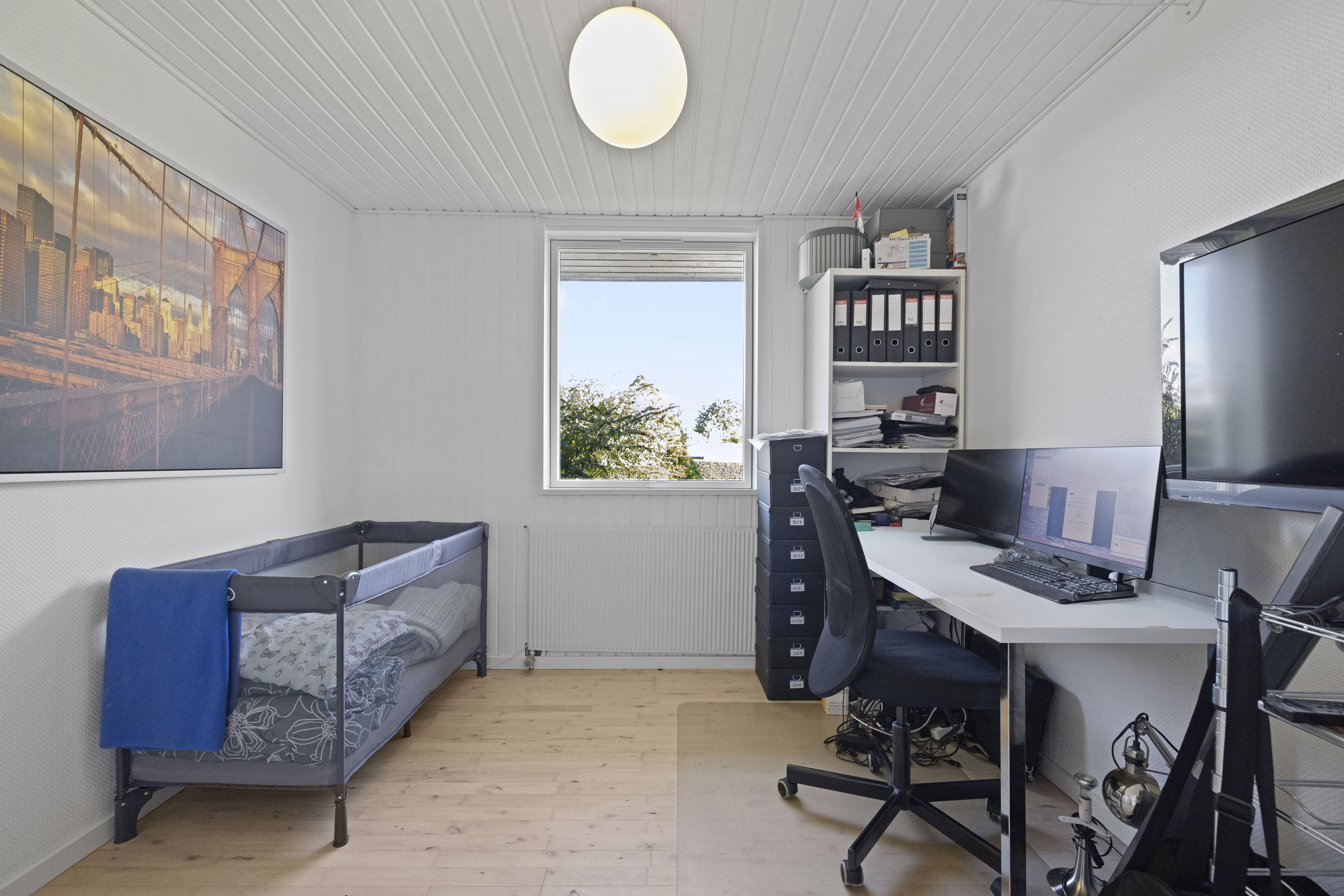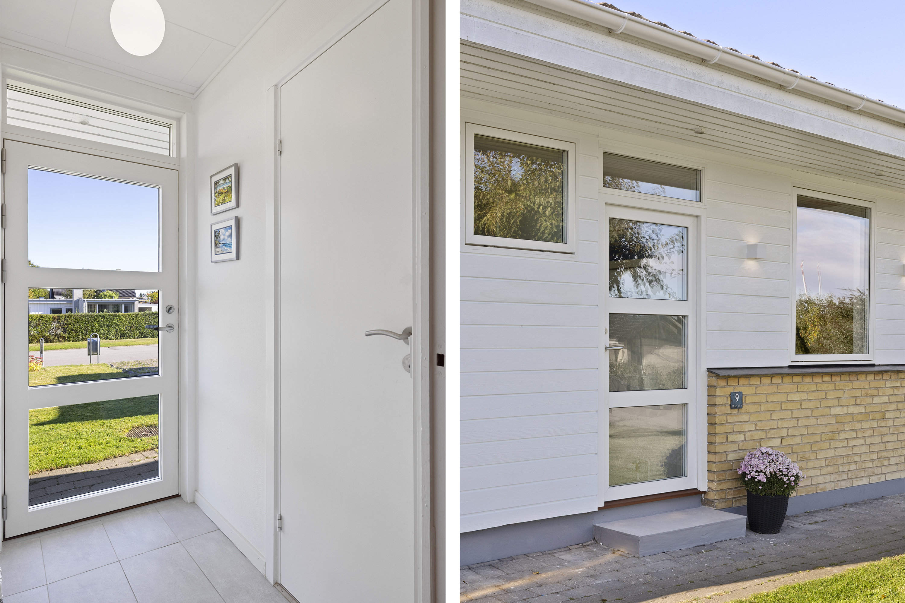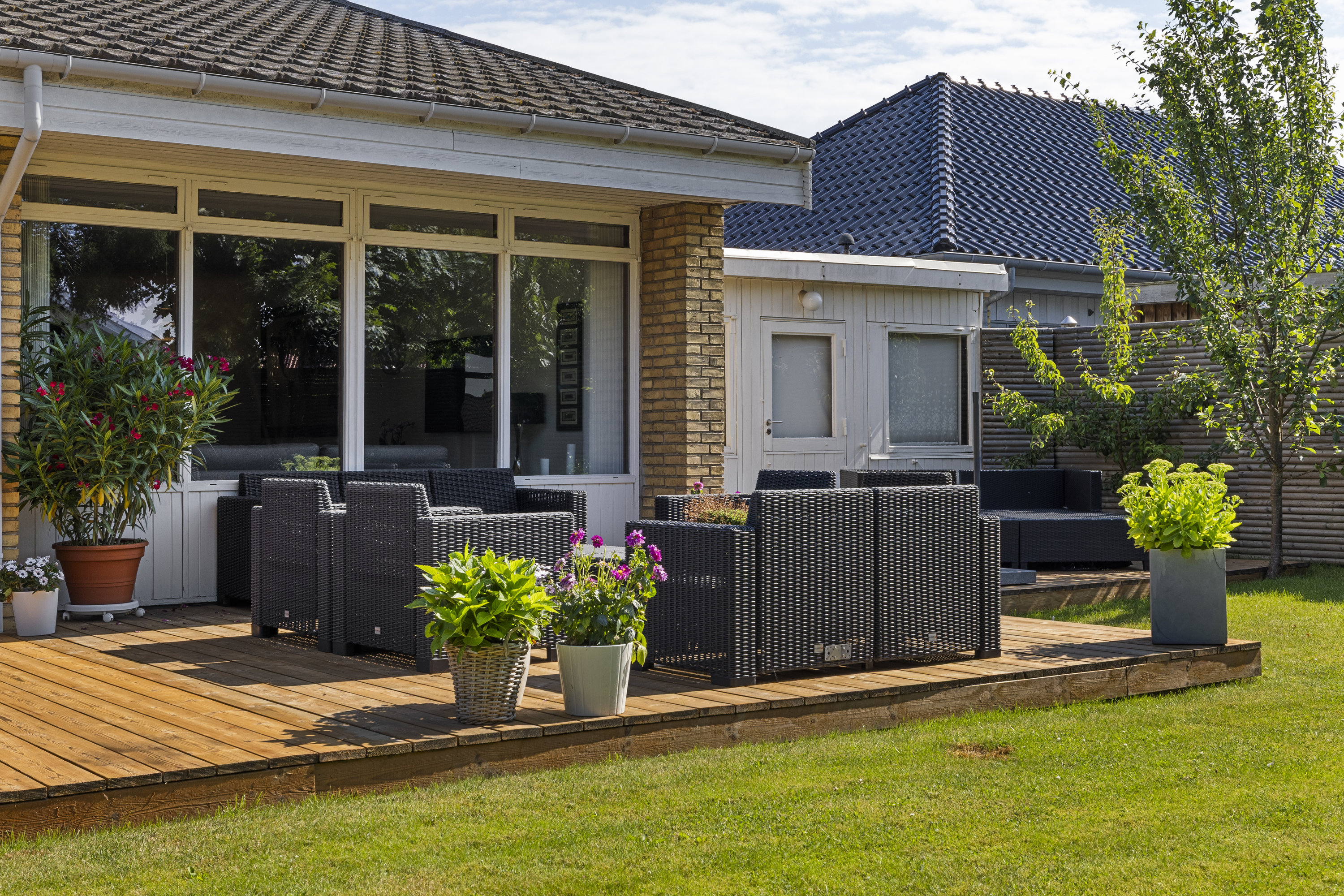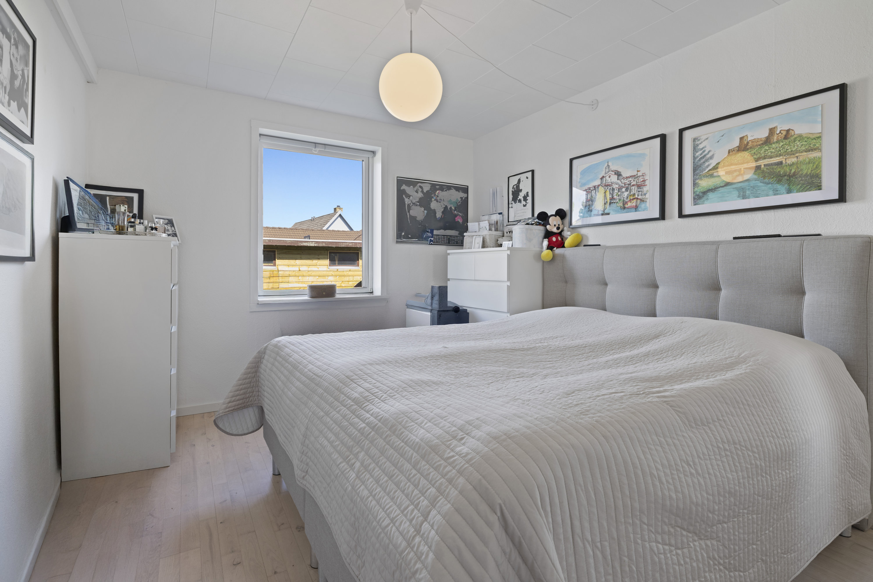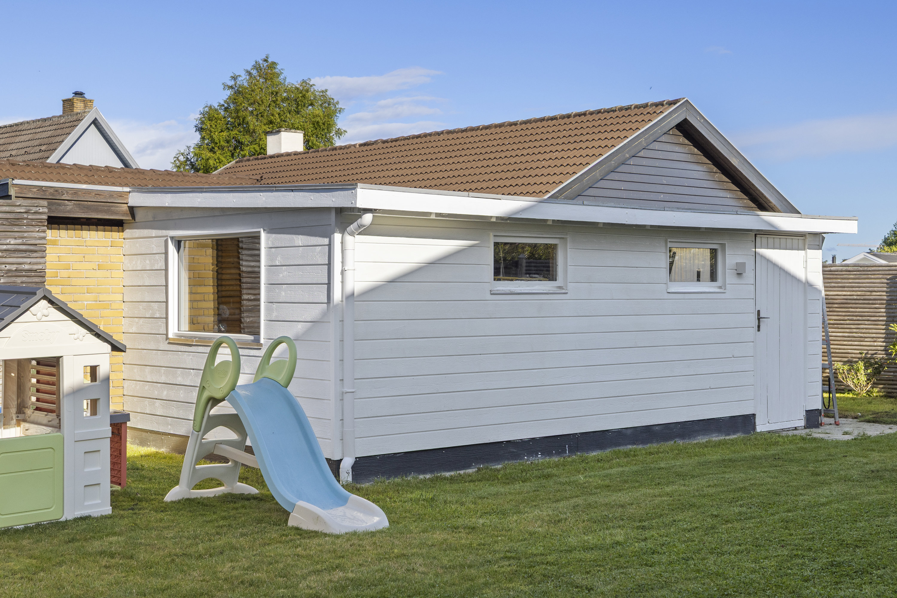 Træterrassen er hjertet i haven – et skønt, solrigt miljø, hvor loungemøbler, parasol og sommerblomster danner ramme om det gode udeliv. Her er plads til både grillhygge og stille stunder, mens børnene leger på græsset, træerne og buskene danner bløde grænser mod verden udenfor. Forhaven er fin og åben med lav stensætning og smuk beplantning, og bilen kan du parkere lige ved siden af. Udhus, hvor alt fra græsslåmaskinen til cyklerne har der plads. Grunden er større end normalt for kvarteret – og det mærkes. Der er luft og albuerum, uden at du mister fornemmelsen af nærhed. Området omkring Eriksminde er noget særligt – og har været det i generationer. Her blev jorden engang udstykket fra den gamle gård Eriksminde, og siden da har kvarteret vokset sig til en af Danmarks største grundejerforeninger. Seks grønne fællesområder fordeler sig som små oaser mellem husene, med legepladser, boldbaner, petanquebane og stisystemer, der gør det trygt og nemt at færdes – både for små og store fødder. Her bor man tæt på alt det vigtige i hverdagen: skole, institutioner, indkøb og byens bedste bager i EriksmindeCentret. Og når weekenden kalder, er det blot ti minutter på cykel til stranden – til sand under tæerne, blå himmel og friskt havvand.