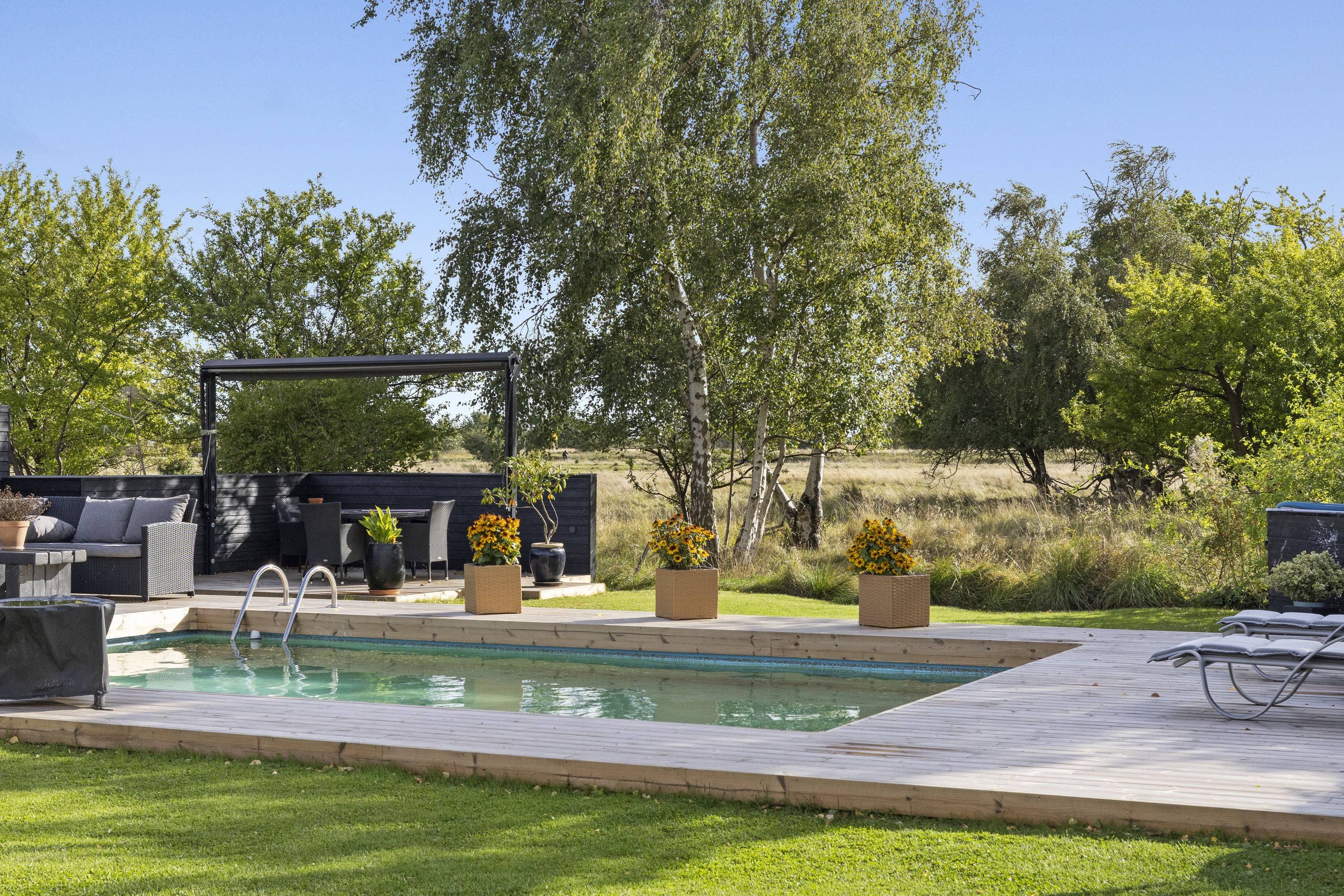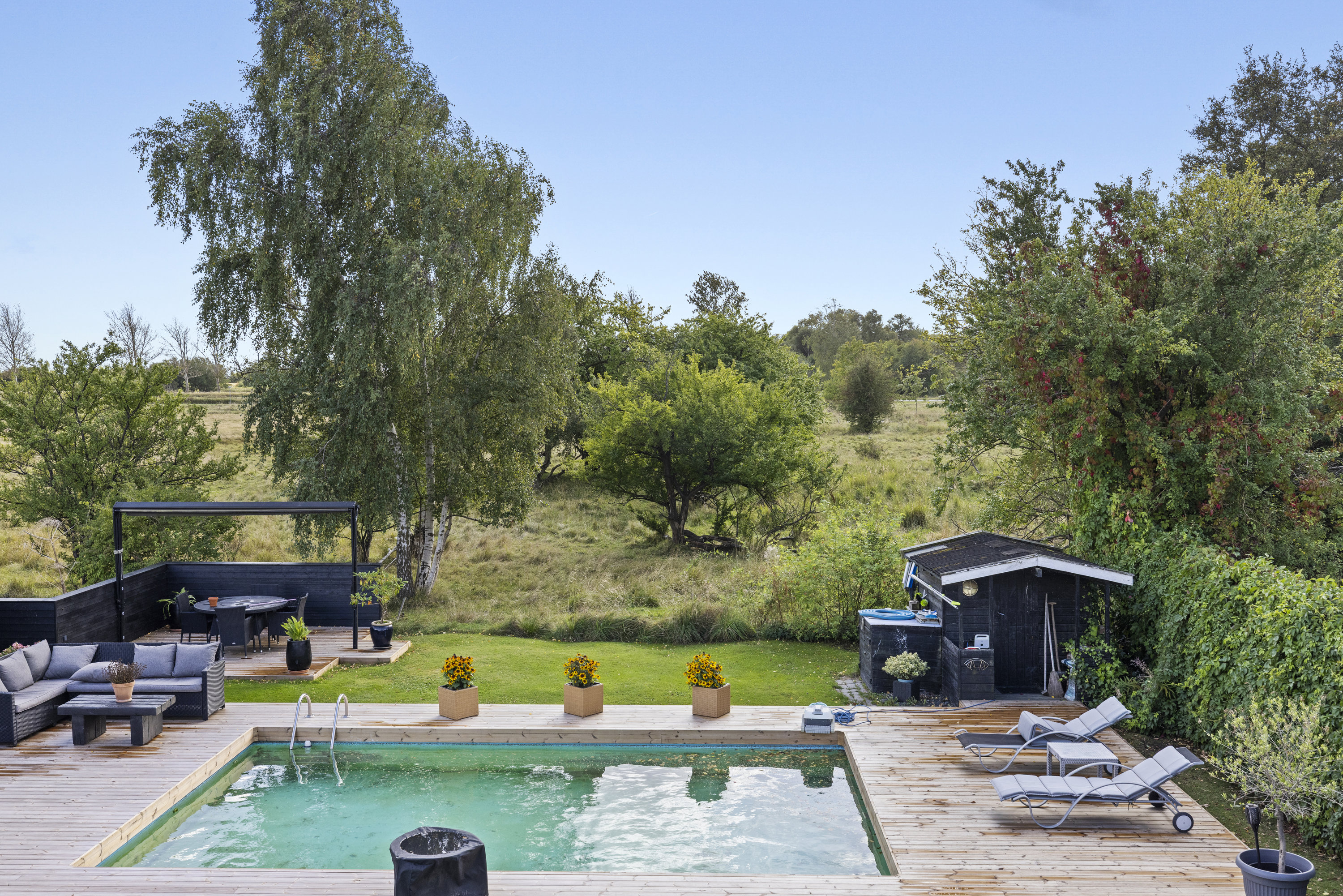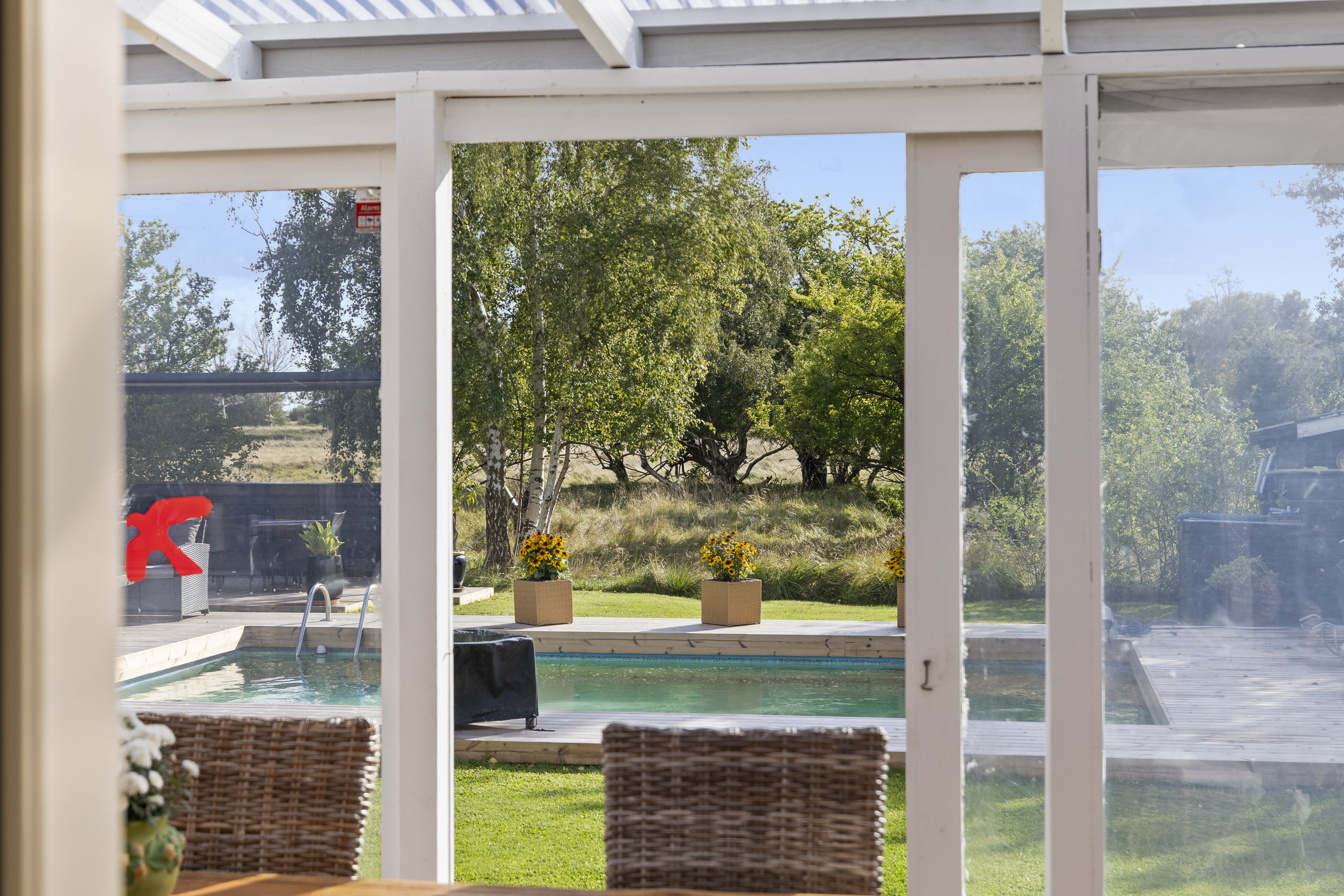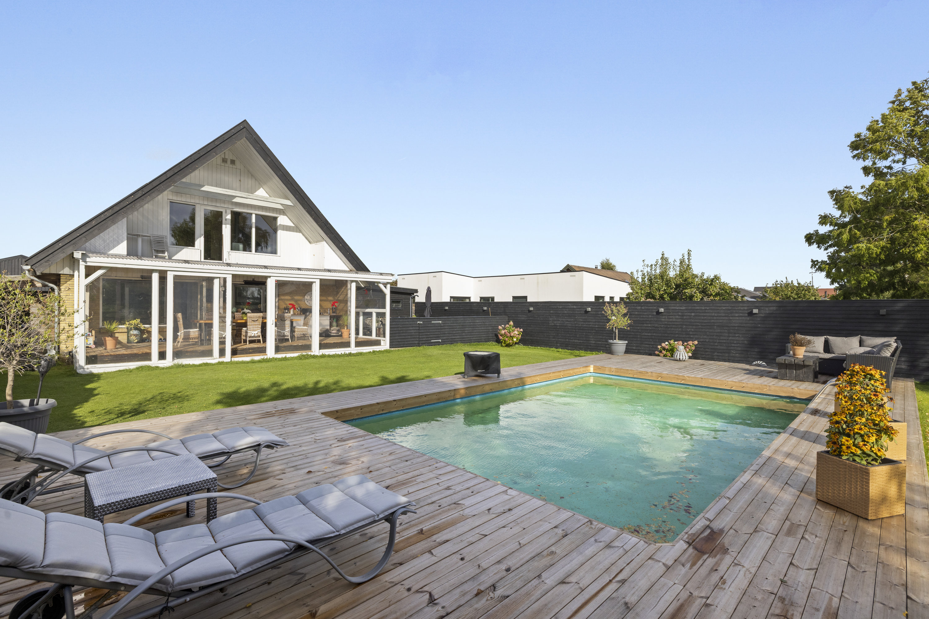 Haven er åben mod engområdet, så naturen føles som en del af det hele – herfra flyder blikket frit over vidderne, mens lyset skifter i takt med årstiderne. Omkring poolen breder en ny træterrasse sig ud med plads til liggestole, lounge og parasoller – her føles sommerdagene som sydpå, når solen står højt, og glasset dugger af kold vin. Når morgensolen rammer, er en frisk dukkert i poolen den perfekte begyndelse på dagen. I hjørnet af haven finder du endnu en træterrasse, placeret direkte mod engen, hvor roen er særlig nærværende. Den store fliseterrasse danner rammen om grill og lange aftener, mens udendørsbruseren giver fornemmelsen af ferie efter en dukkert. Udestuen bliver et ekstra opholdsrum tæt på vandet, og på græsplænen er der plads til boldspil og barfodede skridt. Den store fliseterrasse er perfekt til grill og lange aftener, hvor duften af kul og krydderurter fylder luften, mens udendørsbruseren giver fornemmelsen af ferie efter et dyp i vandet. Udestuen bliver et ekstra leverum, hvor udsigten til pool, have og eng altid er nær Garagen holder styr på bilen og alt det praktiske. En rolig gåtur langs engområdet, og du når stranden, mærker havets salte brise og stemningen i Greve Marina med det hyggelige havneliv.