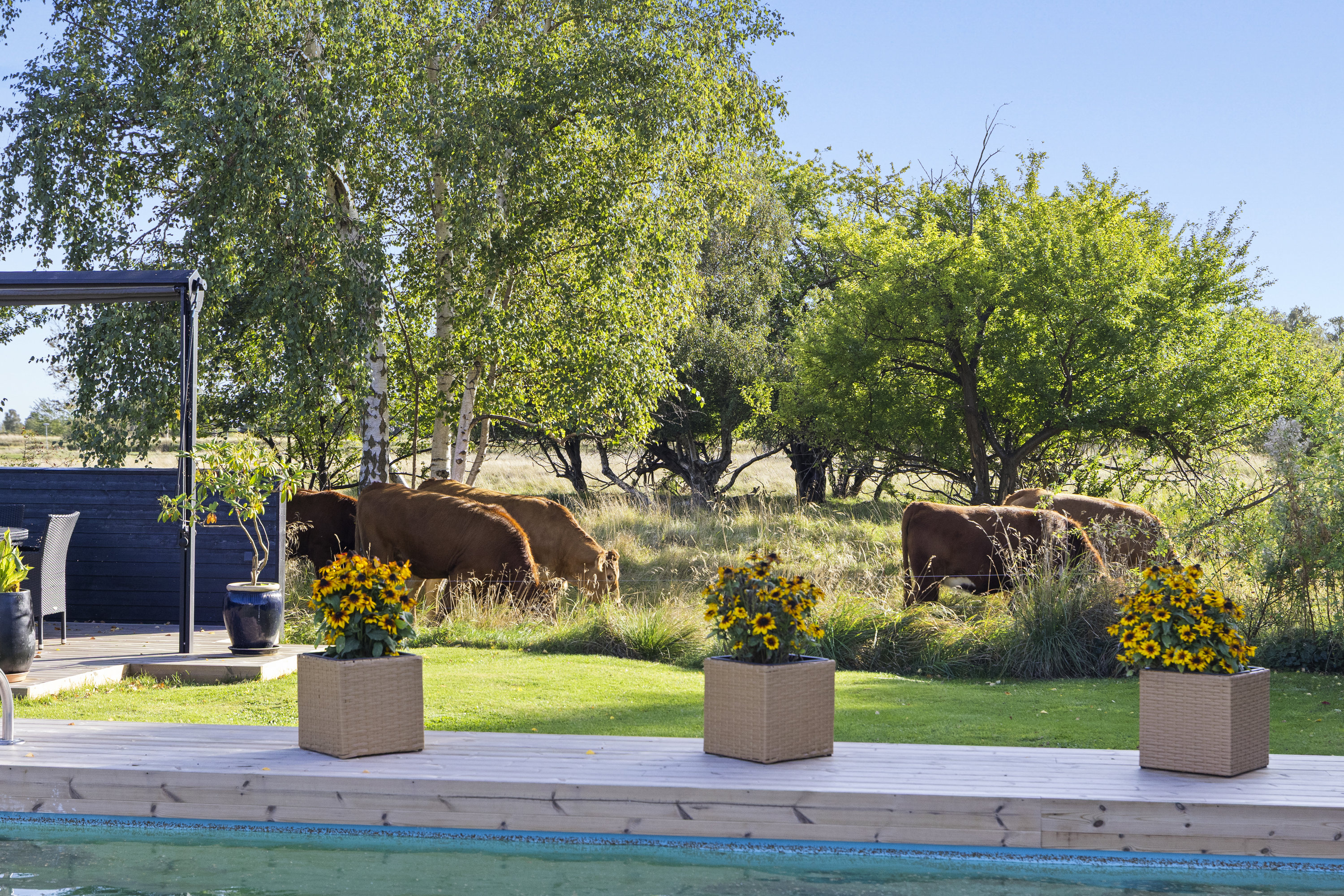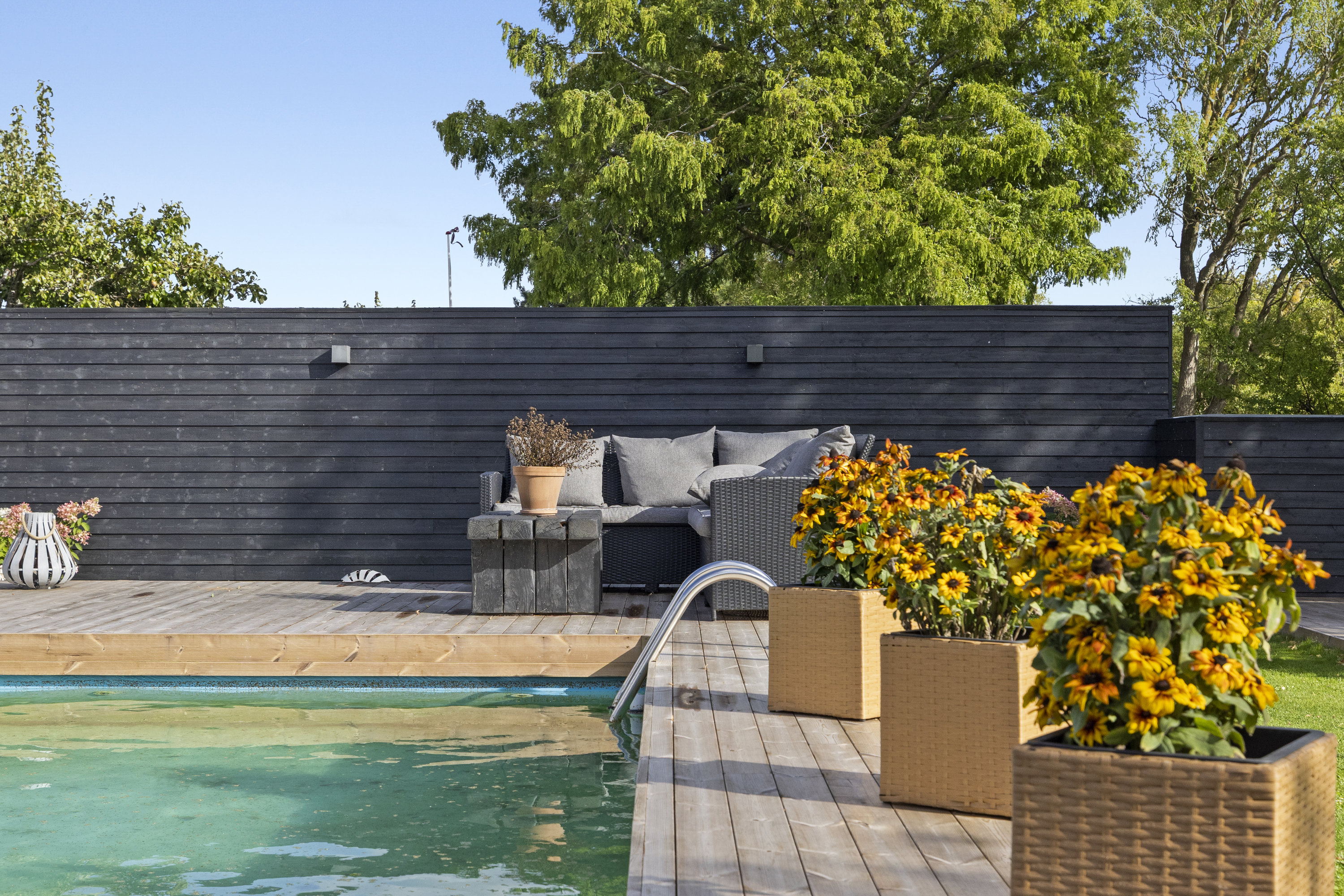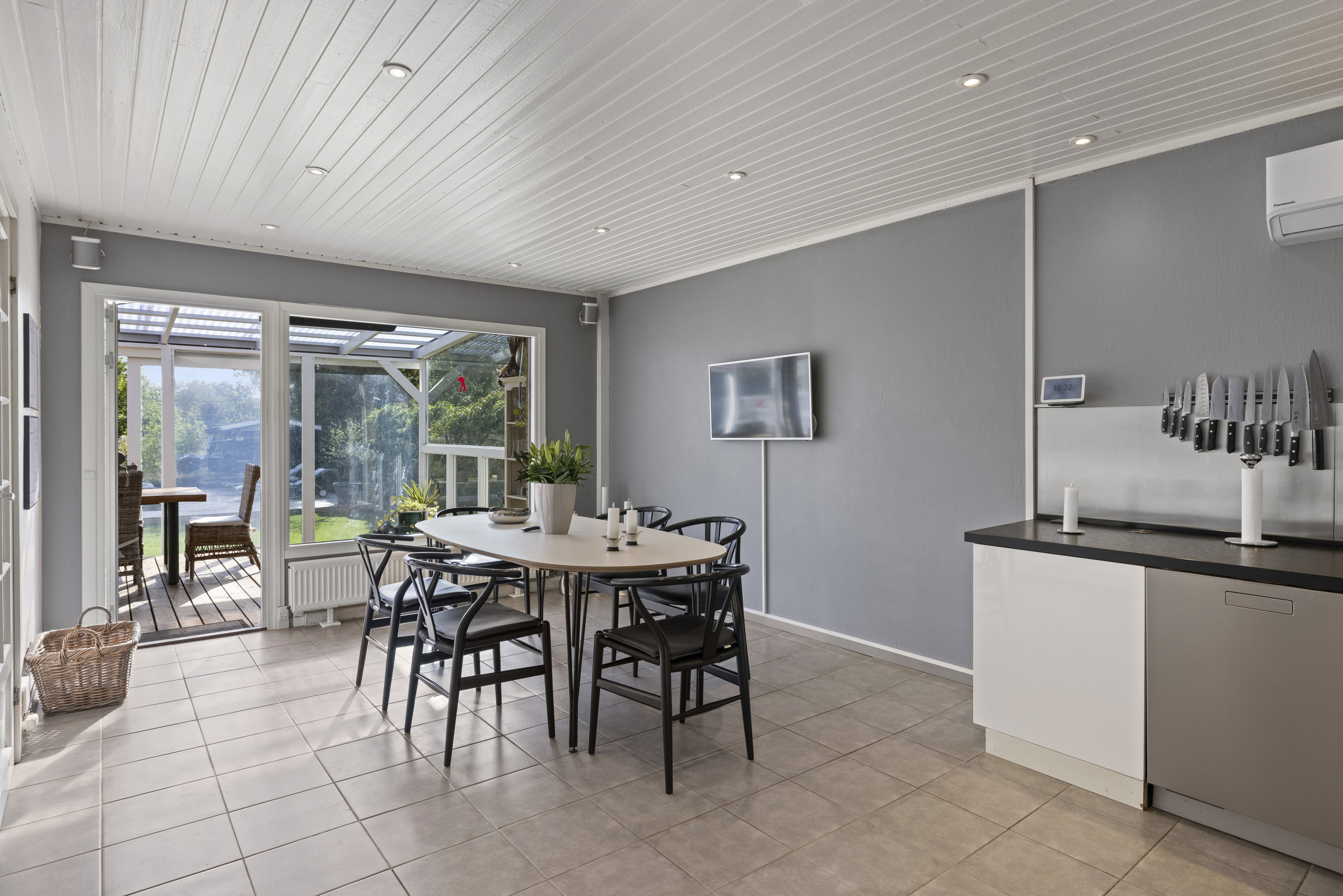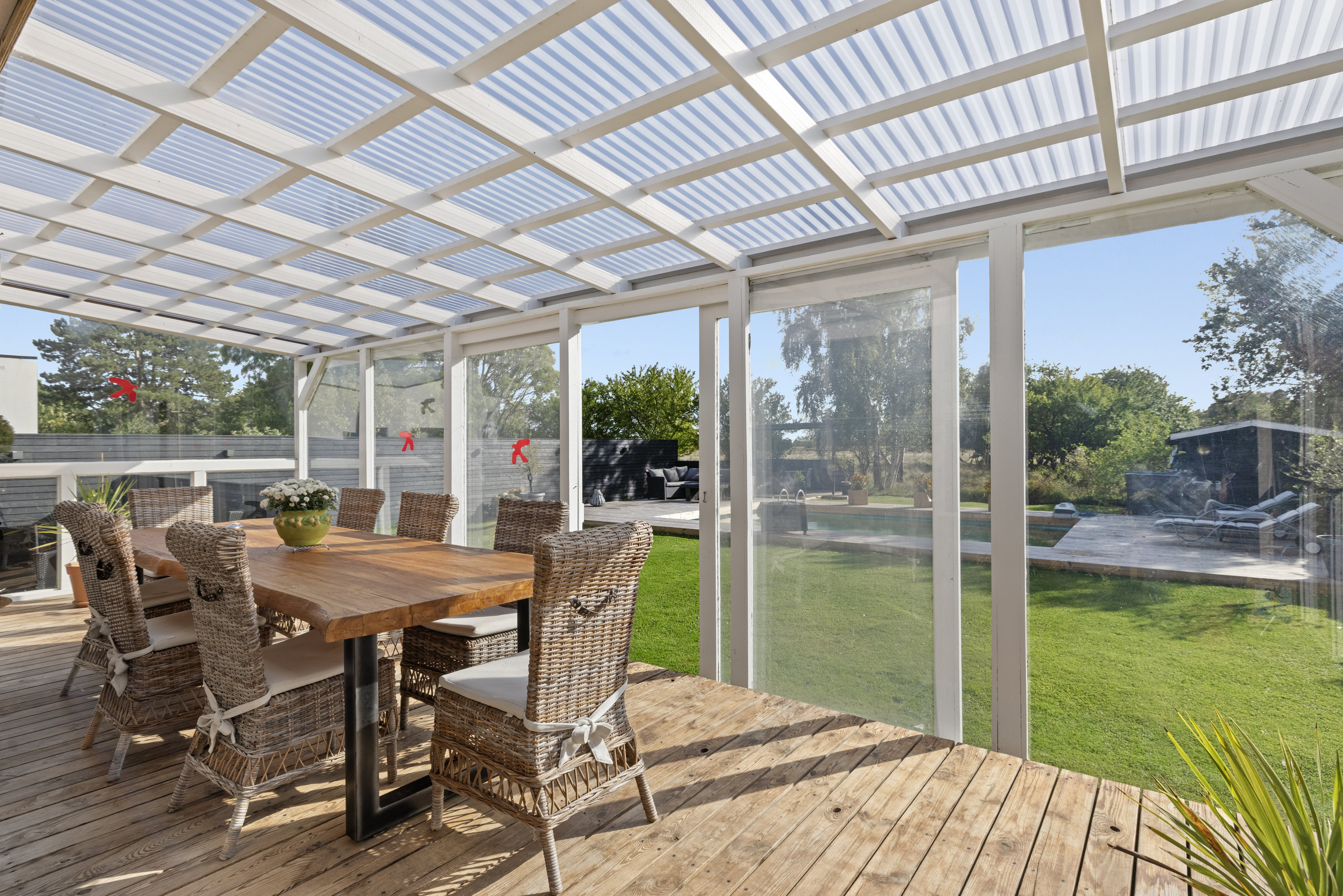 Haven er åben mod engområdet, så naturen føles som en del af det hele – herfra flyder blikket frit over vidderne, mens lyset skifter i takt med årstiderne. Omkring poolen breder en ny træterrasse sig ud med plads til liggestole, lounge og parasoller – her føles sommerdagene som sydpå, når solen står højt, og glasset dugger af kold vin. Når morgensolen rammer, er en frisk dukkert i poolen den perfekte begyndelse på dagen. I hjørnet af haven finder du endnu en træterrasse, placeret direkte mod engen, hvor roen er særlig nærværende. Den store fliseterrasse danner rammen om grill og lange aftener, mens udendørsbruseren giver fornemmelsen af ferie efter en dukkert. Udestuen bliver et ekstra opholdsrum tæt på vandet, og på græsplænen er der plads til boldspil og barfodede skridt. Den store fliseterrasse er perfekt til grill og lange aftener, hvor duften af kul og krydderurter fylder luften, mens udendørsbruseren giver fornemmelsen af ferie efter et dyp i vandet. Udestuen bliver et ekstra leverum, hvor udsigten til pool, have og eng altid er nær Garagen holder styr på bilen og alt det praktiske. En rolig gåtur langs engområdet, og du når stranden, mærker havets salte brise og stemningen i Greve Marina med det hyggelige havneliv.