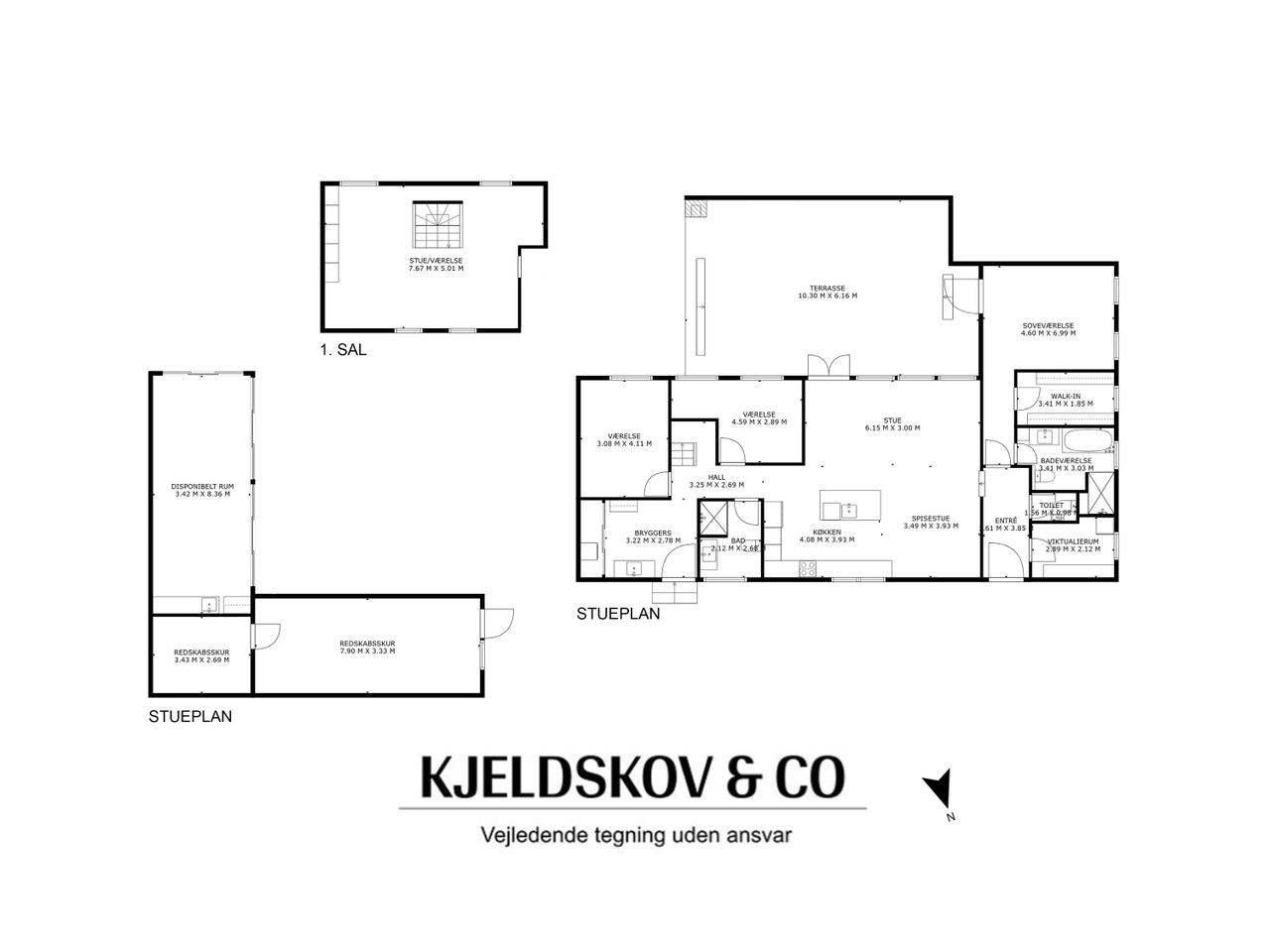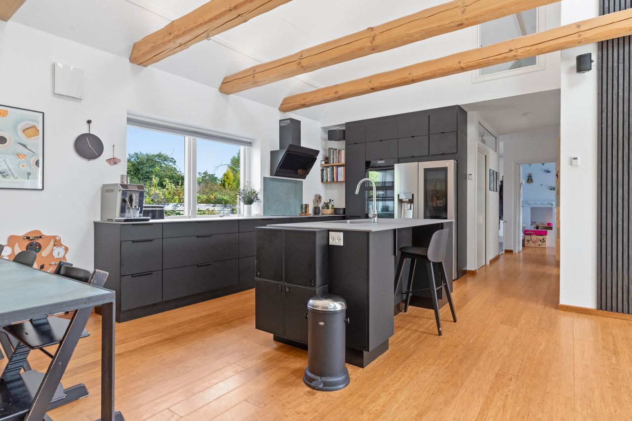 bæredygtige valg gør det let at trække vejret med god samvittighed. Den nye tilbygning rummer en eksklusiv forældreafdeling med soveværelse og direkte udgang til terrassen, så morgensolen og den friske luft kan glide ind sammen med dagen. Et walk-in-closet opfylder ønsket om plads og overblik, mens badeværelset er som et lille spa – med badekar under ovenlyset, rainshower og smukke fliser, der taler til både øje og krop. I tilbygningen findes også et stilrent gæstetoilet, et praktisk viktualierum til alt det, man ikke kan undvære, og en entré med ro og rummelighed. Et spektakulært leverum åbner sig som hjemmets hjerte med lofter, der rejser sig mod himlen, synlige hanebånd og ovenlys, der lader lyset strømme ned og roen brede sig i takt med rummets arkitektoniske lethed. Her står samtalekøkkenet fra Kvik – matsort og fuldt udstyret, et køkken ud over det sædvanlige, med en køkkenø, der samler mennesker om både samtaler og måltider. Der er plads til det lange spisebord, et blødt sofaområde og leg på gulvet – alt i ét åbent flow med udgang til haven og terrassen. To gode børneværelser, plads til leg, fordybelse og søvn - endnu et badeværelse, og på førstesalen venter en stor opholdsstue/alrum – klar til leg, kontor, musik eller nye værelser, når livet forandrer sig.