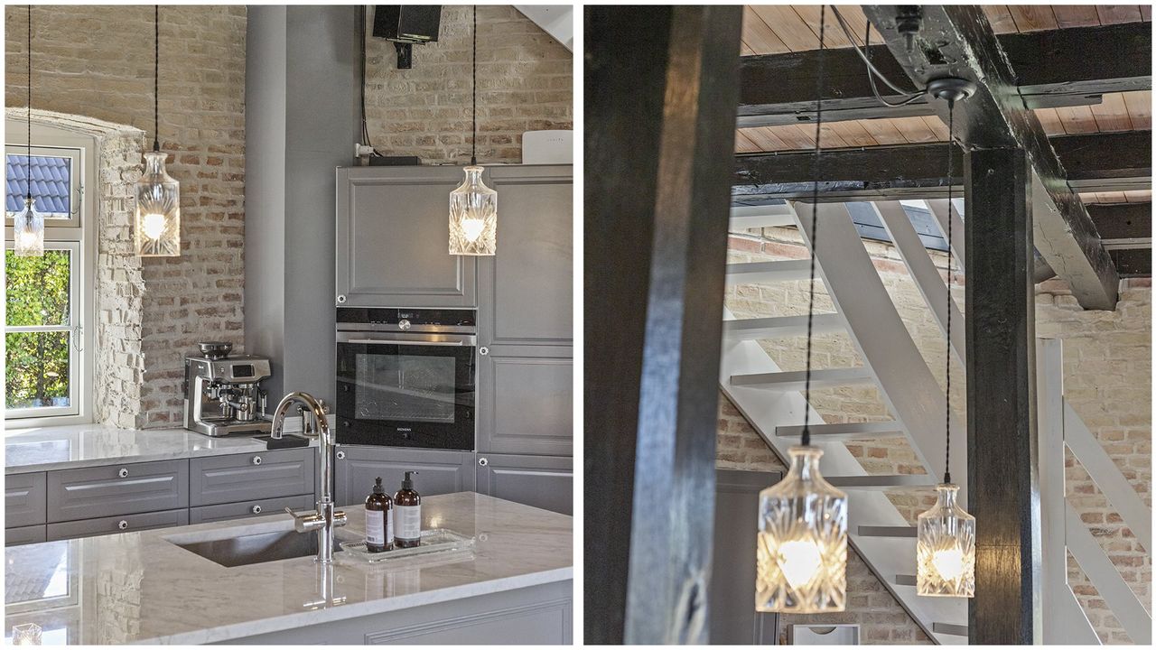 Det siges, at møllens top vejer over fire tons – og alligevel balancerer den yndefuldt over landskabet, som stod den på tåspidser. Indenfor åbenbarer hjemmet sig som noget ganske særligt – nænsomt restaureret i 2019. Rå murstensvægge, synligt træværk og sprossede vinduer skaber en stemning, hvor tid og tilstedeværelse får lov at fylde. Hvert materiale er valgt med omhu, og hver vinkel rummer sin egen stemning. Køkken/alrummet er et ægte samtalekøkken – et rum med sjæl og rummelighed, hvor man både kan samles og trække sig tilbage. Der er plads til et stort spisebord, loungestole med kig til haven og et hverdagsliv i roligt tempo. De grå elementer står smukt mod marmorbordpladen, og de fine porcelænsgreb tilfører et klassisk præg. De dobbelte glasdøre åbner ud til terrassen og trækker dagslyset ind, så inde og ude flyder sammen i ét naturligt åndedrag. Badeværelset er gennemført og æstetisk med sandfarvede fliser, rustik vask og vægge i en blød grøn tone, der skaber ro og varme. På førstesalen venter en hyggelig stue og to værelser – det hele med glasdøre til rundgangen, hvor udsigten åbner sig i alle retninger. Heroppe mærker man virkelig, at man bor hævet over hverdagen, med himlen tættere på og landskabet under sig. Øverst oppe gemmer sig en fredelig forældreafdeling med eget toilet og kig til det gamle stjernehjul under kip – en smuk og poetisk påmindelse om møllens levende historie.