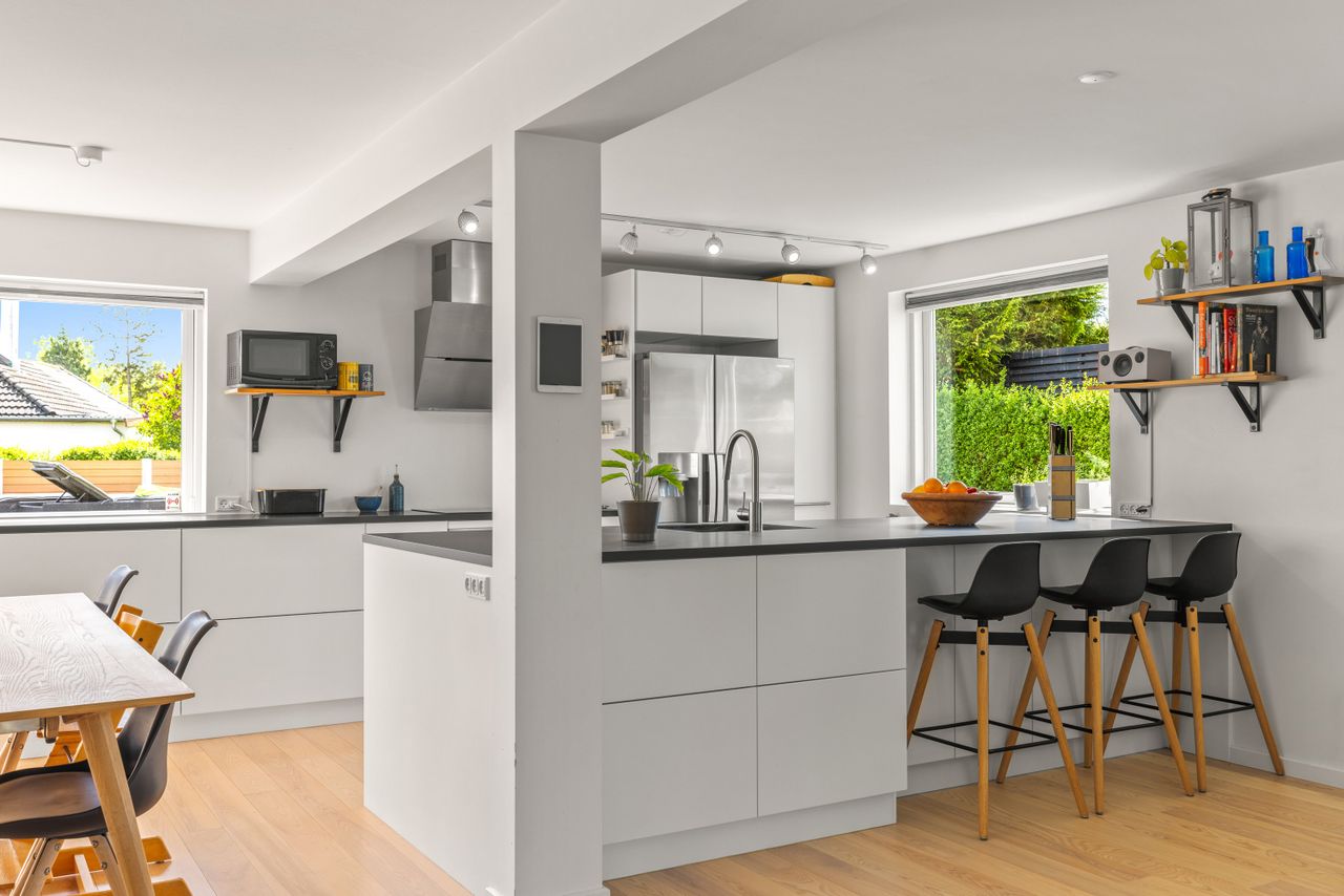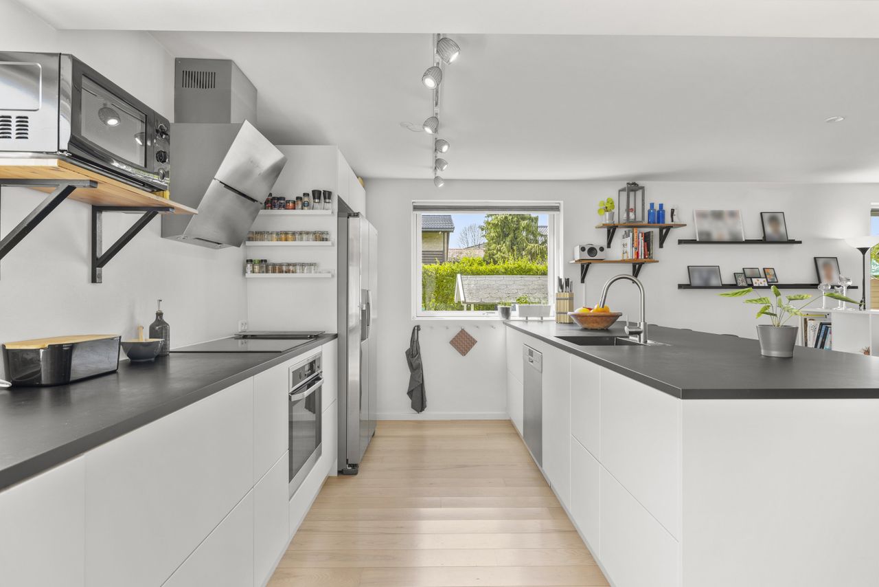 Ejendommen fremstår yderst velholdt og opdateret med respekt for både æstetik og komfort. I 2021 blev huset beriget med nyt tegltag og super lavenergi ovenlysvinduer med 3-lags glas, mens et BWT-blødgøringsanlæg og luft-til-luft varmepumpe sikrer en moderne og behagelig hverdag. Der er tænkt over detaljerne – og det mærkes. Det store leverum forener køkken, spiseplads og stue i ét åbent og lyst miljø, hvor samtalekøkkenet står skarpt med hvide fronter og mørk bordplade. En glasdør åbner ud til terrassen og gør det let at lade inde og ude smelte sammen. I stueplan ligger desuden to værelser og et badeværelse med bruseniche, mens førstesalen byder på fire værelser og et lyst badeværelse med badekar. I soveværelset understreger de synlige bjælker og loft til kip husets charme, og reposen har plads til leg, kontor eller stille stunder i hverdagens rytme.