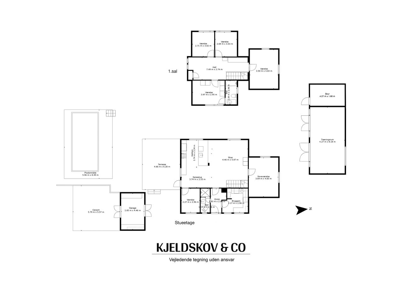 Haven vender stik syd og indbyder til alt det, der trækker udenfor: afslapning, grill, grin og kolde drikke på den nye IPE-terrasse, hvor solen står længe. Poolområdet er en oase med vandet som blikfang – men for den, der ønsker det anderledes, kan poolen nemt fjernes og give plads til nye drømme. Uanset hvad, er rammerne sat. Et af de store plusser ved ejendommen er annekset. 46 lyse og isolerede kvadratmeter med store glasdøre ud mod haven gør det til et oplagt sted til træning, hjemmekontor, gæster eller teenageafdeling – og det hele føles som en naturlig del af boligen. Dertil kommer en ny dobbelt carport med integreret isoleret skur fra 2022, der matcher huset i både stil og funktion. Med lyden af børnelatter, stier til alt det praktiske – og det grønne bag hækken, der trækker i både små og store. Herfra er der tryg adgang til skole, sport og hverdagsbehov, og det hele ligger inden for få minutters rækkevidde.