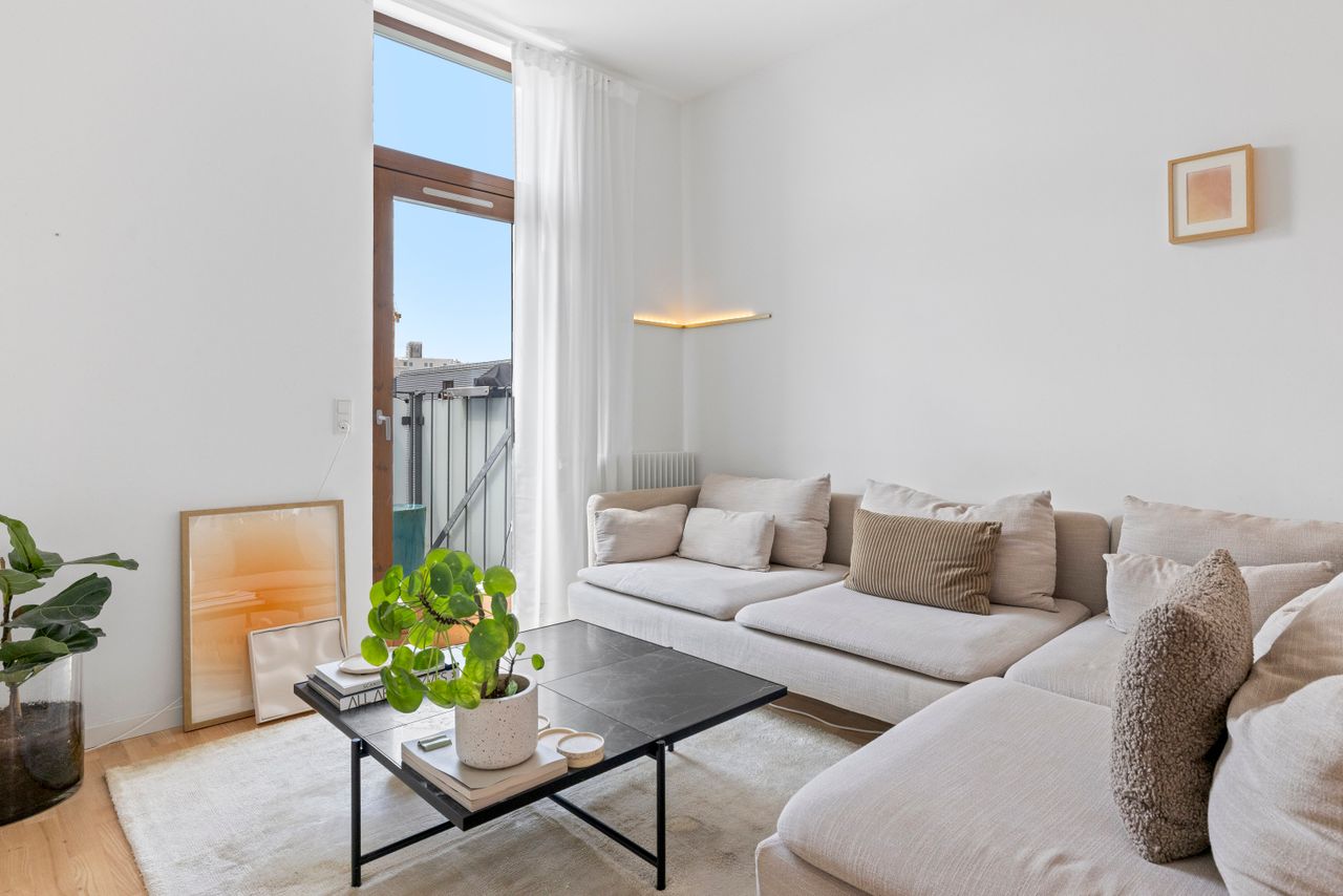 Muligvis den fineste lejlighed i Frugthaverne – højt oppe, højt til loftet og med høj standard hele vejen igennem. Kun én nabo og et lysindfald, der får det hele til at føles endnu større. Alt er lækkert her, gennemført fra ende til anden og renoveret med boligmagasinet som inspiration. Farver, materialer og detaljer er tænkt sammen med en særlig sans for helhed og stemning – som en rød tråd gennem rummene.