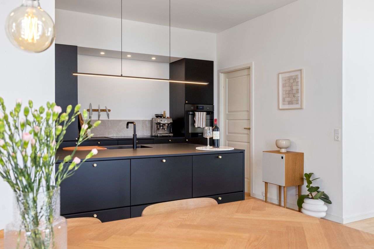 Det hele er gennemført – som var det løftet ud af et boligmagasin. De smukke egetræsgulve og hvide gipslofter danner en perfekt ramme om hverdagen, og det sorte helt nye samtalekøkken står skarpt med quooker, Blanco-vask og fine, gennemførte detaljer. Køkkenet er åbent mod alrum og stue, hvor store vinduespartier, fransk altan og udgang til altanen trækker lyset helt ind. Et rum med stemning, plads til langbord, sofahygge og ro. Badeværelset er lige så lækkert – med pudsede vægge, gulvvarme, glasafskærmning og rainshower. Messingarmaturerne fuldender udtrykket. Soveværelset har flot skabsvæg – lad vinduet stå på klem og mærk sommerbrisen glide ind. Herfra er der adgang til badeværelset, som også kan nås fra køkkenet. Et ekstra værelse giver mulighed for både børneværelse, hjemmekontor eller gæster – og ønskes et tredje værelse, er det bestemt muligt at etablere.