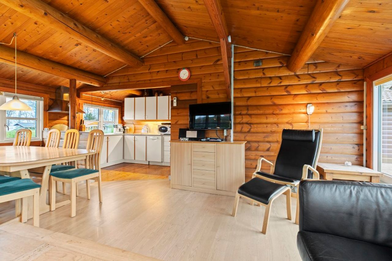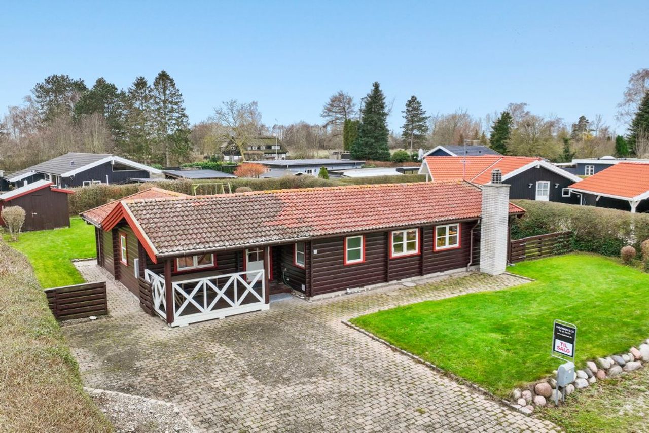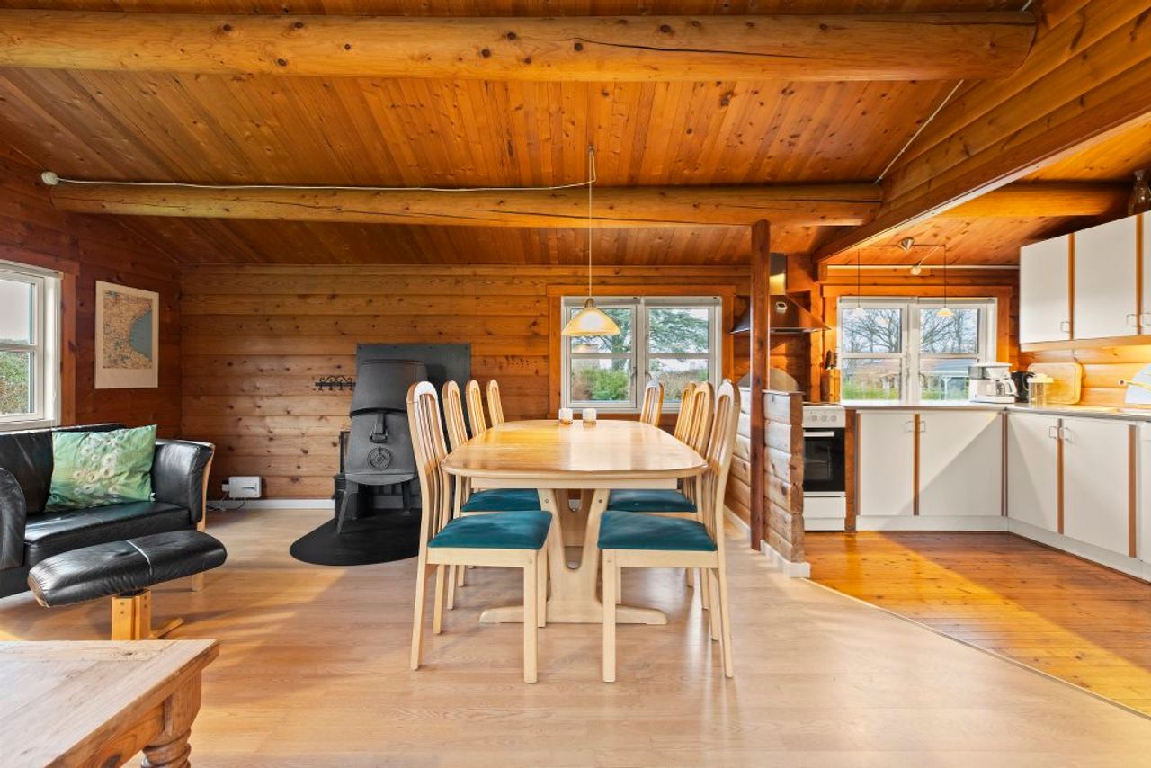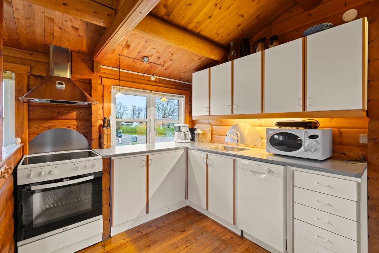 Den norske stemning ude fortsætter indenfor, hvor lofter til kip og synlige bjælker skaber en ægte hyttestemning. De massive trævægge omfavner alle rummene, mens den store brændeovn lader varmen sprede sig ud i stuen – et naturligt samlingspunkt til både rolige aftener og hyggelige stunder. Stuen åbner sig mod det åbne, velholdte køkken – et indbydende rum med god skabsplads, der gør madlavning til en fornøjelse. De fire soveværelser byder på plads til hele familien, og ét forkæler med udsigt til havet. Badeværelset er rummeligt og praktisk med bruseniche og en funktionel vaskesektion.