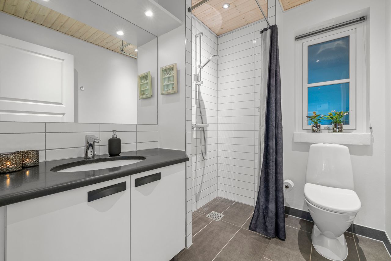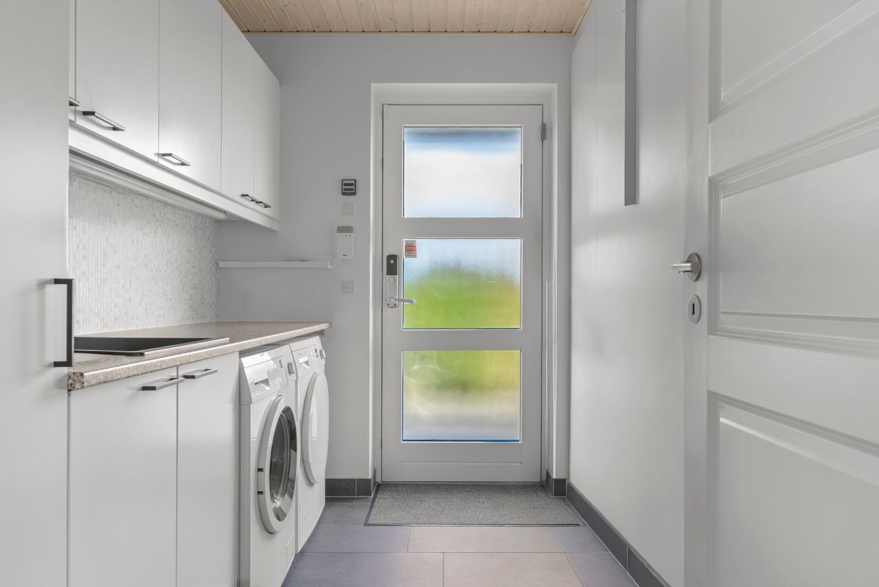 Den snorlige stil fortsætter indenfor, hvor lyse gulve og nye klinker lægger et roligt fundament for livet, der leves. I køkken/alrummet trækker glaskarnappen lyset ind til måltiderne, og det hvide HTH-køkken åbner sig mod spisebordet, samtalerne og hverdagens små øjeblikke. Halvvæggen tilføjer en let afgrænsning, og ved køkkenøen er der plads til højstole – så alle kan være med, når maden tilberedes og snakken kan flyde. Franske glasdøre til den store opholdsstue, hvor endnu en glaskarnap favner sofastemningen og eftermiddagssolen. Planløsningen fordeler sig med forældreafdeling, soveværelse med direkte adgang til badeværelse i rolige toner af hvide fliser og mørke klinker, mens børneafsnittet byder på tre værelser, til søvn, ro og leg samt endnu et badeværelse i samme enkle, elegante stil. Alt er gennemtænkt og velholdt – og med solceller, ventilationsanlæg, blødgøringsanlæg og luft-til-vand-varmepumpe er teknikken i top.