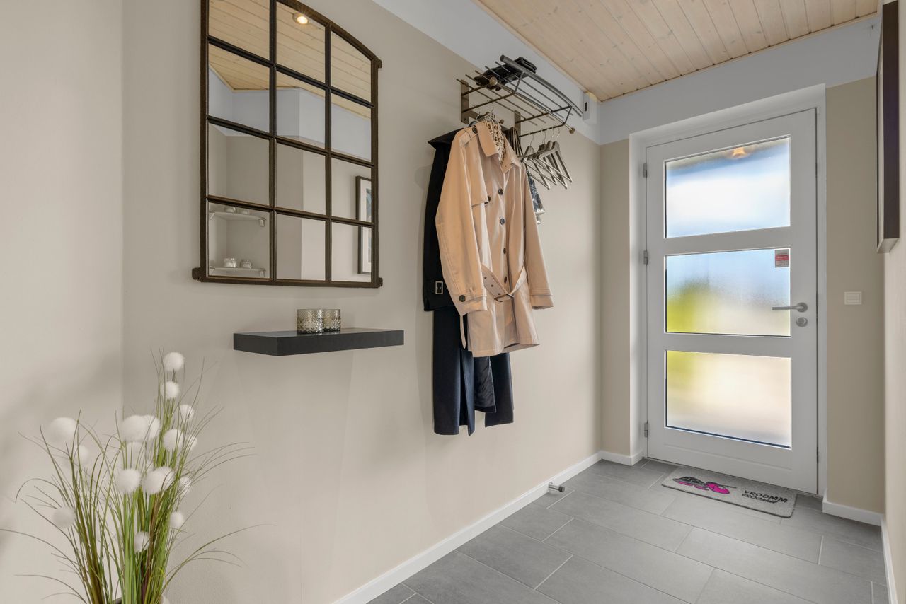 Bag den tætte hæk står huset snorlige – en Lind & Risør-villa i klassisk stil med valmtag, hvide facader og solceller på taget. Alt emmer af orden og overskud, og allerede ved første blik mærker man, at her er tænkt på både liv og nærvær. Her er plads til familien – til de små skridt og store øjeblikke – og en planløsning, der favner både hverdagen og alt det, der gør den værd at leve.