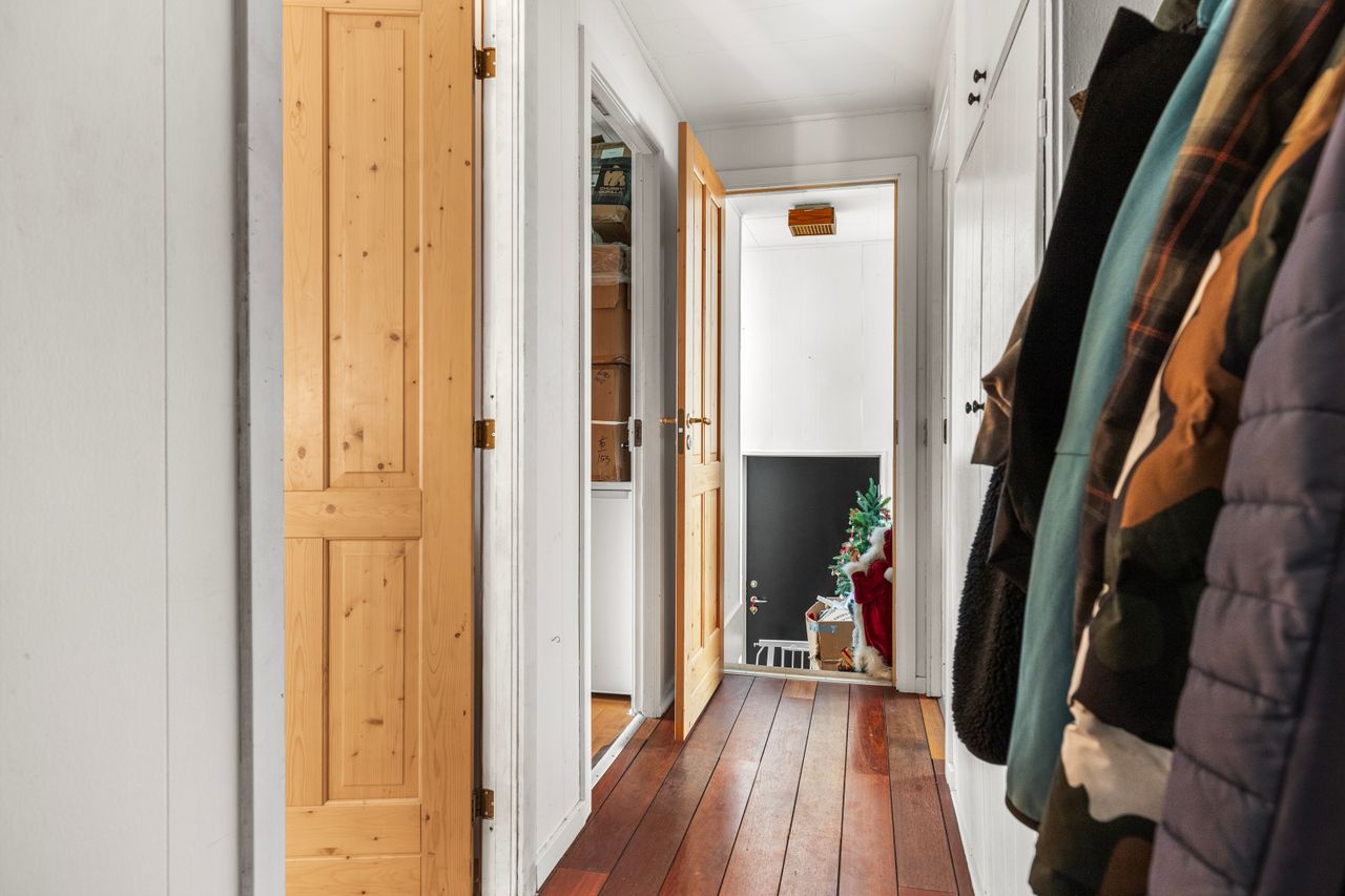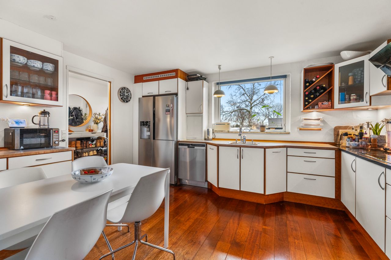 Familielivet finder gode rammer i boligen, der er indrettet i ét plan- i alt 280 etagemeter, heraf 124 m² høj og anvendelig kælder. Stueplanet rummer fire værelser med plads til søvn, leg og lektier. Badeværelset er holdt i lyse fliser, og spisekøkkenet danner rammen om hverdagens måltider. Stuen er åben og opdelt i spise- og opholdsafdeling med få trin ned til pejsestuen, hvor varmen og udsigten til haven følger med. Kælderen har egen indgang, badeværelse og køkken samt flere disponible rum – oplagt til kontor, kreativt brug eller en selvstændig teenageafdeling. Boligen er senest moderniseret i slutningen af 1980’erne og giver et solidt udgangspunkt for en nutidig opdatering.