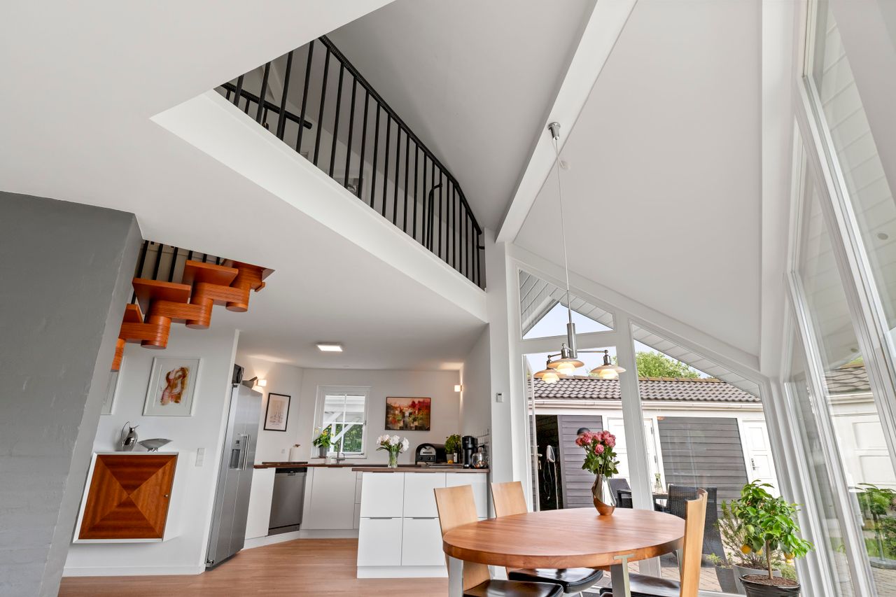Lyset er noget af det første, man lægger mærke til i spisestue/alrummet. Det falder smukt ind gennem de høje, spidse vinduespartier og trækker loftet op i kip, så rummet føles både let og levende. Det store alrum samler køkken og spiseplads i én åben helhed – et naturligt samlingspunkt, hvor arkitekturen lader hverdagen folde sig ud med luft og ro. Herfra er der direkte adgang til terrassen, og blot et par trin ned åbner stuen sig med blødere stemning og to udgange til haven – et stille hjørne til afslapning og nærvær. Køkkenet står skarpt i hvidt med facet-slebne fliser og en varm træbordplade. Badeværelset i stueplan er nyistandsat og elegant med rainshower. Trappen, der forbinder etagerne, står nærmest som en skulptur midt i huset og fører op til første sal, hvor lofterne fortsætter i kip, og blikket går frit gennem huset. Her ligger tre værelser – to med franske altaner og et med regulær altan, hvor dørene kan stå åbne, og morgenluften glide ind. Heroppe er endnu et lækkert badeværelse, også nyrenoveret med hjørnebadekar og samme rolige, stilfulde udtryk. Hele huset bindes sammen af hvidpigmenterede asketrægulve.