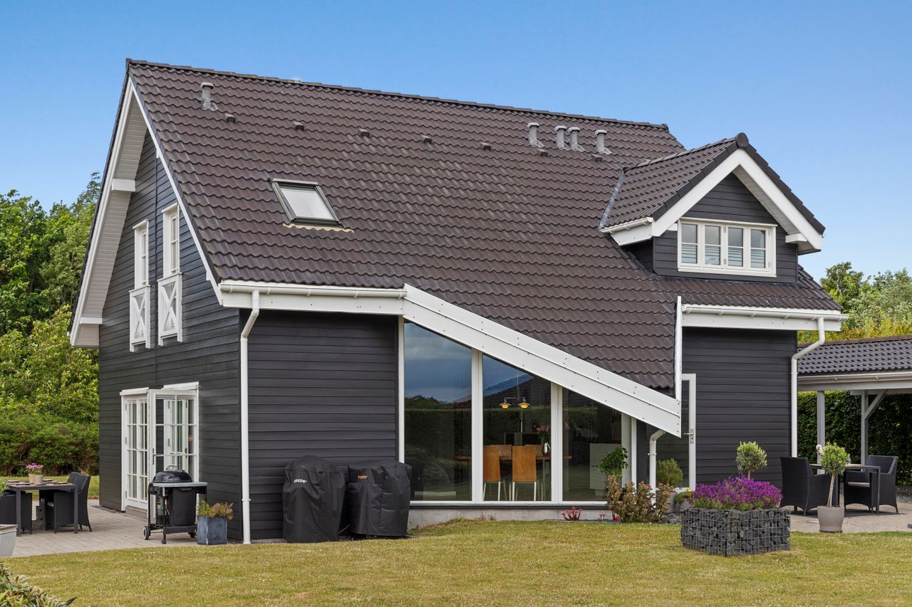 Sortmalet træ, hvide sprossevinduer, kviste og arkitektoniske detaljer, der bliver ved med at fange blikket – dette hus ligner ikke noget andre. Her får du en smuk bolig med personlighed og karakter, hvor lyset danser over gulvene, og skoven står som en fast kulisse på den anden side af vejen. Træet giver huset et særligt indeklima – varmt, naturligt og levende – og det hele fremstår så velholdt, at det næsten føles nyt.