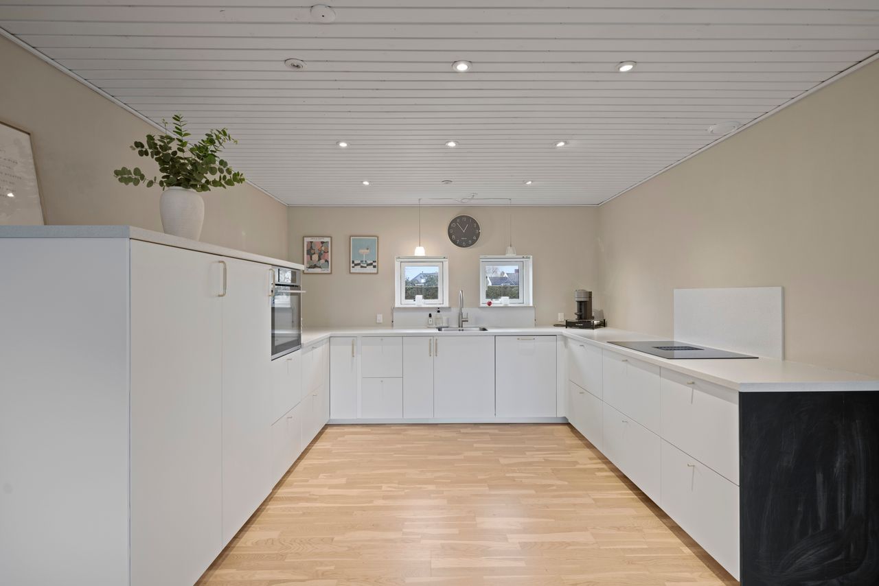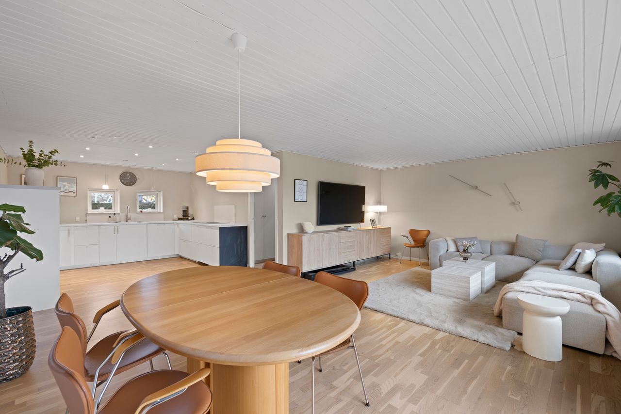 Det store åbne leverum giver masser af plads og åbner sig mod haven, så lyset får lov at fylde. Det istandsatte hvide køkken med smukke greb og Quooker, som sørger for lækkert vand i flere former ligger åbent mod spisepladsen. Her samles man om både morgenkaffe og middage, der gerne må trække lidt ud. Stuen har sin egen rolige afdeling til sofahygge De 3 gode værelser giver fine muligheder for både børn og voksne, og det ene fungerer som en selvstændig forældreafdeling med adgang til eget meget flot badeværelse med både bruseniche og badekar – et lille stille helle. Dertil kommer endnu et badeværelse i samme virkelig flotte stil, så helheden står smukt, nordisk og helt tone i tone.