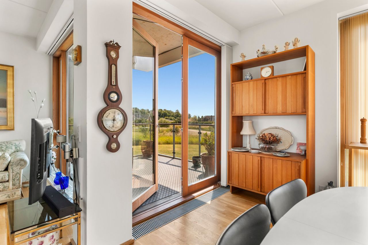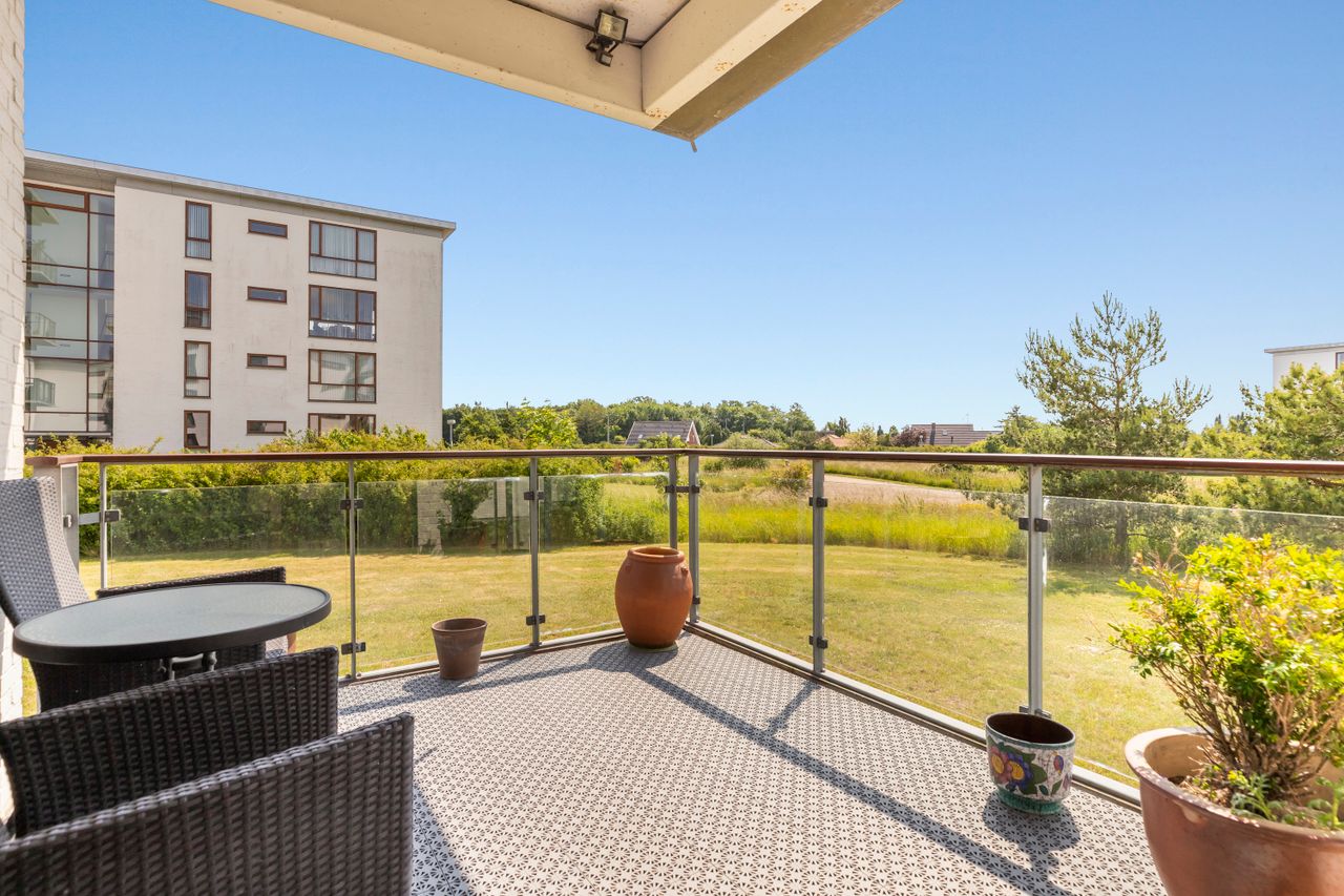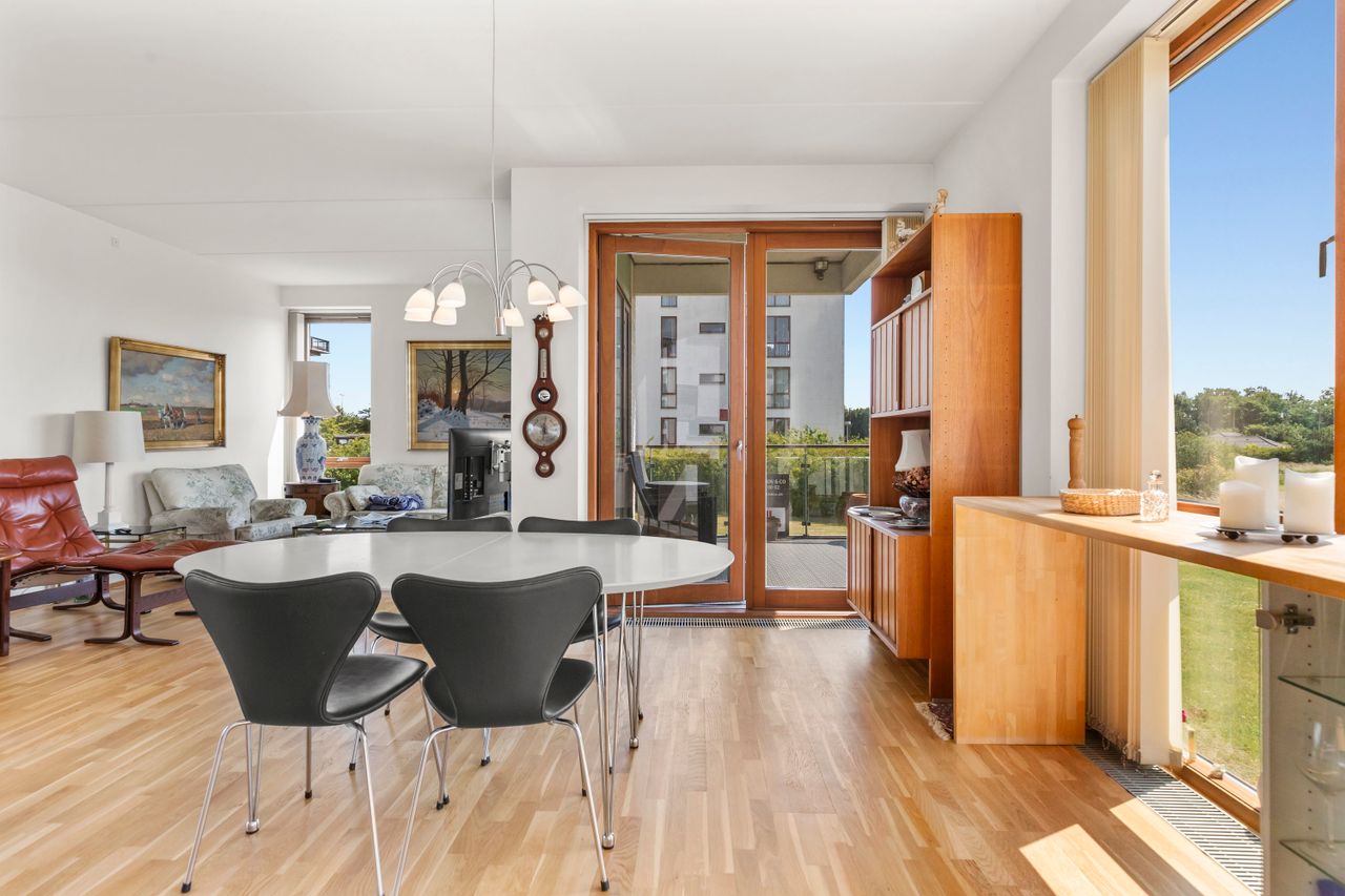Altanen åbner sig mod solen og det grønne – et stille uderum, hvor dagen kan begynde med kaffe og lys, og slutte med aftensol og udsigt. Herfra træder man ind i hjemmets hjerte: et åbent og harmonisk opholdsrum, hvor køkken, spisestue og stue flyder sammen i én bevægelse. Rummet er skabt til både ro og nærvær – til hverdagens rytme og de lange samtaler, der får lov at blive hængende. Køkkenet står med rene linjer og klassiske, hvide HTH-elementer, som åbner sig mod resten af rummet og lader samtalen fortsætte, mens der laves mad. Lejligheden rummer to soveværelser – det ene med direkte adgang til badeværelset, det andet oplagt som børneværelse, kontor eller gæsterum. Badeværelset kan også nås fra det separate toilet, og begge rum er holdt i samme lyse, enkle stil med bruseniche, vaskesøjle og gulvvarme.