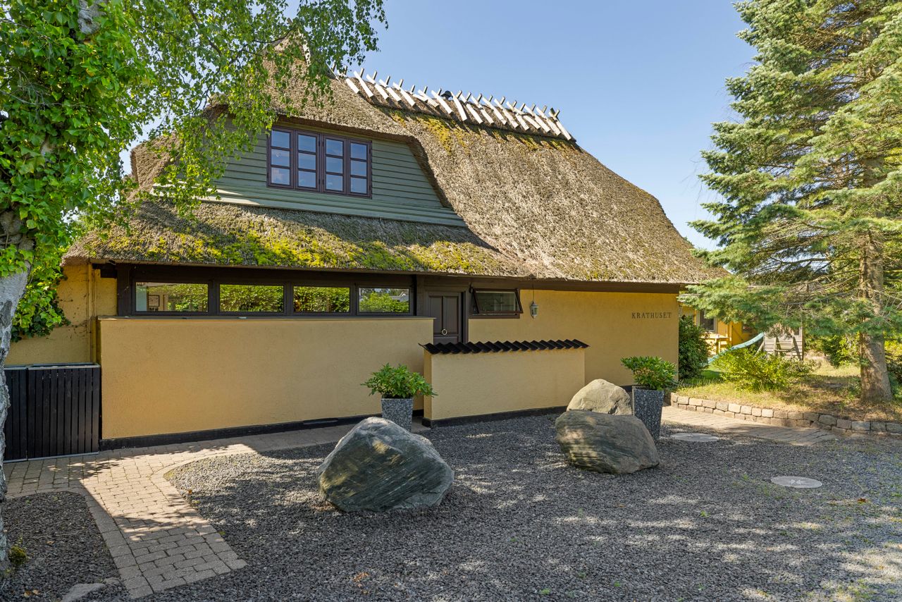 Med strå på taget, historie i væggene og lyng i forhaven står Krathuset som kvarterets ældste og absolut fineste dame - opført i 1932 af en hattemager fra København, der fandt sit fristed her blandt krat, klitter og havudsigt. Dengang lå huset alene. Siden voksede vejen frem omkring det og fik sit navn netop efter huset. Krathuset er ikke længere bare et sommerhus. Det er en sjælefuld helårsbolig fyldt med kærlighed, gemt bag sprossede vinduer og med bølgeskvulp og havgus, som nærmeste følgesvende.