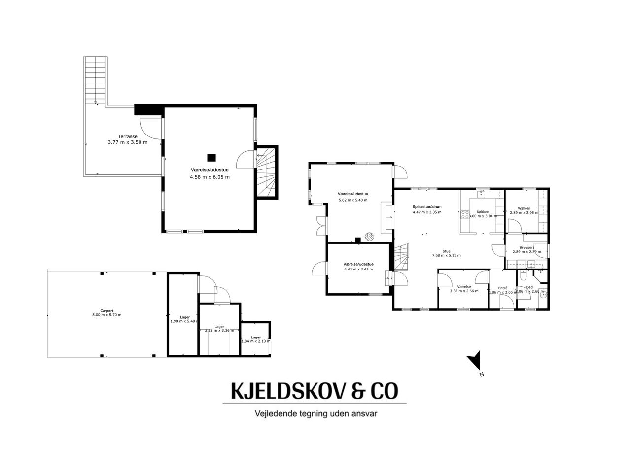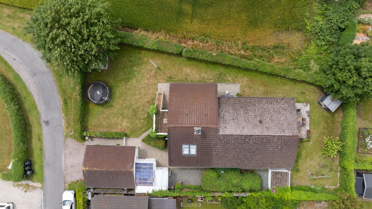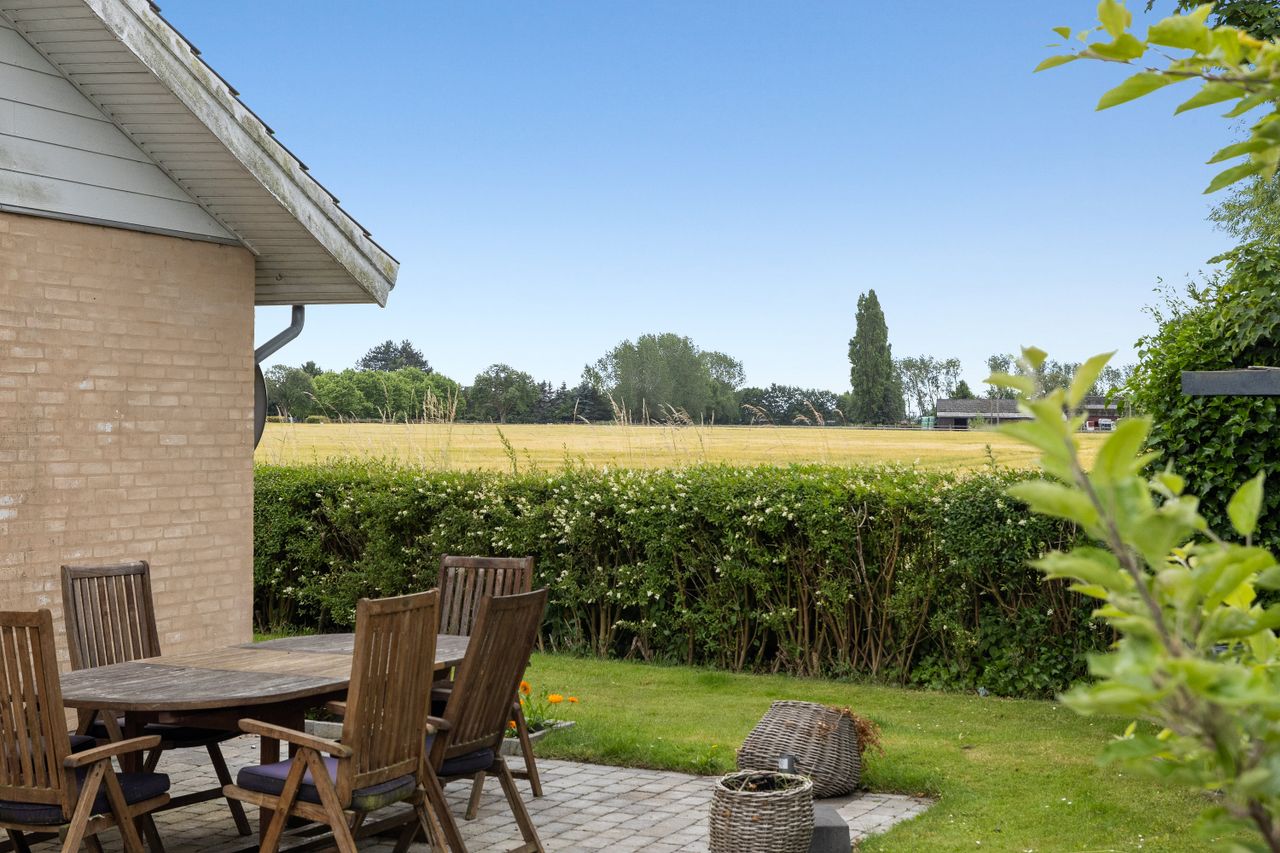 Nordisk stil – ude som inde. De lyse facader, de hvide sprossevinduer og det rolige arkitektoniske udtryk fortæller allerede udefra, at her venter noget særligt. Indenfor fortsætter stemningen – i lyset, i materialerne og i detaljerne. Der er noget let og naturligt over det hele. Hvide lofter med synlige bjælker, lyse gulve og ludbehandlede døre danner en rolig baggrund for hverdagslivet. Køkken-alrummet åbner sig mod markerne med et stort vindue, hvor udsigten næsten bliver en del af interiøret. Her samles man, her leves livet. Designa-køkkenet i lyst træ står klart og ærligt med rene linjer, god plads og praktiske detaljer som quooker og åbne flader til både madlavning og nærvær. Et par trin ned fører til stuen – et lunt og venligt rum med brændeovn og udgang til haven. I stueplan ligger tre værelser – det ene indrettet som walk-in – samt et badeværelse med muret bruseniche, gulvvarme og rainshower, som et lille drys af hverdagsluksus. (Stue og 2 værelser har status af udestue). Førstesalen er et charmerende fristed. Det store soveværelse med skråvægge og synlige spær har direkte udgang til en privat terrasse, hvor morgenlyset strømmer ind, og dagen begynder stille – med udsigt og luft omkring sig. Heroppe føles det som at bo i sin egen verden.