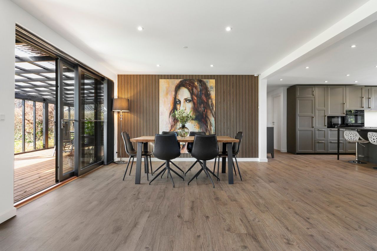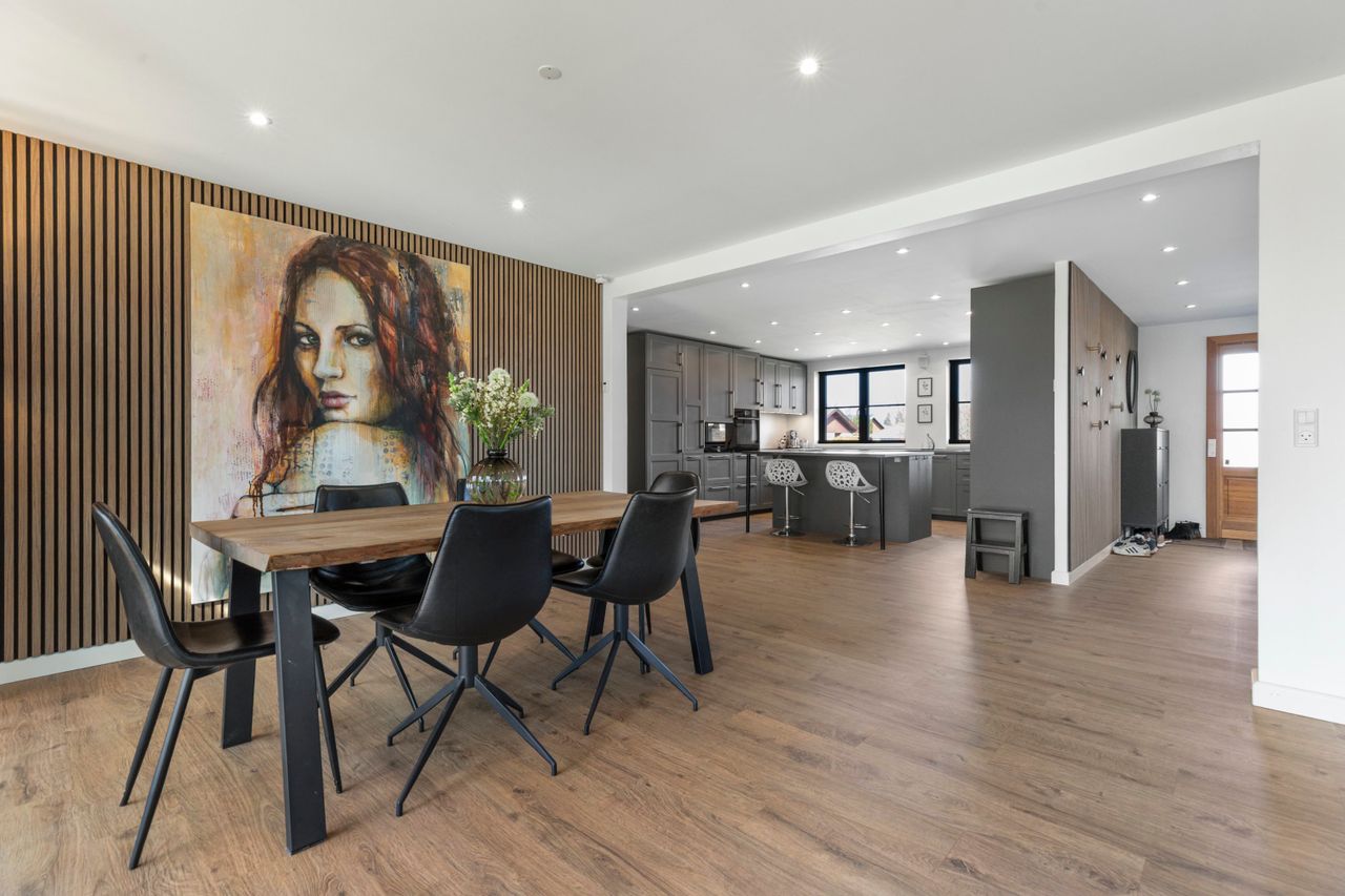 Alt står snorlige fra gulv til loft og varmen under fødderne – og stilen sender tankerne mod hotelstemning og New Yorker vibes, hvor både stil og kærlighed til detaljen løfter hverdagen. Det nye samtalekøkken i smuk grå nuance har en fritstående køkken-ø og med plads til høj stole – her mødes samtaler og madlavning helt naturligt. En dekorativ akustik lamelvæg markerer spiseområdet med langbord, mens skydedøren åbner mod terrassen og trækker lyset helt ind. I vinklen ligger stuen med det store hjørnevindue – her kan du synke ned i sofaen og lade dagens tempo falde blødt til ro. I stueplan finder du også et godt værelse samt et stilrent gæstetoilet. Forældresoveværelset har privat adgang til walk-in-closet og et badeværelse med fritstående badekar, dobbelte håndvaske og stor bruseniche med rainshower – en suite med hotelstemning. Virkelig god og anvendelig underetage/kælder føjer en ekstra dimension til boligen. Tre disponible rum og endnu et nyt hvidt gæstetoilet suppleres af et imponerende multirum med plads til det hele – fest, træning, hobby eller teenageliv.