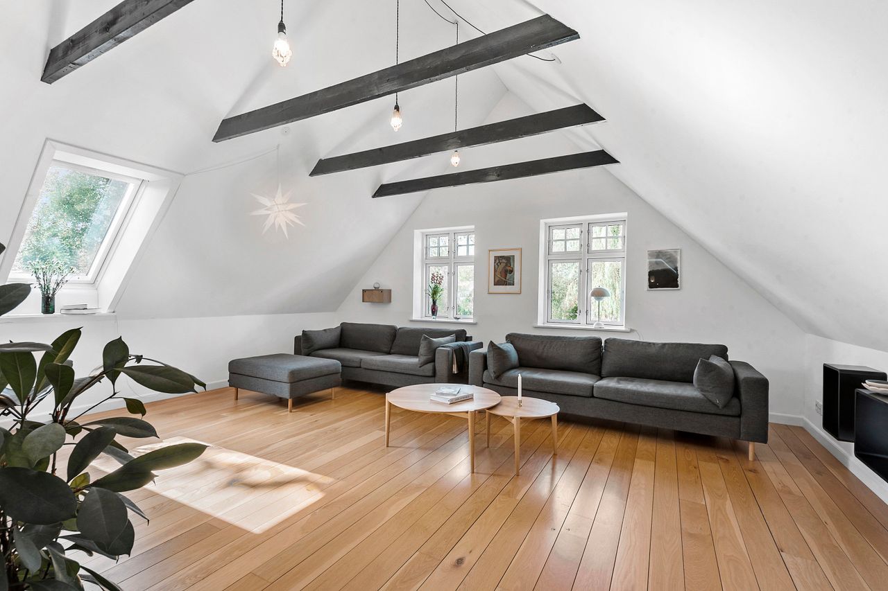 En herskabelig velkomst får du i den store hall med klassisk skakternet flisegulv, hvor den smukke trappe løfter blikket mod førstesalen – og videre op til en stue med lofter til kip og frie hanebånd. Herfra har du udsigt til gadekæret – og det særlige lys, der bevæger sig over vandet dagen igennem. Reposen kan indrettes til med skrivebord eller kreativ krog, og etagen byder desuden på tre værelser og et rummeligt lækkert badeværelse med dobbelte håndvaske samt rainshower og glasdør til bruseniche. I stueetagen et skønt stort vinkelformet rum samler køkken, alrum og spisestue i ét – lyst og venligt med dobbeltdøre til den overdækkede terrasse og glasdør til haven. I 2021 blev køkkenet fornyet og står i dag hvidt og tidløst med mørk bordplade – og et eksklusivt gaskomfur, der bringer madlavningen op på næste niveau. Rummet har plads til både langbord, læsehjørne og samtaler, der bliver hængende længe. I stueplan er der også tre værelser og en ekstra stue med stort vinduesparti og egen udgang til haven – et tidligere erhvervslokale, der i dag fremstår som et lyst og venligt rum med plads til både nærvær og nye idéer. Overalt i boligen ligger flotte, massive gulve i eg – varme i tonen og med en rolig fornemmelse under fødderne og binder rummene sammen med samme sikre stil som kendetegner huset.