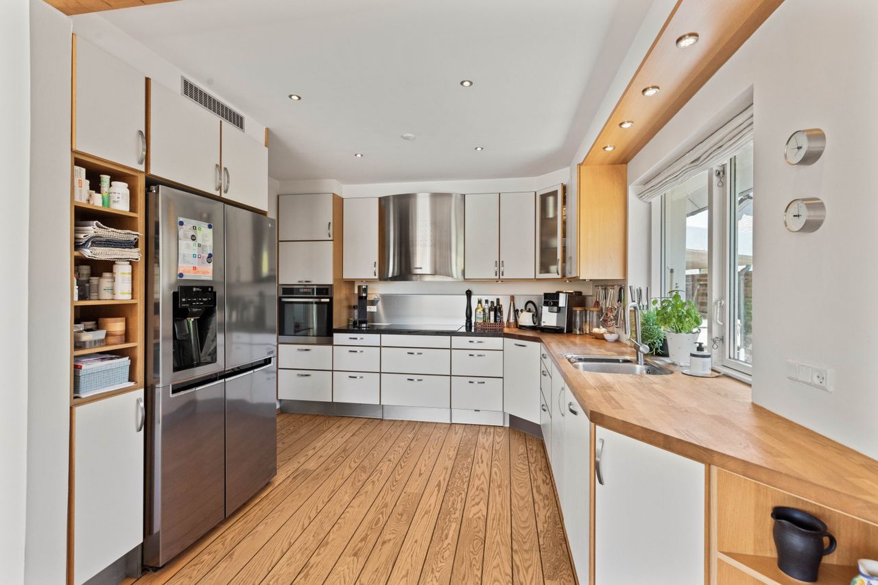 Boligen folder sig ud i forskudte plan med en klassisk hvid trappe, der skaber flow mellem rummene. Det stilrene HTH-køkken er centralt med amerikansk køleskab og plads til samvær. Spisestue/alrummet forbinder til terrassen, mens opholdsstuen imponerer med store vinduer og udgang til vestvendt balkon. To lyse børneværelser med eget badeværelse ligger på et niveau, og forældreafdelingen øverst er en privat oase med loft til kip, gavlvindue, luksuriøst badeværelse og walk-in-closet.