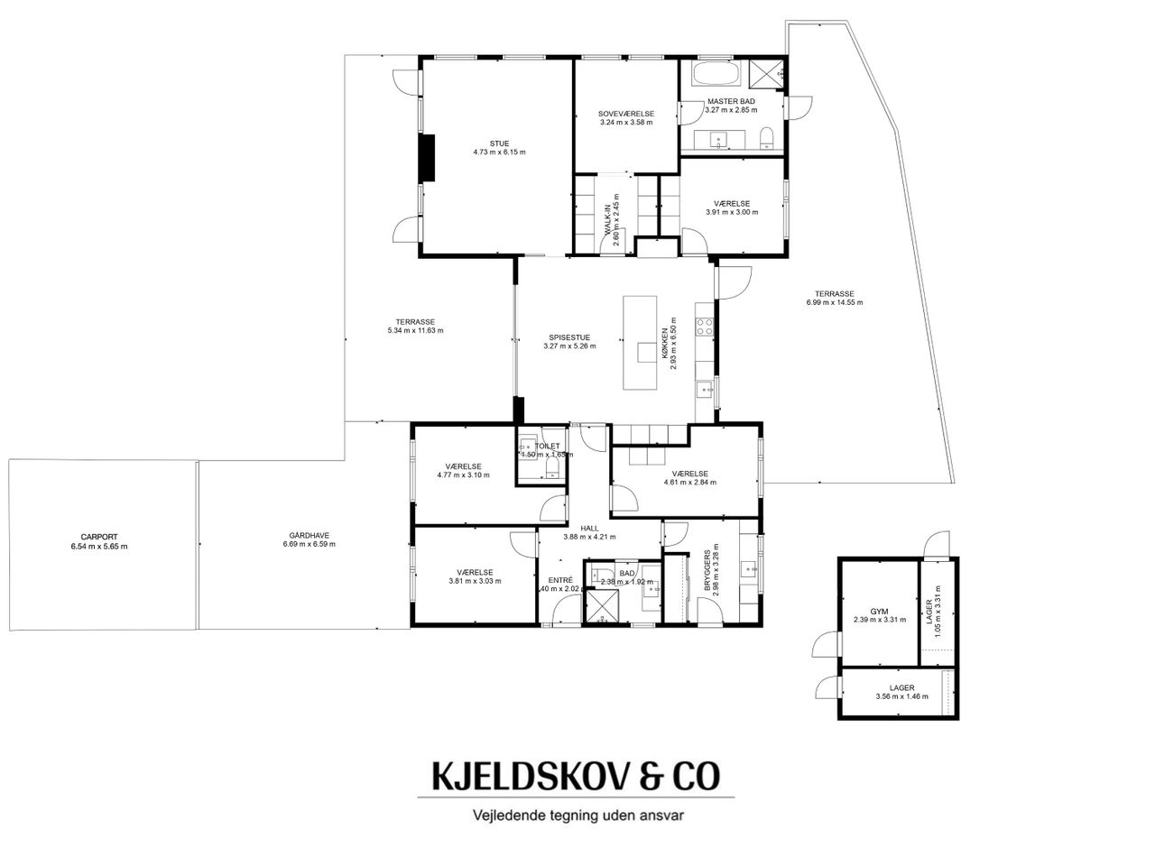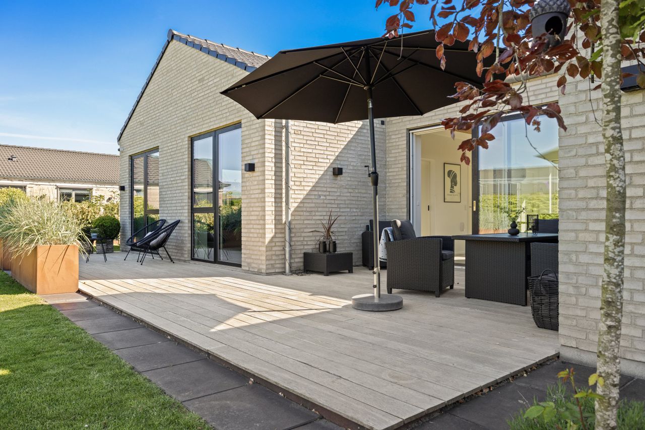 Et hav af lys strømmer ind gennem de store vinduespartier og lader rummene folde sig ud med en sjælden fornemmelse af åbenhed og luft. Ovenlyset over køkkenøen kaster en blid glød over det store samtalekøkken og alrummet, hvor madlavning og måltider får plads til at trække ud og samle jer om hverdagen. Det grå HTH-køkken er nøje udvalgt med fokus på både æstetik og funktion, og køkkenøen med høje stole bliver hurtigt det naturlige samlingspunkt. Stuen – et lyst og roligt opholdsrum med store vinduespartier og direkte udgang til den vestvendte terrasse. En oplagt ramme om afslapning, fællesskab og rolige aftener. Planløsningen skaber tydeligt adskilte afdelinger – helt perfekt til både små og store. Forældresuiten rummer et soveværelse med adgang til terrassen, et rummeligt walk-in-closet og eget badeværelse med fritstående badekar og elegant glasbruseniche – en fredelig og velindrettet afdeling, hvor velvære har førsteprioritet. Hertil kommer endnu et værelse i forlængelse. I modsatte ende af huset ligger tre store værelser samt endnu et badeværelse. Et gæstetoilet fuldender indretningen. Alt er nænsomt udvalgt og skabt til et liv i balance.