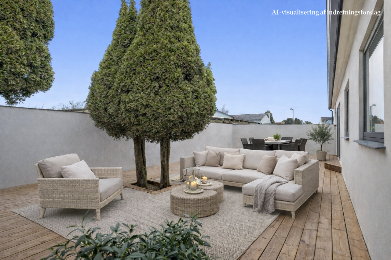 Behagelige gulvvarme breder sig gennem eksklusive egetræsplankegulve og smukke stengulve. 2 luksuriøse badeværelser med smukkeste flodsten, rainshower og sorte Grohe-armaturer – en wauw oplevelse. 4 store værelser giver plads til leg, søvn, lektier og fordybelse. Forældreafdelingen er skabt som en suite med eget lækkert walk-in-closet og direkte adgang til badeværelset. Det integrerede udhus er holdt i præcis samme stil som boligen og bliver en oplagt afdeling til kontor, hobby, teens eller au pair. Et stort unikt rum med køkken, alrum og stue i ét, hvor det beige samtalekøkken med stor fritstående ø samler både mennesker og måltider. Her kan højstolene trækkes frem, samtalerne flyde, og lyset strømme ind gennem de store lodrette vinduer over spisebord og sofahjørne.