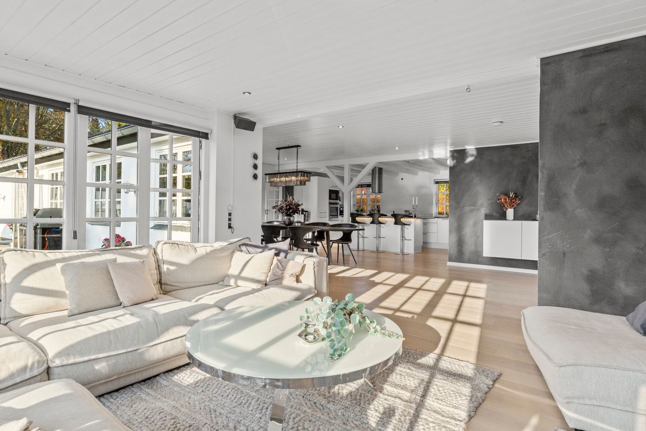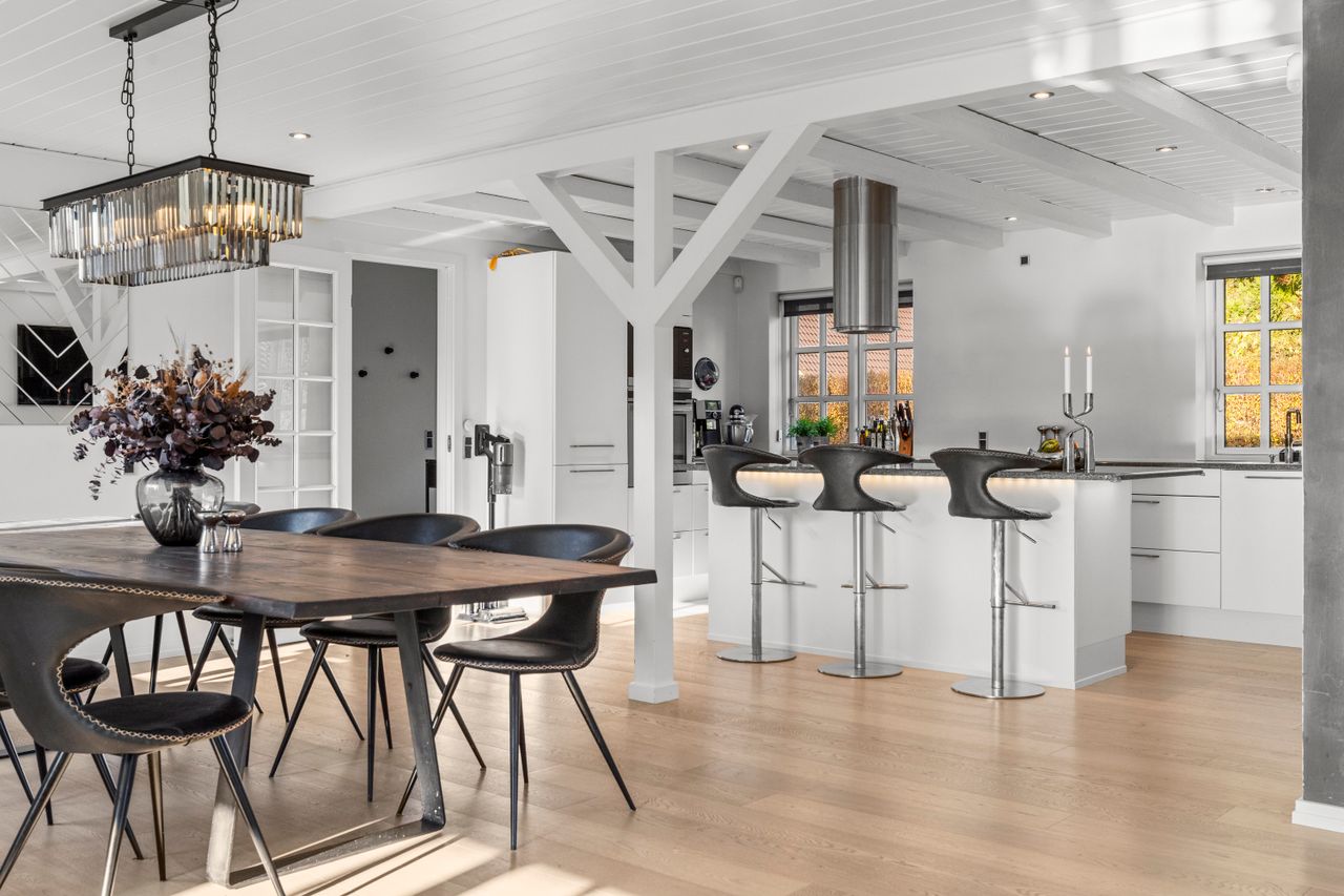 Stilen er så gemmenført lækker i boligen – her vil du bare flytte ind. Lyset falder blødt ind gennem vinduerne og efterlader bløde skygger på de smukke gulve. De hvide trælofter med synlige bjælker giver den helt rigtige atmosfære i det store køkken-alrum og stue område. Sofahygge ved pejsen, lange middage omkring spisebordet og et loungehjørne i den ene ende. Det hvide samtalekøkken står smukt med flot mørk bordplade. Den store køkkenø er en invitation til gode snakke, kaffe og hvor et glas vin får lov at fylde mens maden bliver til. Tre gode værelser – forældreafdelingen et ekstra stort værelse med åbent walk-in og udgang til terrassen, hvor morgenbrisen kan trække ind. To luksuriøse badeværelser – det ene med et smukt fritstående badekar.