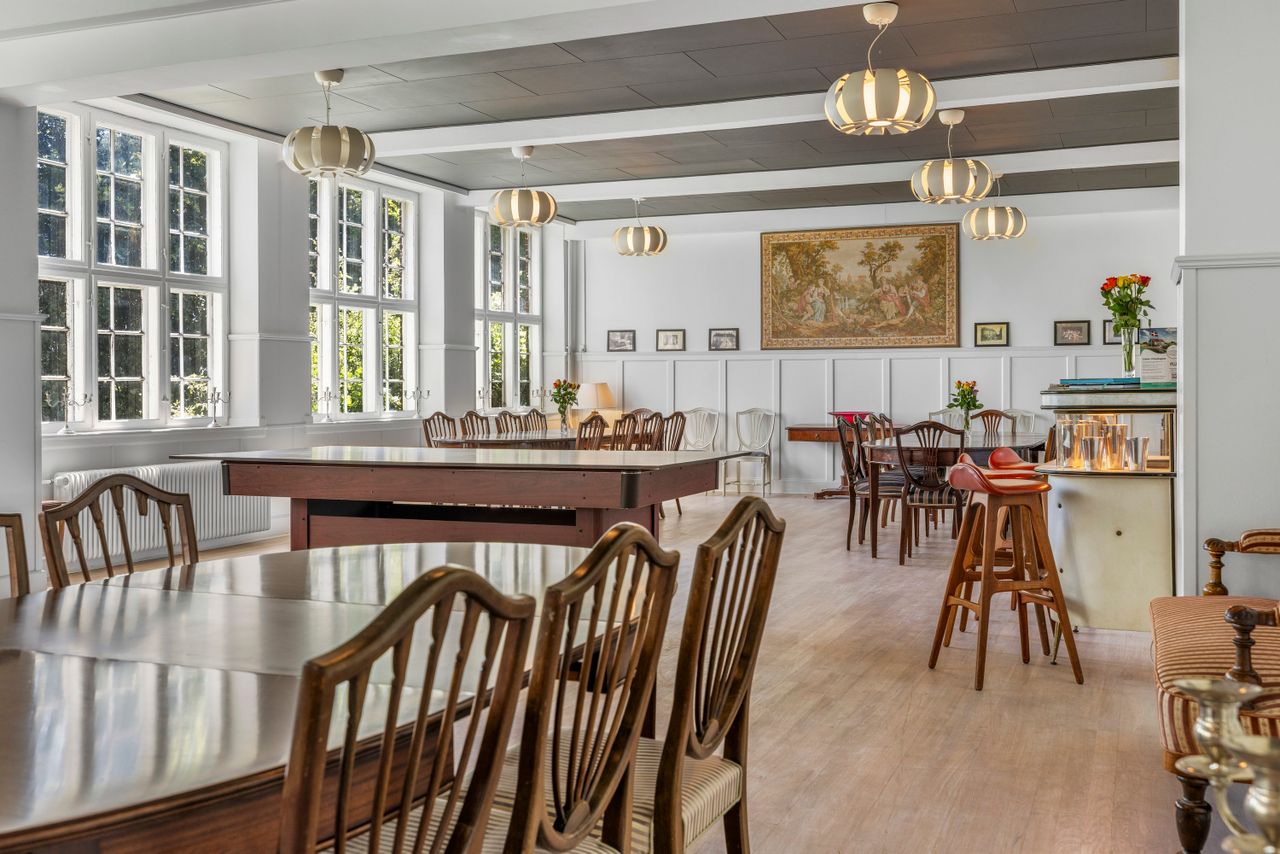 Indvendigt folder den herskabelige stemning sig fuldt ud med højt til loftet, paneler, store stuer og en imponerende hall med bred trappe til førstesalen. Køkken og opholdsrum hænger naturligt sammen, og huset rummer mange værelser, flere badeværelser og gæstetoiletter – alt smagfuldt indrettet med respekt for det oprindelige.