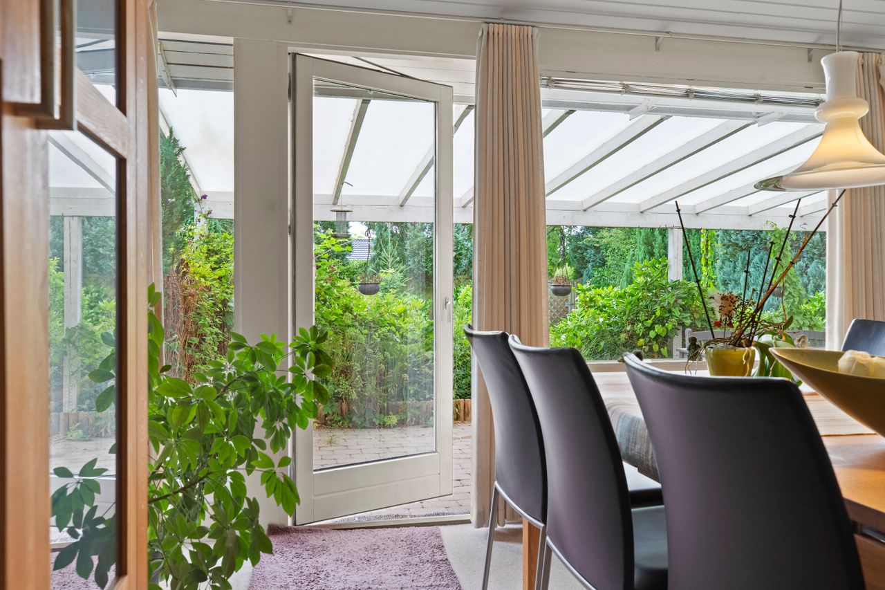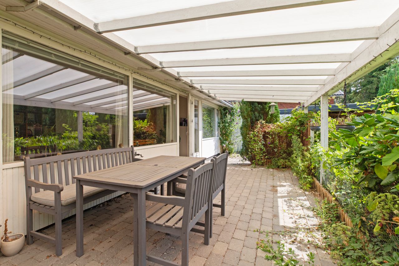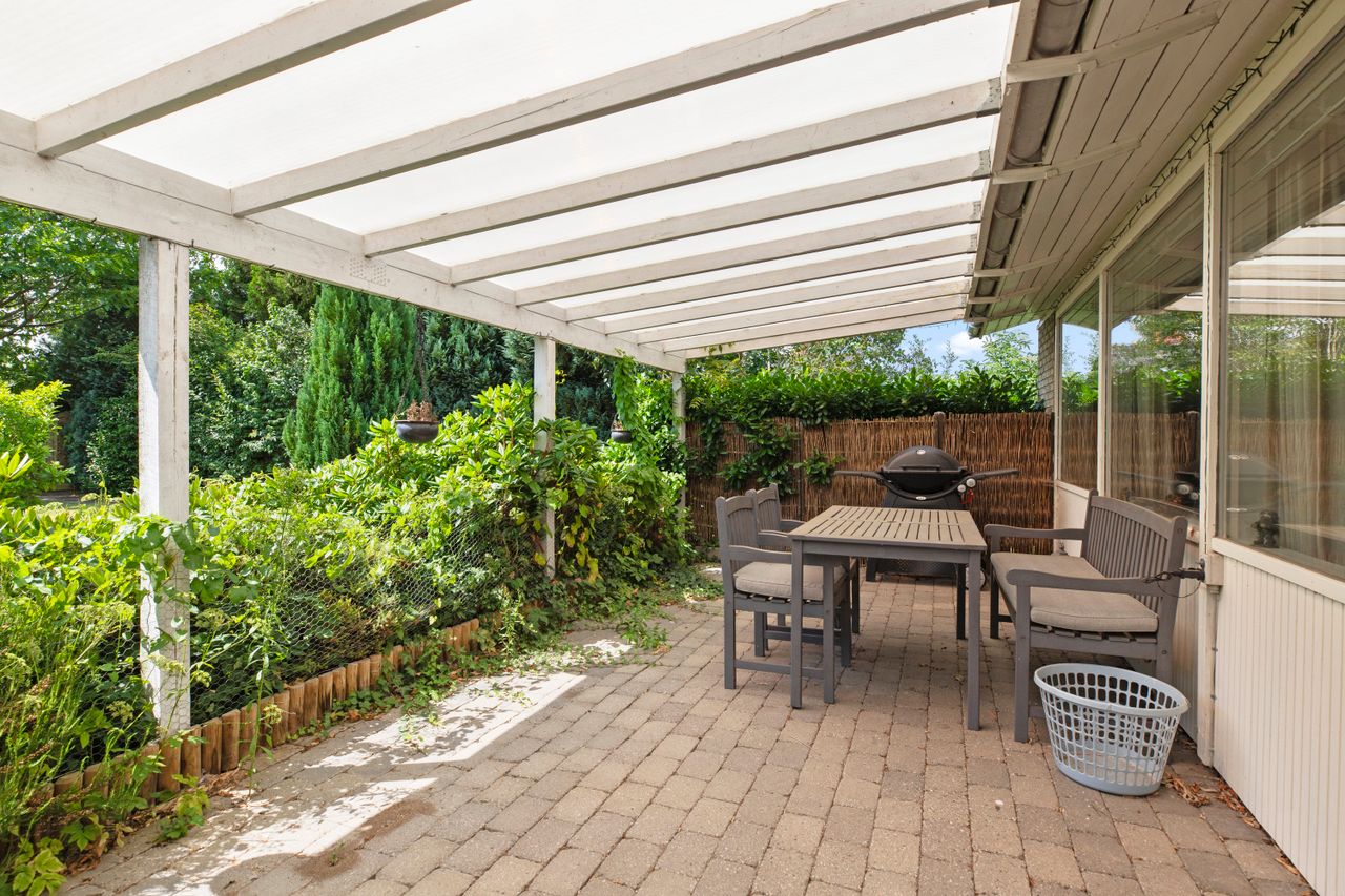 Haven er en fredelig og privat plet med smukke, gamle buske, blomstrende rhododendron og grønne træer, der giver både karakter og læ. Her er sol fra morgen til aften, og græsset ligger klar til både leg og loungemøbler. En overdækket terrasse og en udestue forlænger sommeren i begge ender, og carporten står klar til bilen. Bag hækken snor stien sig ud i de grønne omgivelser – mod åen, engen og søområdet, hvor man kan løbe, gå eller bare gå i stå og nyde stilheden. Og samtidig bor du på en lille, rolig villavej med kort afstand til skole, fritidstilbud, indkøb og stranden, der kun er en spadseretur væk.