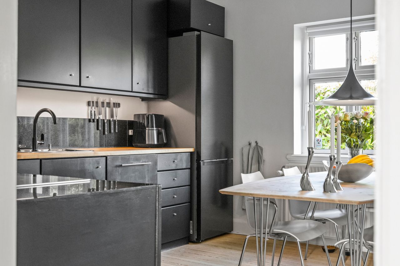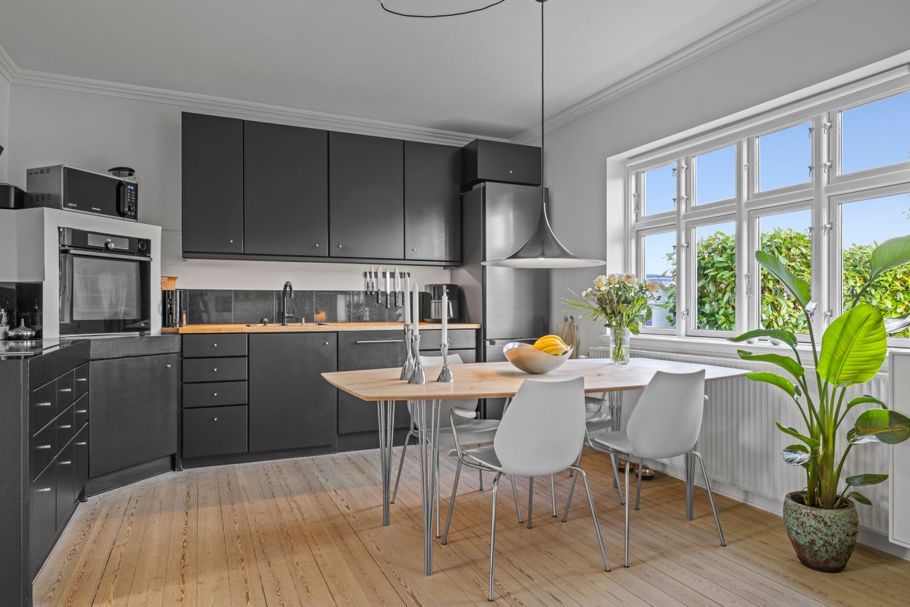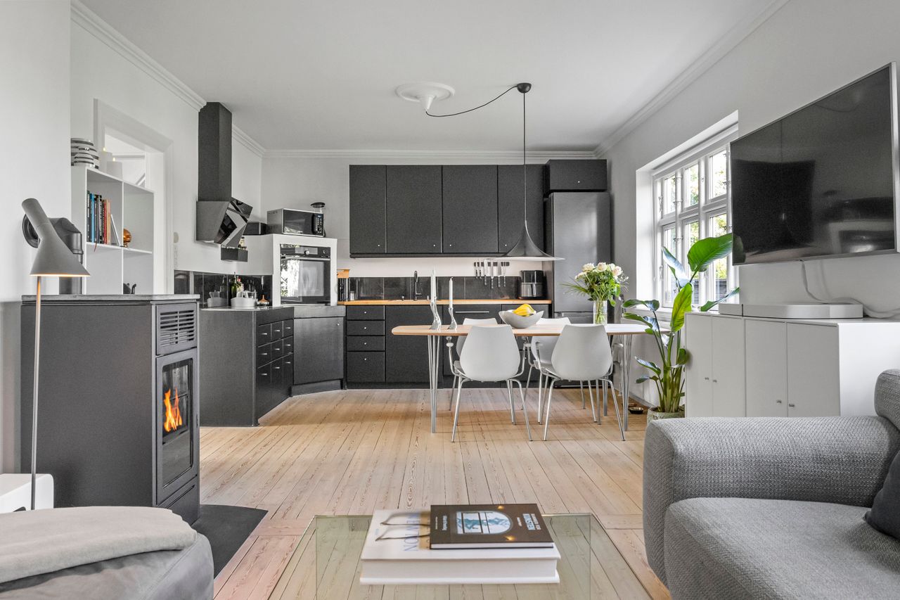 Indenfor møder du herskabelige proportioner med højt til loftet, fyldningsdøre og smukke trægulve. Stueplan rummer et elegant leverum med sort køkken med originale Montana-greb, langbord, sofahjørne og pilleovn. Et værelse i stueetagen giver fleksibilitet, og badeværelset er nyt med store fliser og rainshower. Førstesalen byder på synlige bjælker, loft til kip, værelser med karnapper, hems og lysindfald samt endnu et badeværelse.