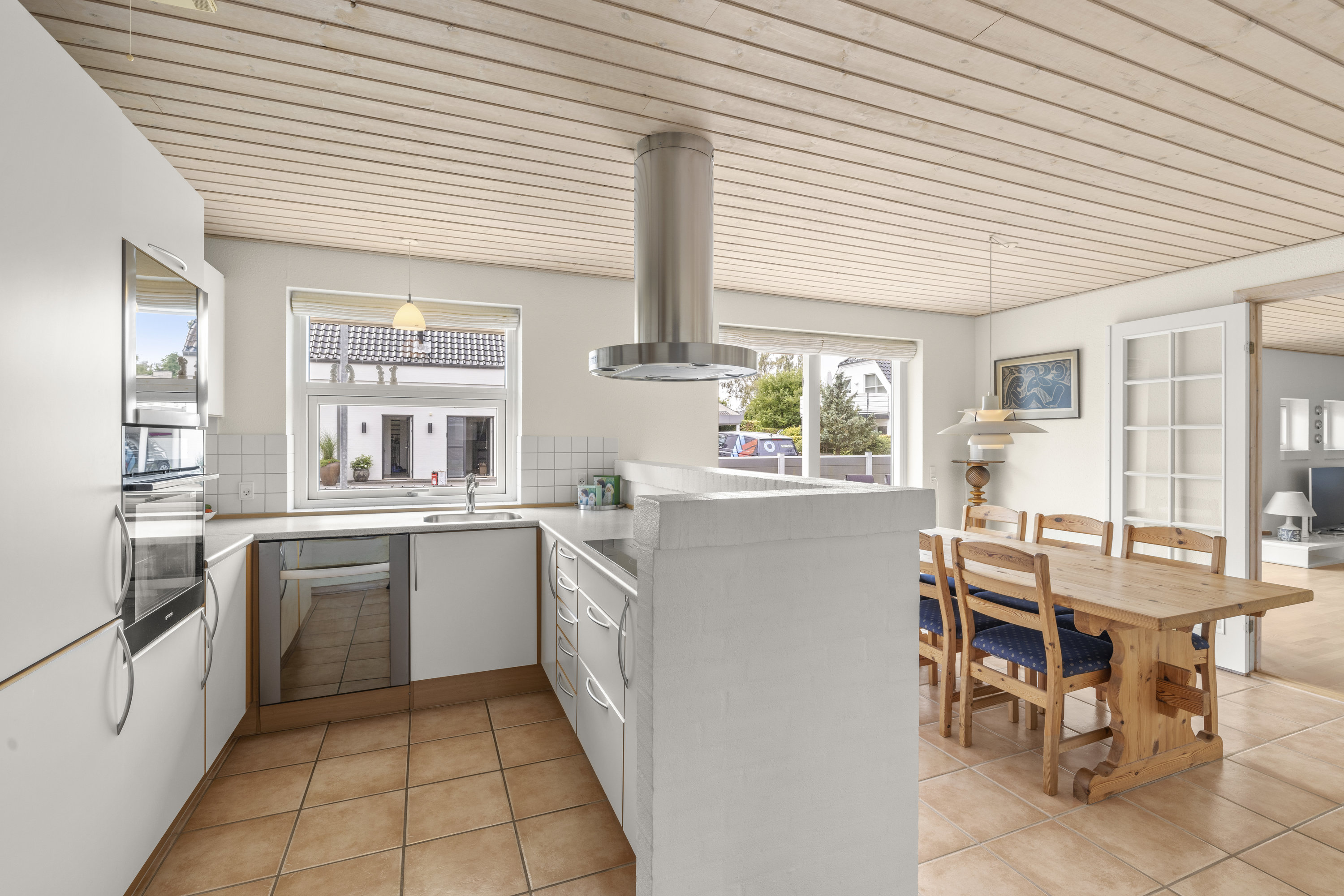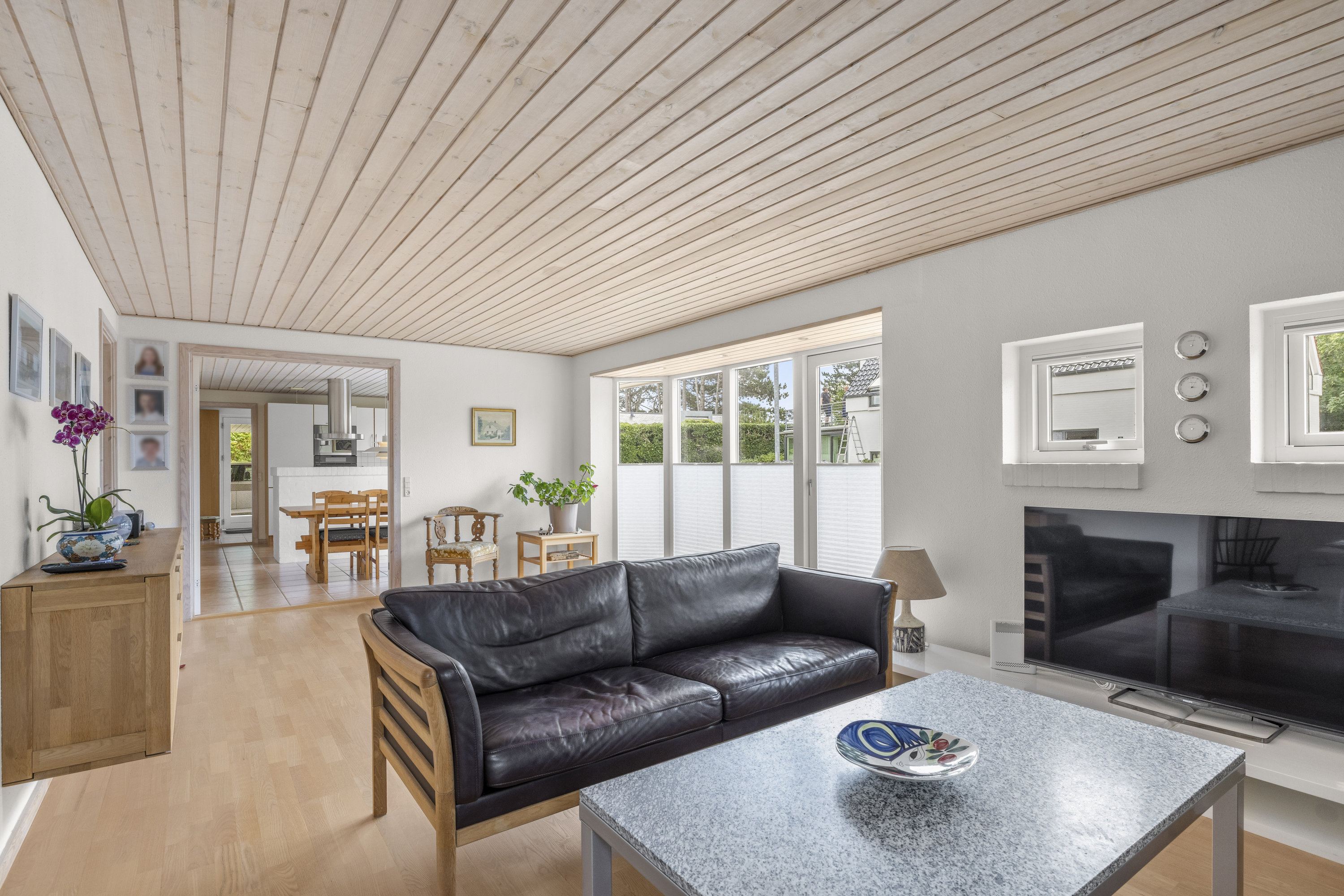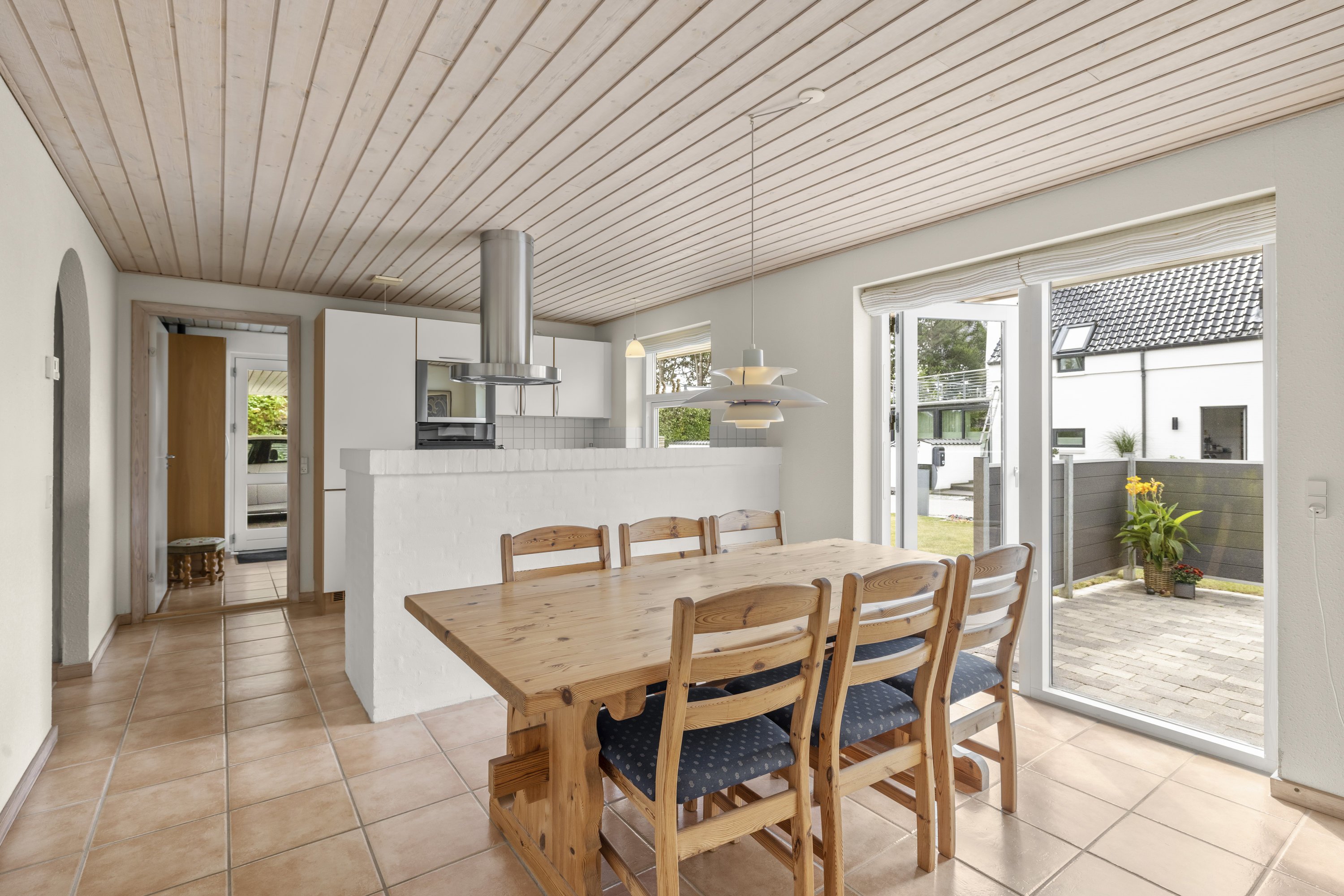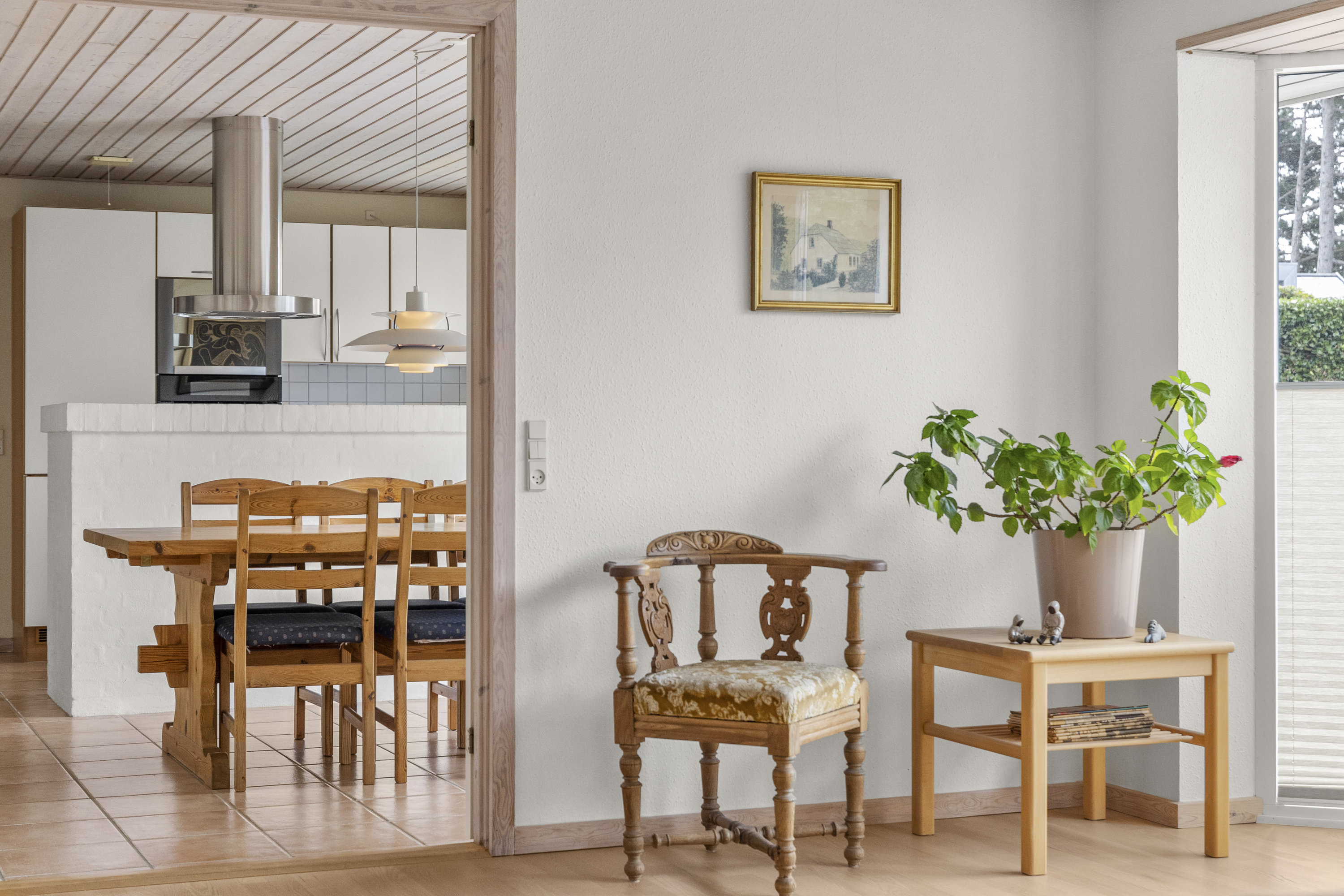 Huset er enkelt, indbydende og båret af den ro, man kun finder i noget, der er blevet passet på gennem mange år. Samme ejer har værnet om hver detalje, og det mærkes i både udtryk og stand. Stuen åbner sig mod haven med en glaskarnap, hvor lyset strømmer ind, og dobbelte franske døre forbinder rummet med køkken-alrummet – husets naturlige samlingspunkt. Det hvide køkken er lyst og åbent, med halvmur mod spisebordet, så samtalen flyder frit, mens madlavningen får lov at tage tid. Fra spisepladsen er der direkte udgang til haven, og her opløses grænsen mellem inde og ude, når døren står åben og sommeren trækker indenfor. Planløsningen er velovervejet med separat forældre- og børneafdeling. Forældresoveværelset ligger afskærmet med eget badeværelse, mens de to øvrige værelser er oplagte som børneværelser, gæsteværelse eller hjemmekontor – afhængig af livet, der leves. Et ekstra badeværelse supplerer, og begge er holdt i lyse klinker og klassisk stil. Overalt er der gulvvarme under de lyse gulve og klinker – en jævn, blid varme, der følger dig fra rum til rum og giver hjemmet en stille komfort.
