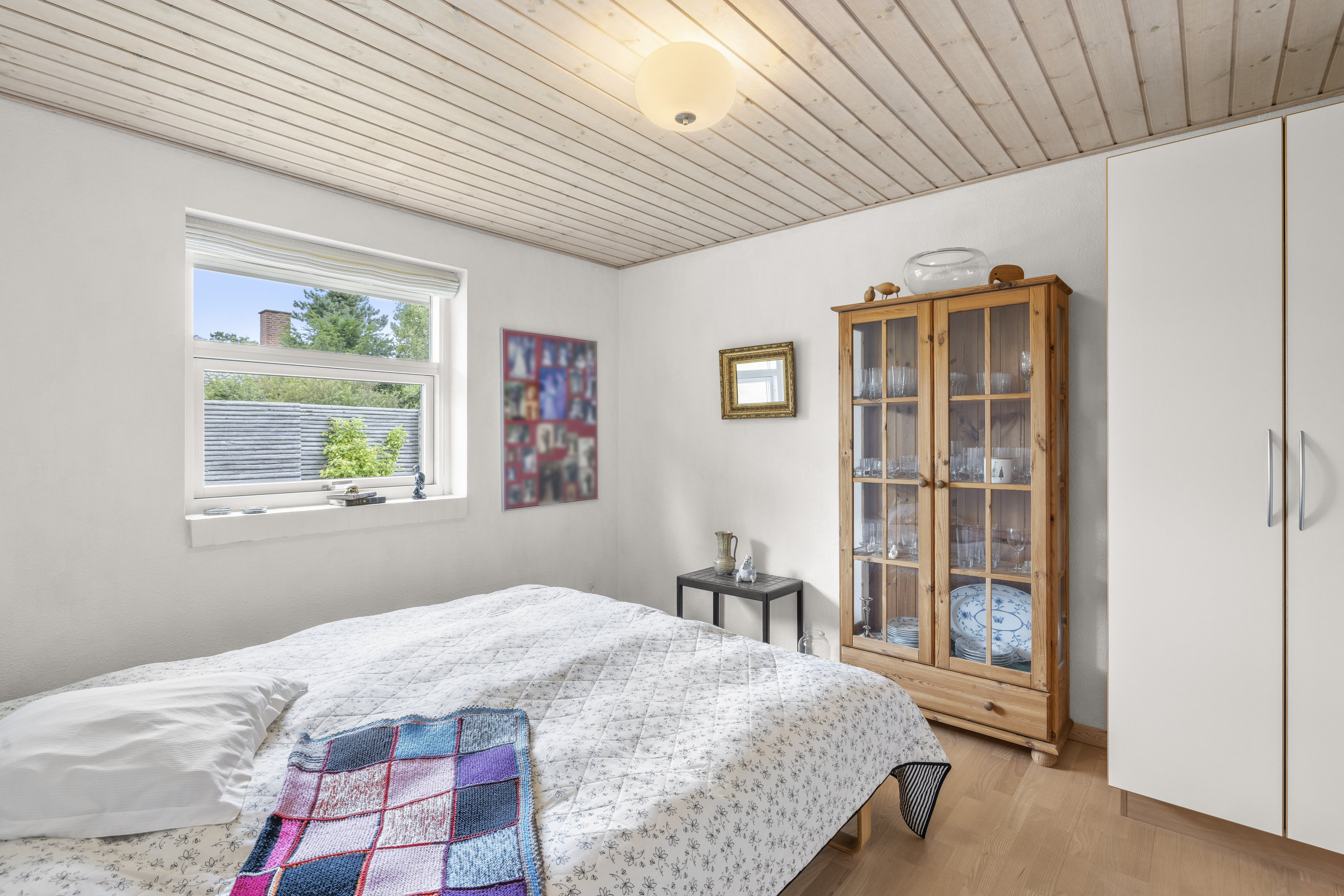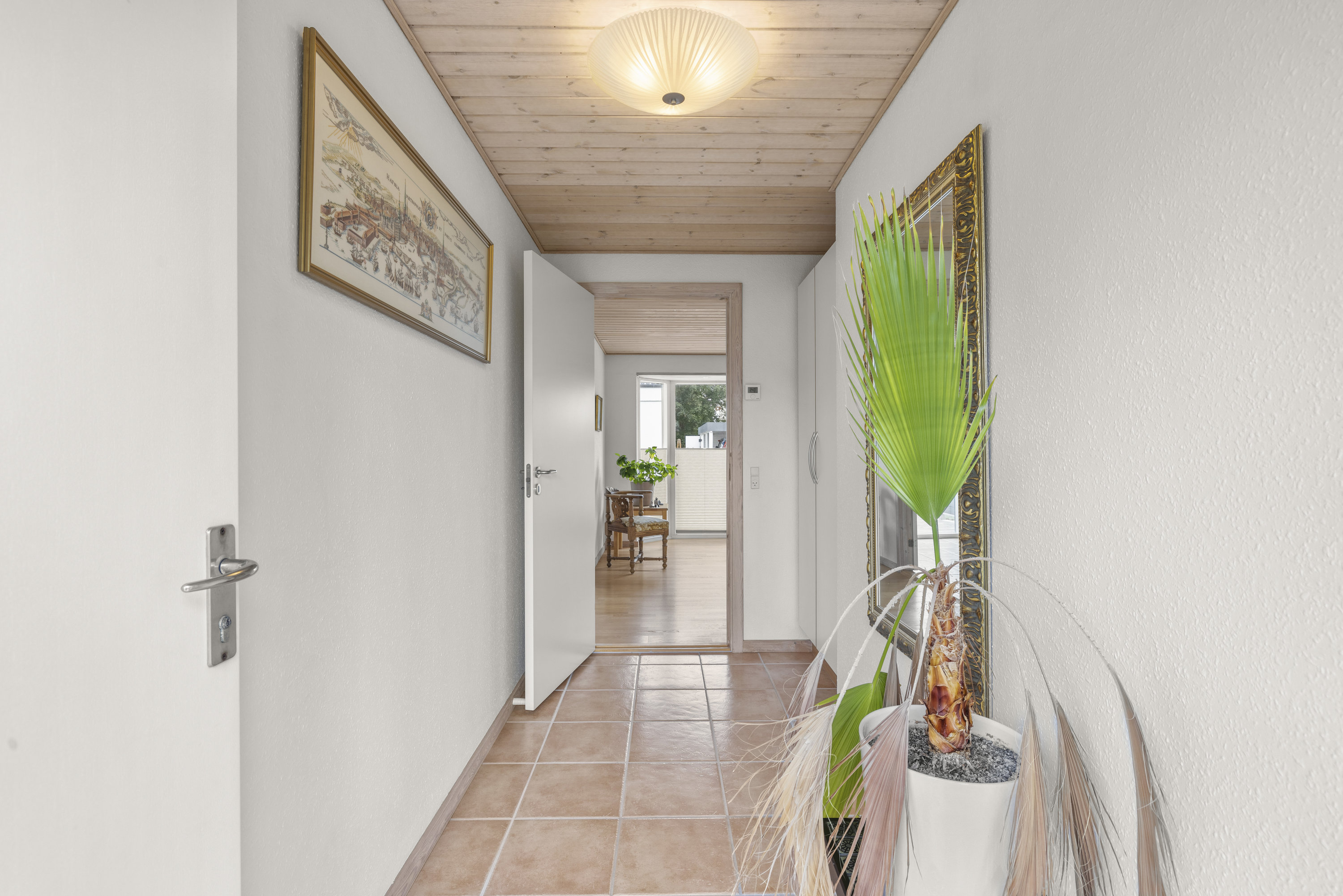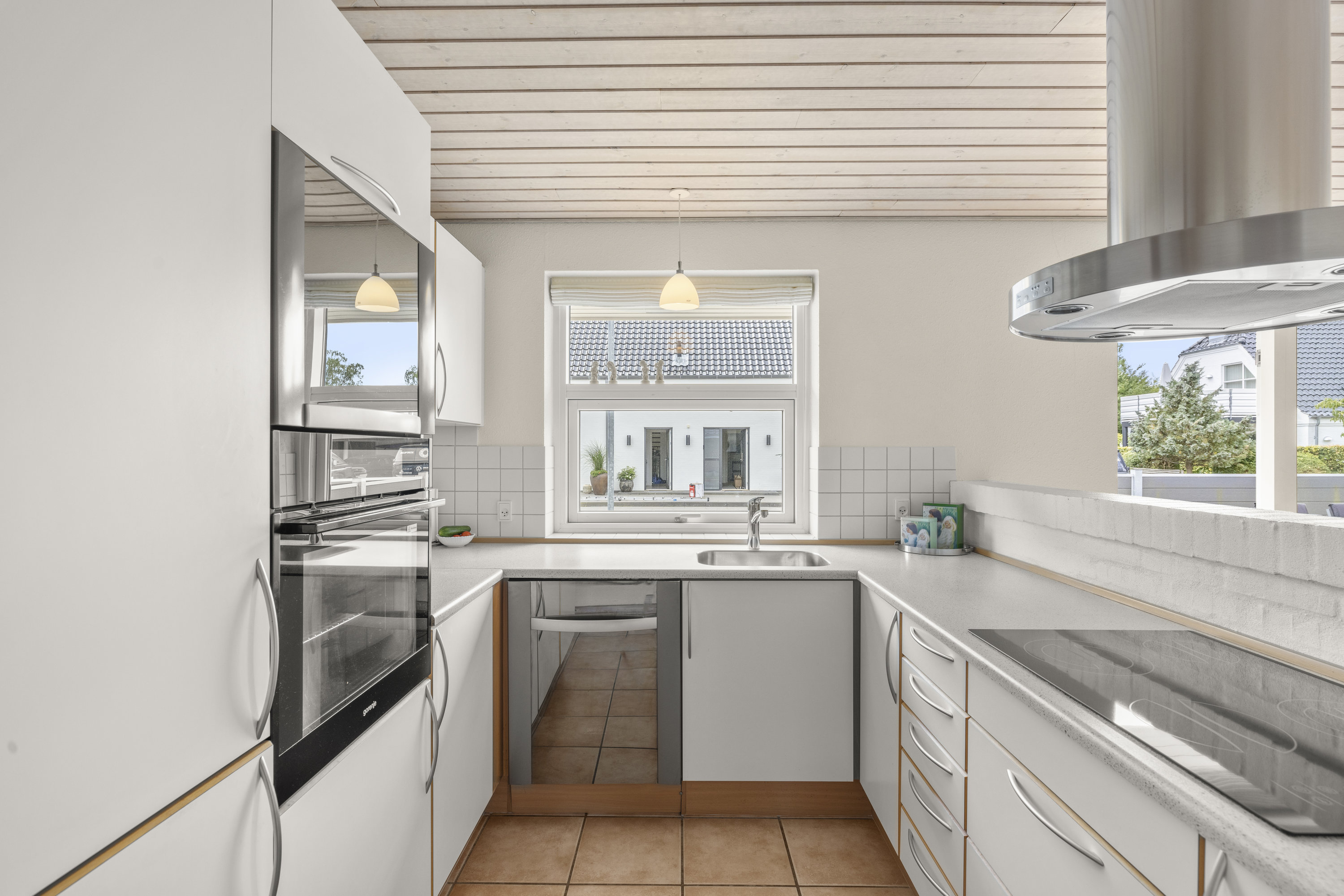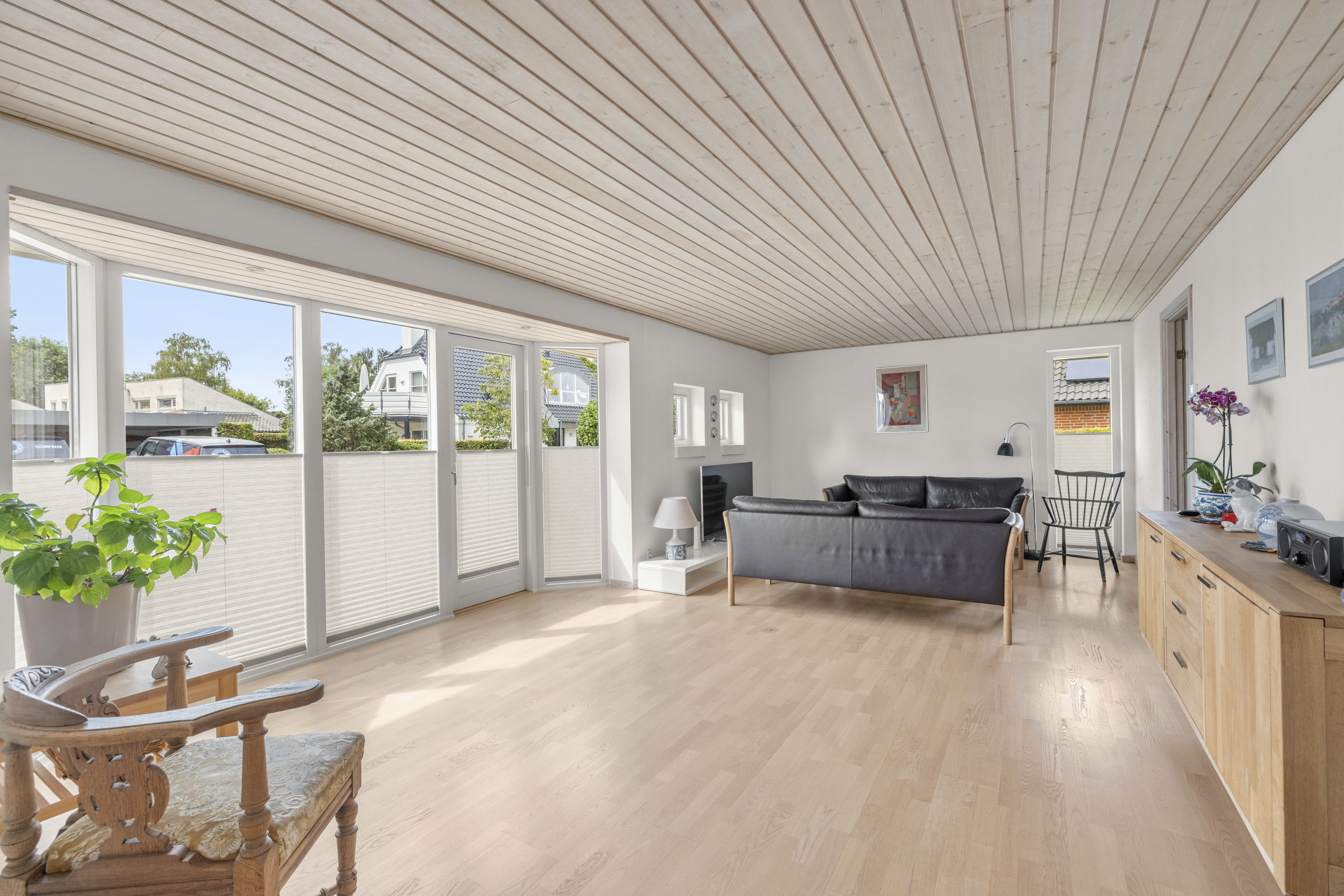Huset er enkelt, indbydende og båret af den ro, man kun finder i noget, der er blevet passet på gennem mange år. Samme ejer har værnet om hver detalje, og det mærkes i både udtryk og stand. Stuen åbner sig mod haven med en glaskarnap, hvor lyset strømmer ind, og dobbelte franske døre forbinder rummet med køkken-alrummet – husets naturlige samlingspunkt. Det hvide køkken er lyst og åbent, med halvmur mod spisebordet, så samtalen flyder frit, mens madlavningen får lov at tage tid. Fra spisepladsen er der direkte udgang til haven, og her opløses grænsen mellem inde og ude, når døren står åben og sommeren trækker indenfor. Planløsningen er velovervejet med separat forældre- og børneafdeling. Forældresoveværelset ligger afskærmet med eget badeværelse, mens de to øvrige værelser er oplagte som børneværelser, gæsteværelse eller hjemmekontor – afhængig af livet, der leves. Et ekstra badeværelse supplerer, og begge er holdt i lyse klinker og klassisk stil. Overalt er der gulvvarme under de lyse gulve og klinker – en jævn, blid varme, der følger dig fra rum til rum og giver hjemmet en stille komfort.