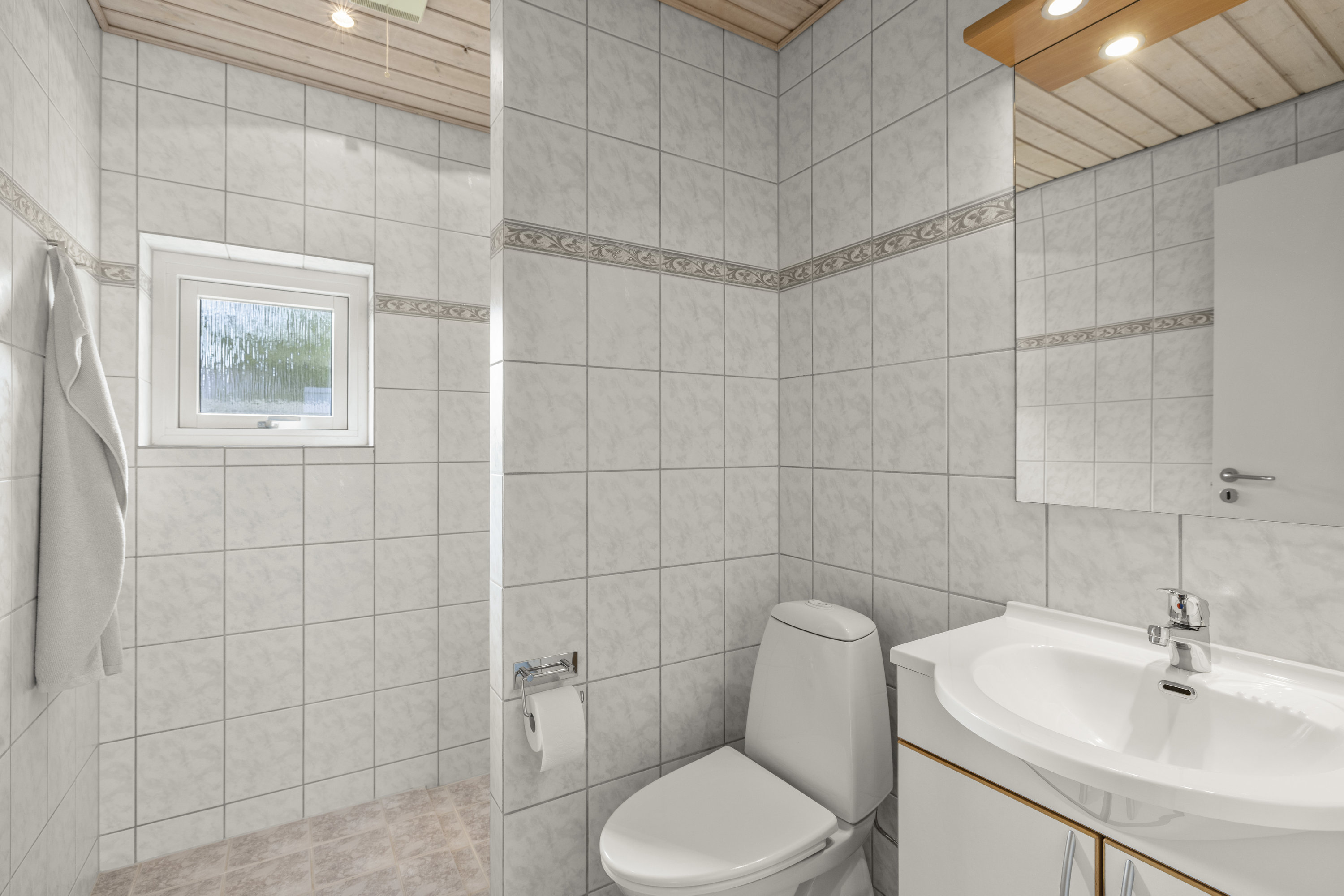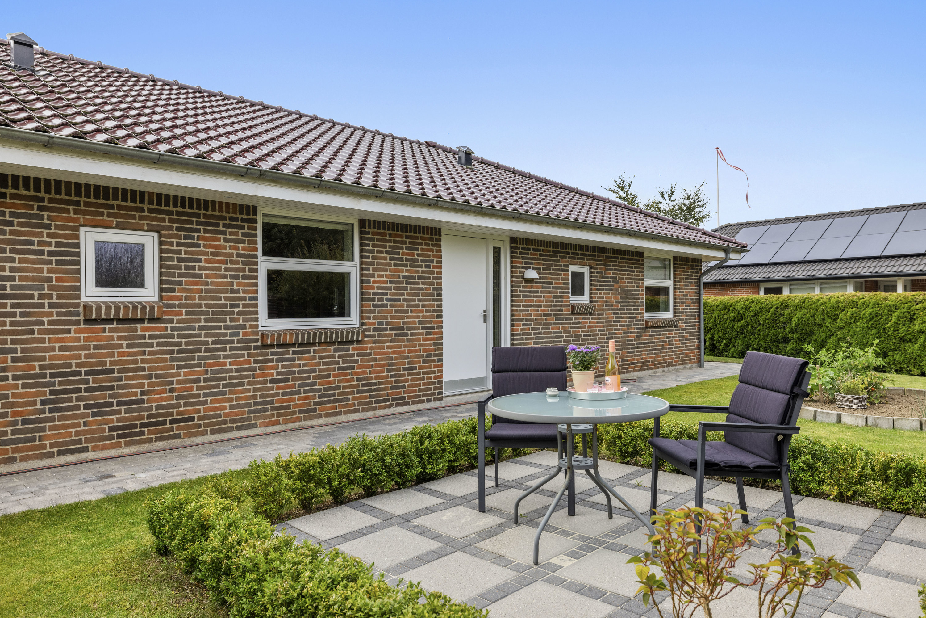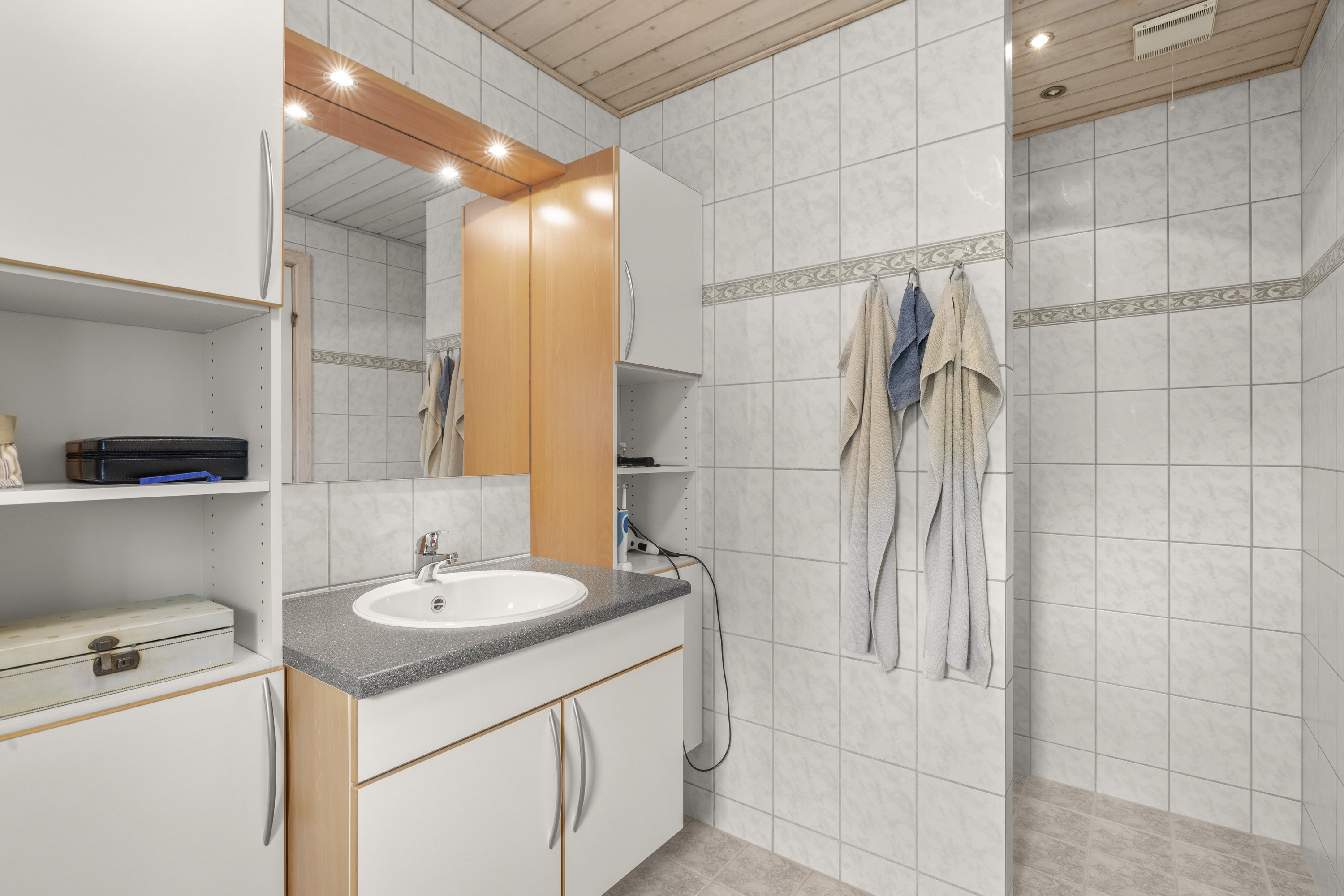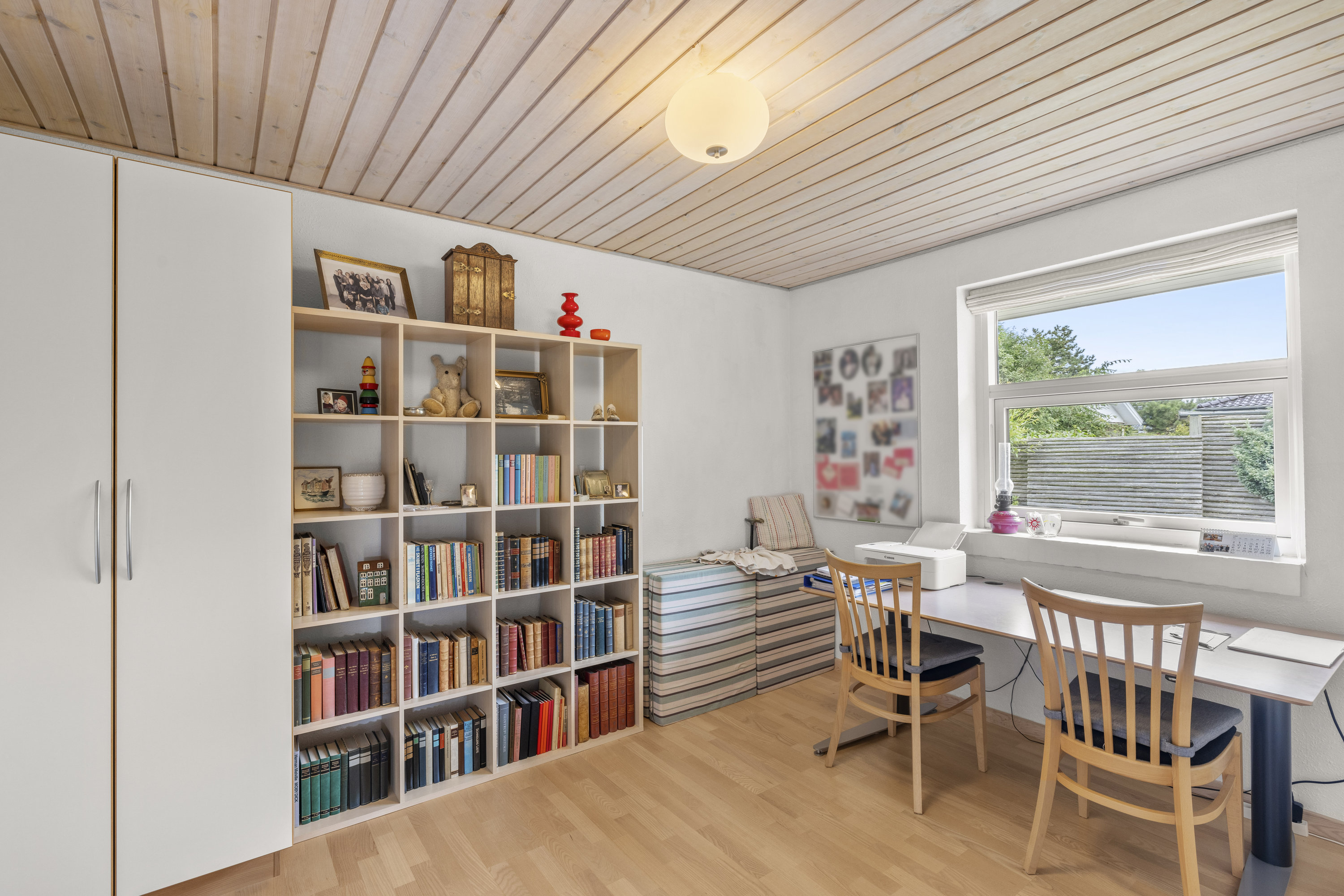 Huset er enkelt, indbydende og båret af den ro, man kun finder i noget, der er blevet passet på gennem mange år. Samme ejer har værnet om hver detalje, og det mærkes i både udtryk og stand. Stuen åbner sig mod haven med en glaskarnap, hvor lyset strømmer ind, og dobbelte franske døre forbinder rummet med køkken-alrummet – husets naturlige samlingspunkt. Det hvide køkken er lyst og åbent, med halvmur mod spisebordet, så samtalen flyder frit, mens madlavningen får lov at tage tid. Fra spisepladsen er der direkte udgang til haven, og her opløses grænsen mellem inde og ude, når døren står åben og sommeren trækker indenfor. Planløsningen er velovervejet med separat forældre- og børneafdeling. Forældresoveværelset ligger afskærmet med eget badeværelse, mens de to øvrige værelser er oplagte som børneværelser, gæsteværelse eller hjemmekontor – afhængig af livet, der leves. Et ekstra badeværelse supplerer, og begge er holdt i lyse klinker og klassisk stil. Overalt er der gulvvarme under de lyse gulve og klinker – en jævn, blid varme, der følger dig fra rum til rum og giver hjemmet en stille komfort.