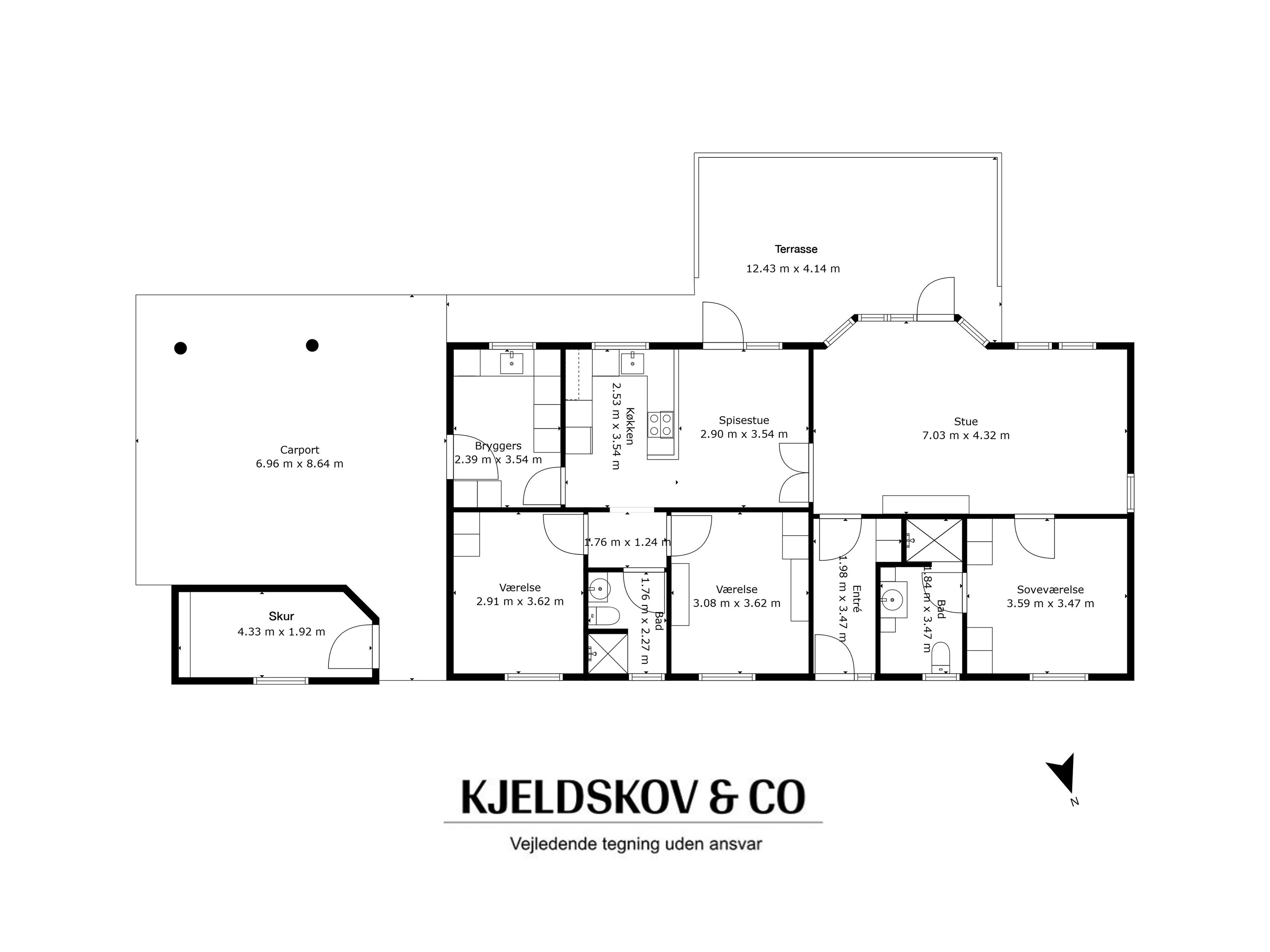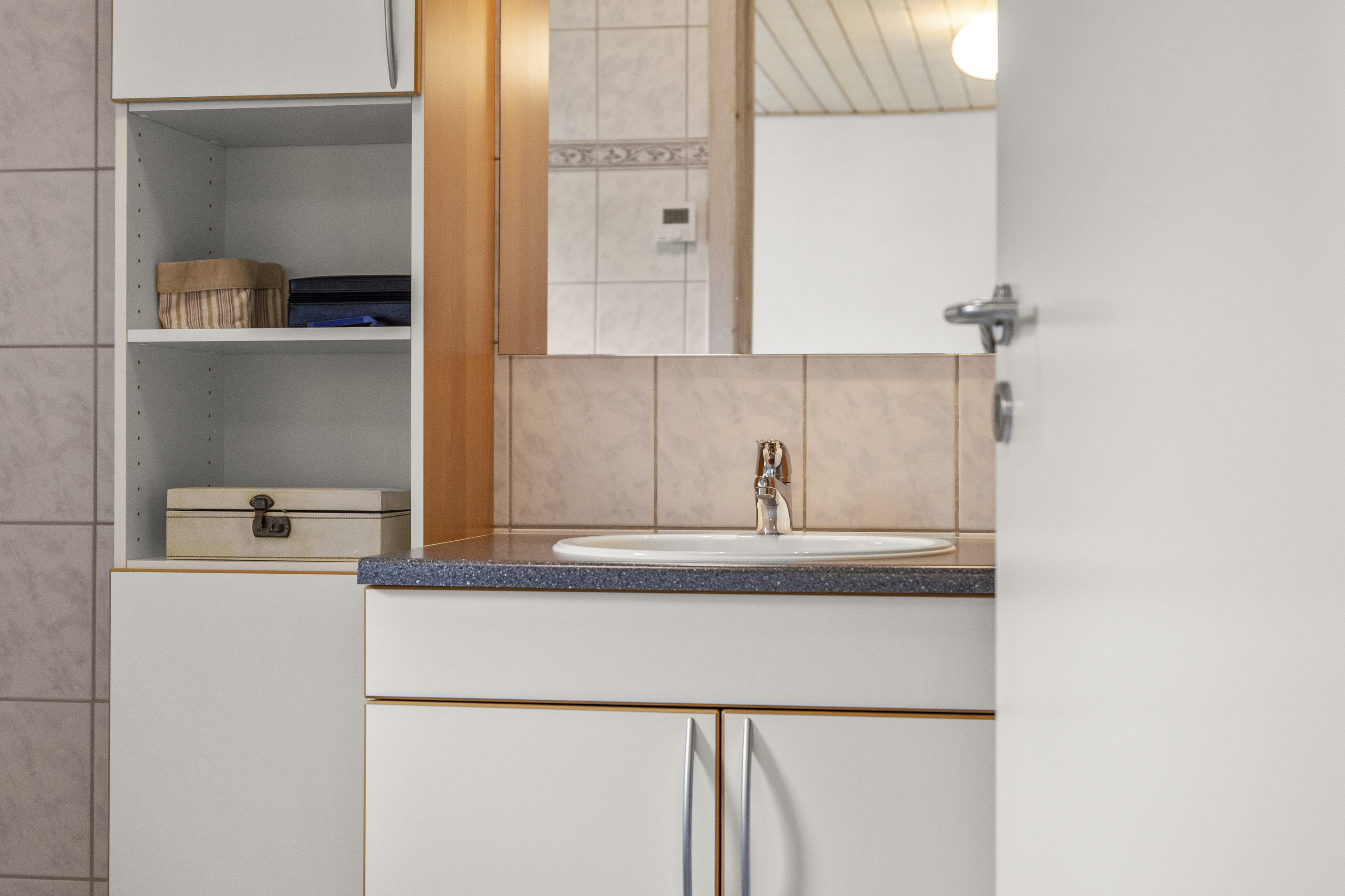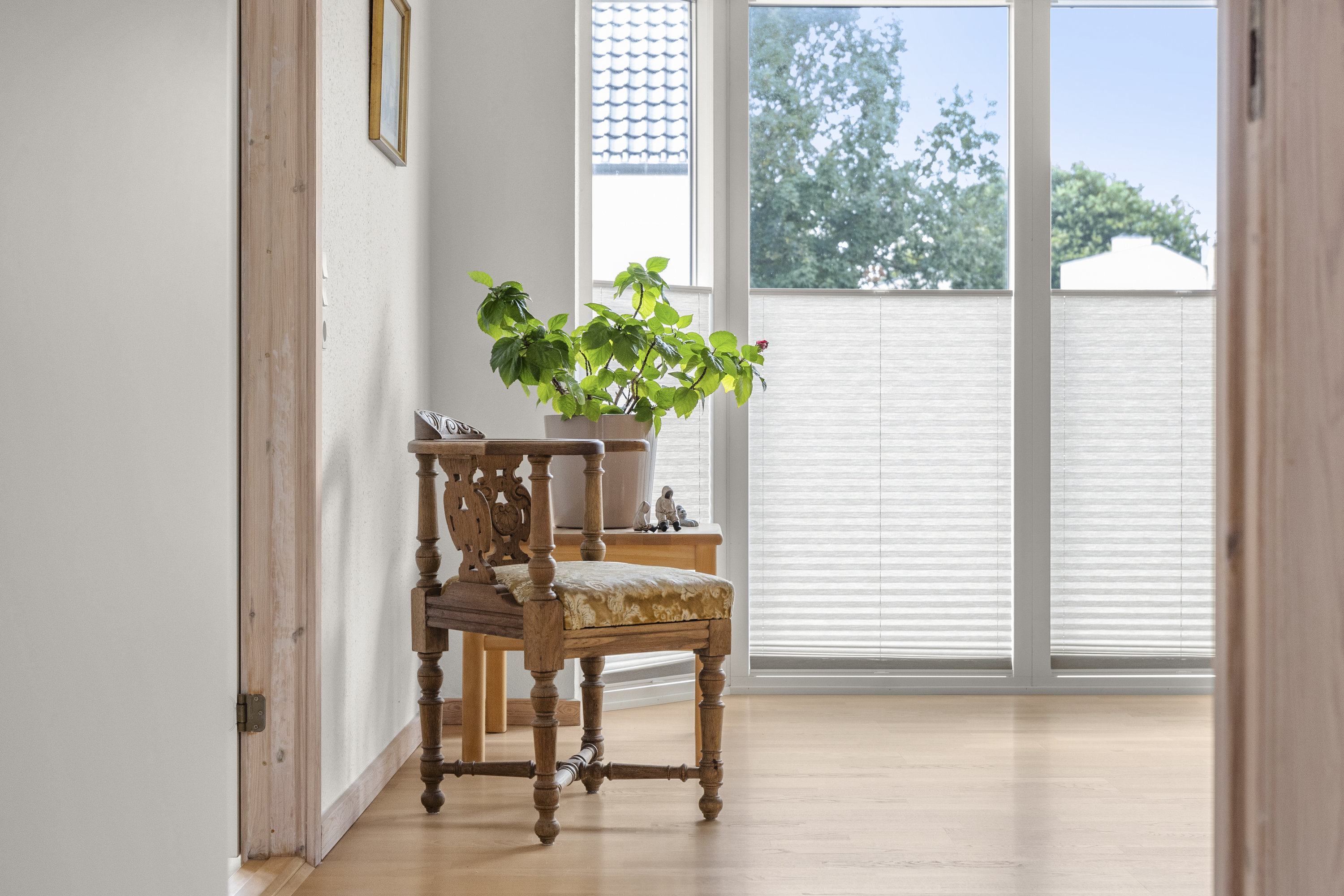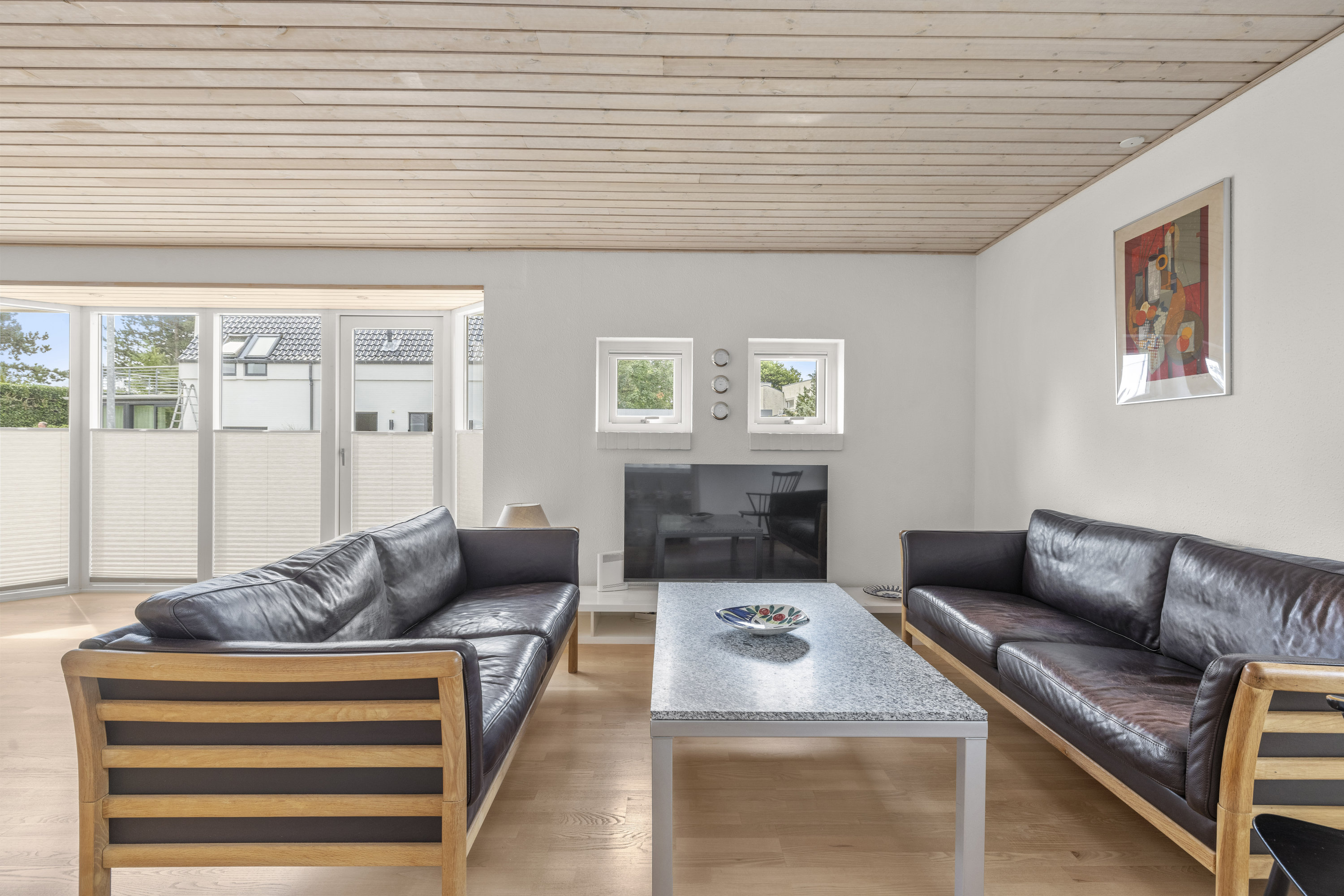 Huset er enkelt, indbydende og båret af den ro, man kun finder i noget, der er blevet passet på gennem mange år. Samme ejer har værnet om hver detalje, og det mærkes i både udtryk og stand. Stuen åbner sig mod haven med en glaskarnap, hvor lyset strømmer ind, og dobbelte franske døre forbinder rummet med køkken-alrummet – husets naturlige samlingspunkt. Det hvide køkken er lyst og åbent, med halvmur mod spisebordet, så samtalen flyder frit, mens madlavningen får lov at tage tid. Fra spisepladsen er der direkte udgang til haven, og her opløses grænsen mellem inde og ude, når døren står åben og sommeren trækker indenfor. Planløsningen er velovervejet med separat forældre- og børneafdeling. Forældresoveværelset ligger afskærmet med eget badeværelse, mens de to øvrige værelser er oplagte som børneværelser, gæsteværelse eller hjemmekontor – afhængig af livet, der leves. Et ekstra badeværelse supplerer, og begge er holdt i lyse klinker og klassisk stil. Overalt er der gulvvarme under de lyse gulve og klinker – en jævn, blid varme, der følger dig fra rum til rum og giver hjemmet en stille komfort.