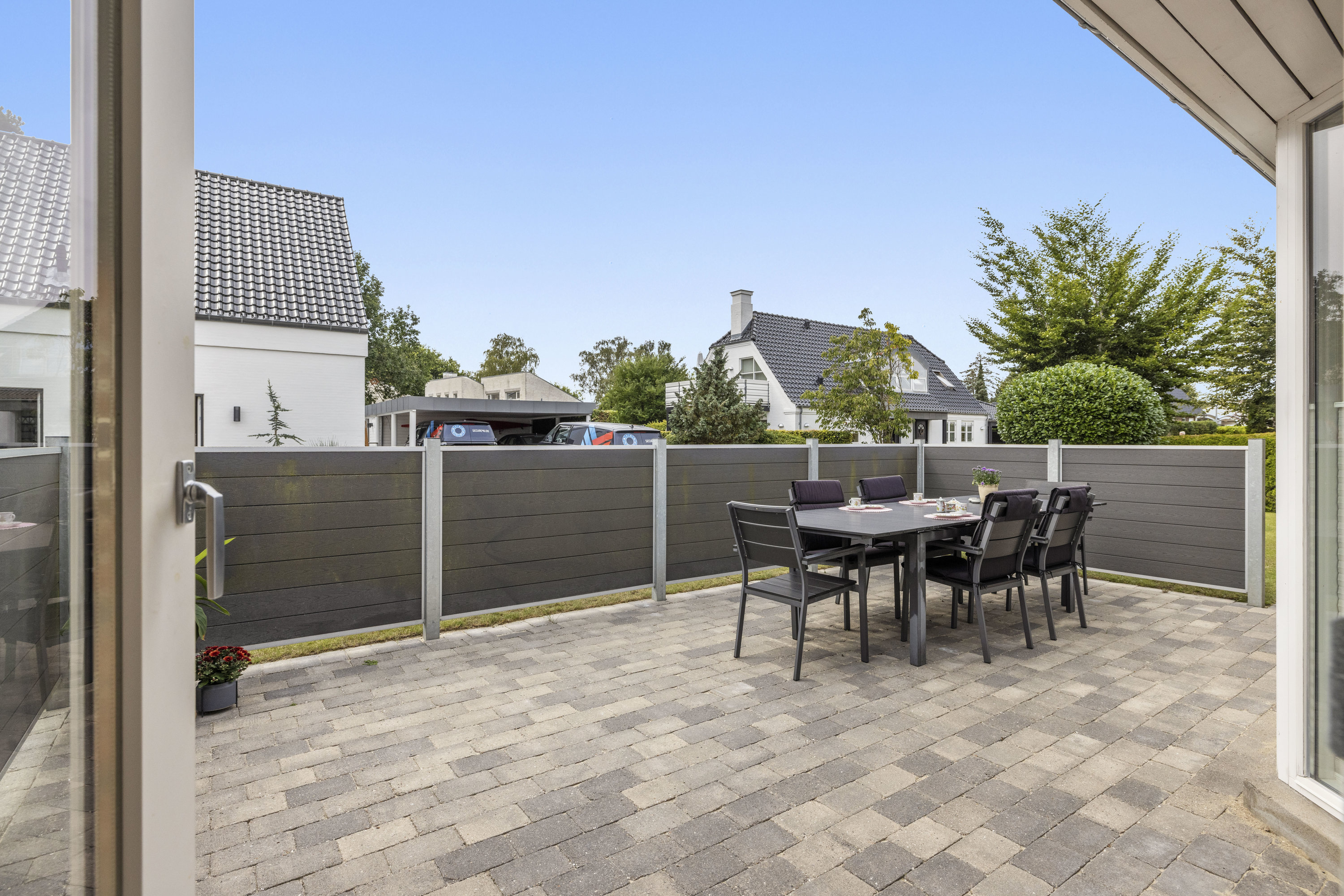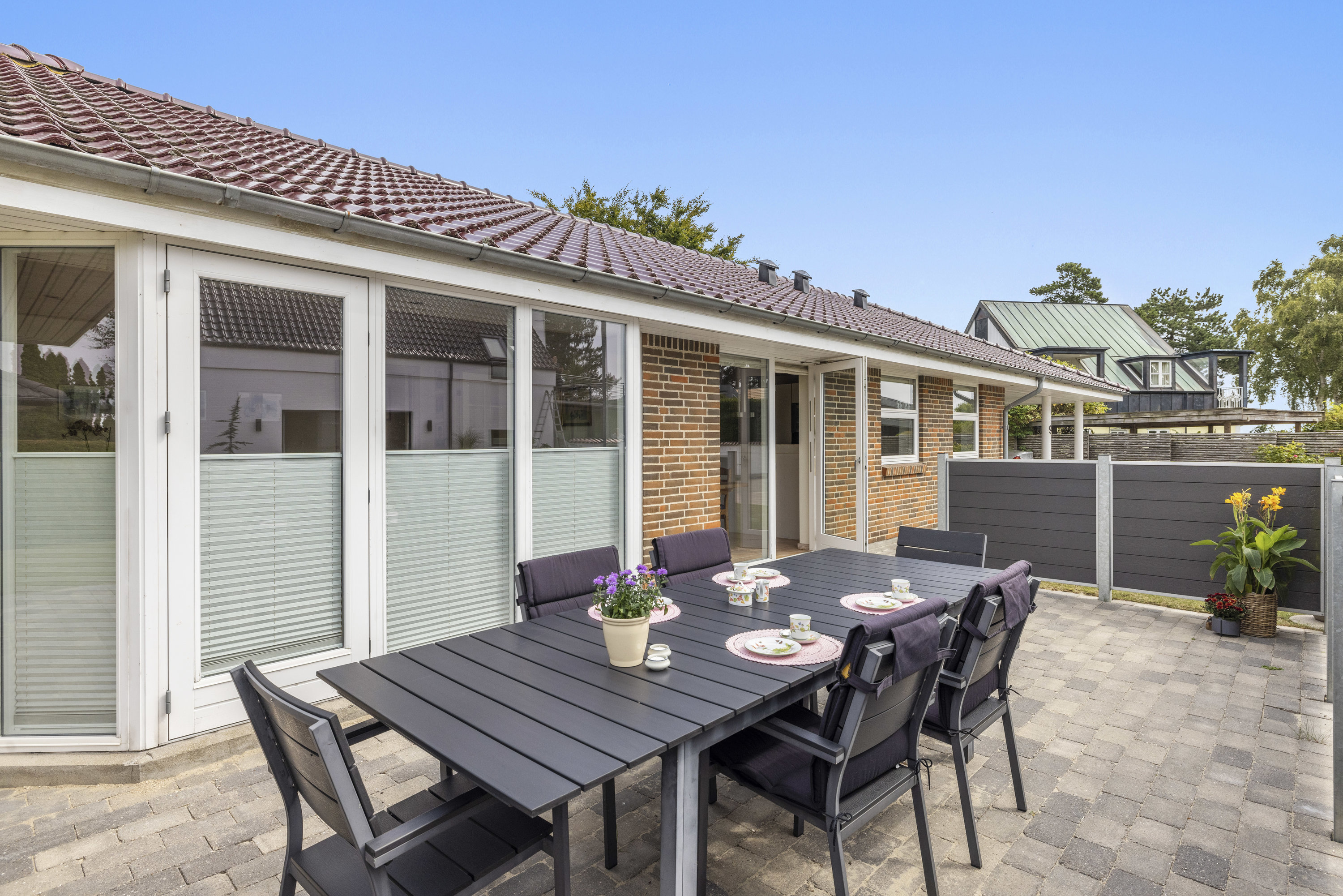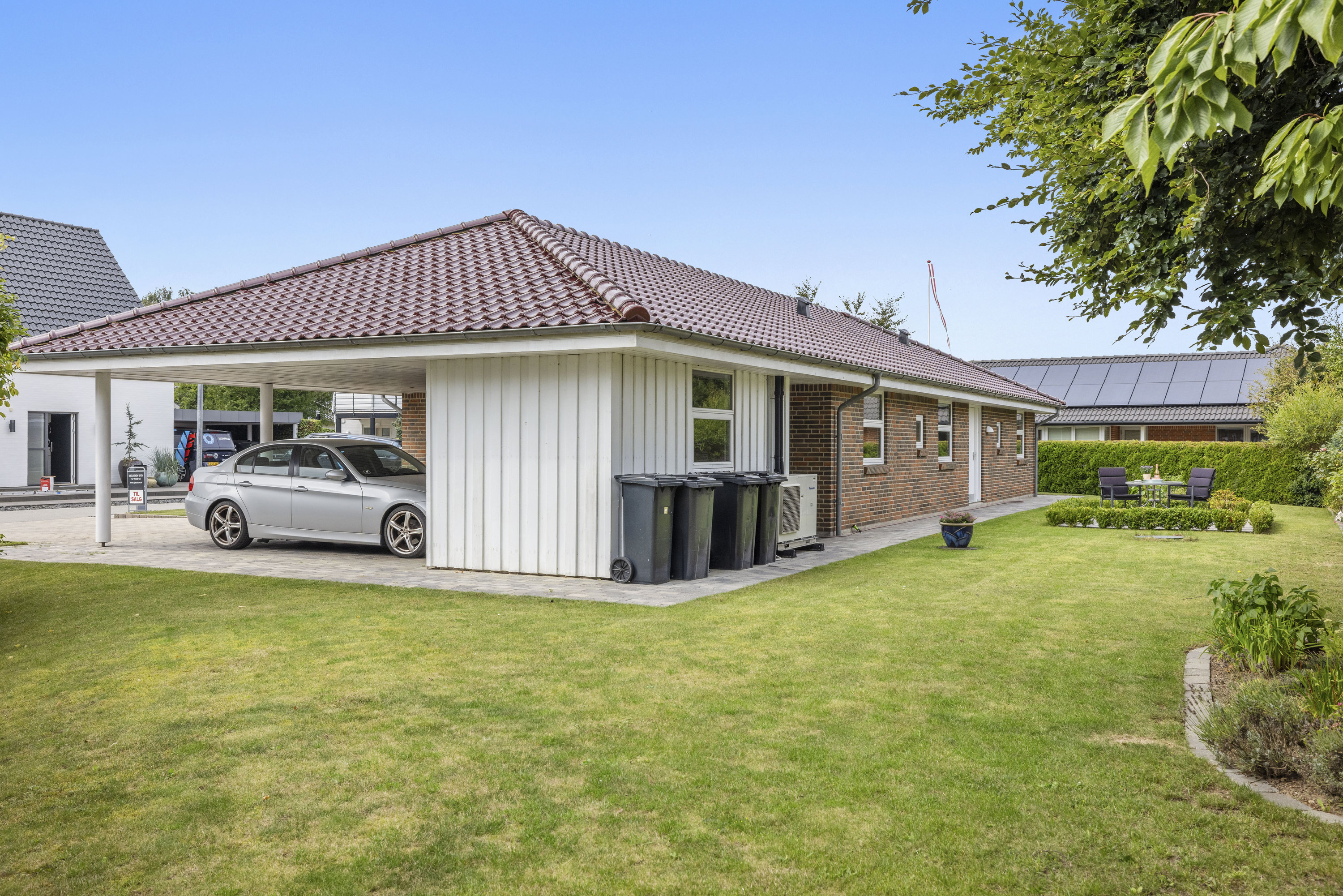 Vejen er tryg og rar, med naboer der nikker, smil der hænger i luften og fuglesang mellem træerne. Gå få skridt mod stranden og nyd morgenens første lys i vandet, året rundt hvis du vil. Padleboardet under armen, kaffe i hånden eller bare en tur i det bløde sand. På den private strandgrund venter bænken – til et glas vin og udsigt mod horisonten. Tæt ved begynder Trylleskoven og mosen med stier, stilhed og mulighed for at forsvinde lidt fra det hele. Haven vender mod solen, og lyset er med dig hele dagen. Her er fliseterrasser til måltider under åben himmel, samtaler der varer lidt længere, og aftener med grillen tændt og duften af sommer i luften. Plænen giver plads til leg og solsenge, og krukker med lavendler, græsser og blomster kan skabe stemning og bevægelse i vinden. En parasol slår skygge ud over frokosten, og det hele føles let og uforstyrret. Her er også dobbelt carport og udhus – begge under husets tag med direkte adgang til bryggerset, så hverdagen glider let, også når regnen trommer på taget.
