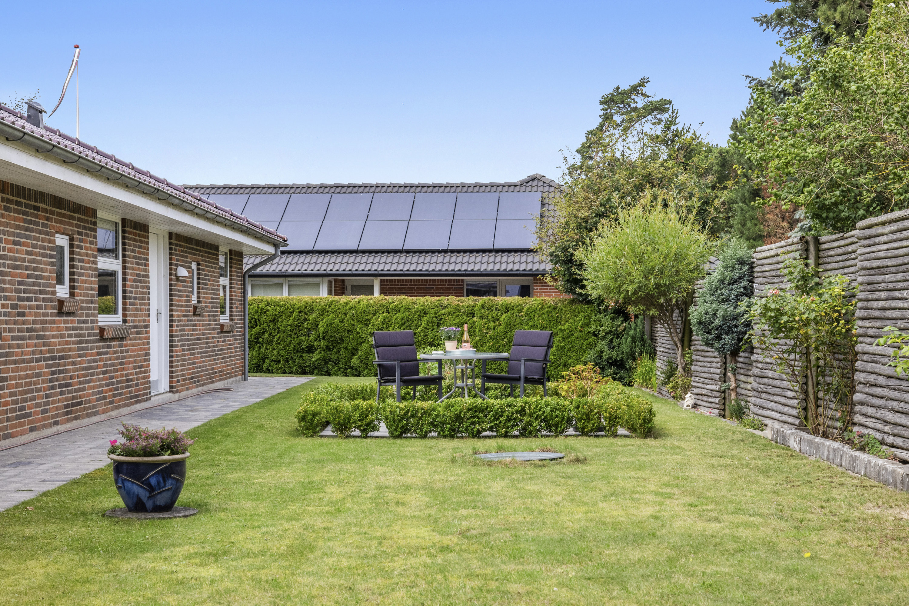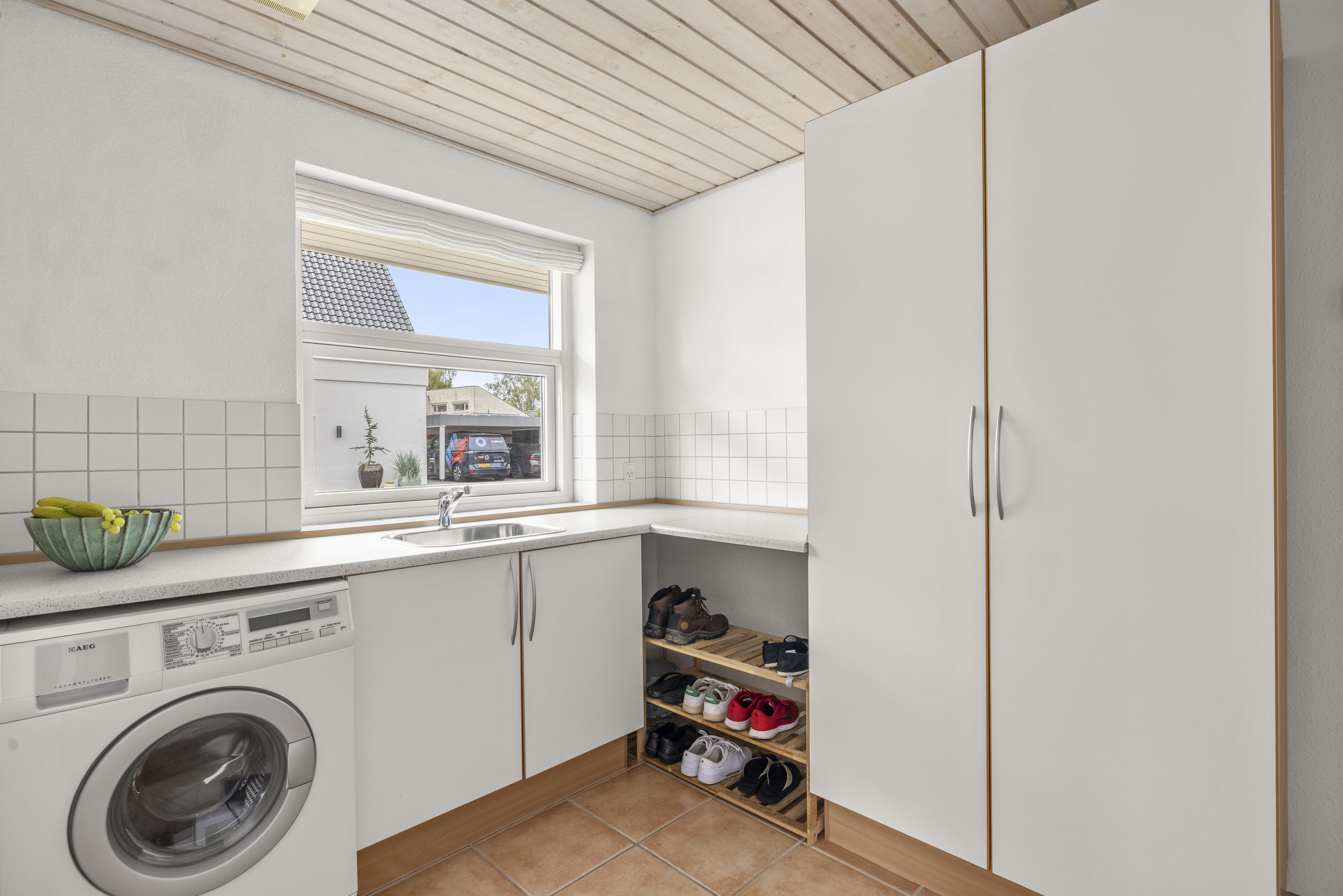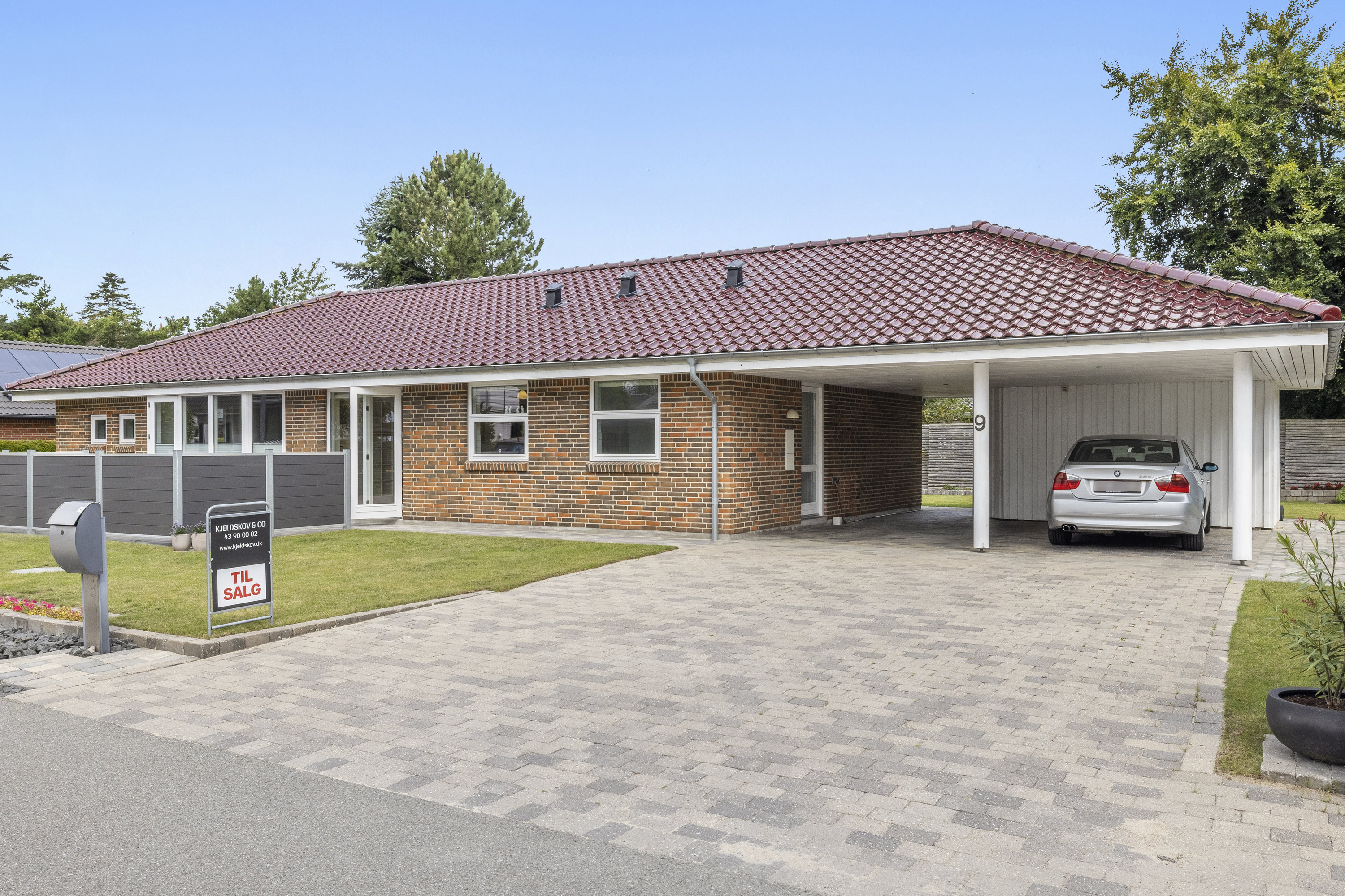 Vejen er tryg og rar, med naboer der nikker, smil der hænger i luften og fuglesang mellem træerne. Gå få skridt mod stranden og nyd morgenens første lys i vandet, året rundt hvis du vil. Padleboardet under armen, kaffe i hånden eller bare en tur i det bløde sand. På den private strandgrund venter bænken – til et glas vin og udsigt mod horisonten. Tæt ved begynder Trylleskoven og mosen med stier, stilhed og mulighed for at forsvinde lidt fra det hele. Haven vender mod solen, og lyset er med dig hele dagen. Her er fliseterrasser til måltider under åben himmel, samtaler der varer lidt længere, og aftener med grillen tændt og duften af sommer i luften. Plænen giver plads til leg og solsenge, og krukker med lavendler, græsser og blomster kan skabe stemning og bevægelse i vinden. En parasol slår skygge ud over frokosten, og det hele føles let og uforstyrret. Her er også dobbelt carport og udhus – begge under husets tag med direkte adgang til bryggerset, så hverdagen glider let, også når regnen trommer på taget.